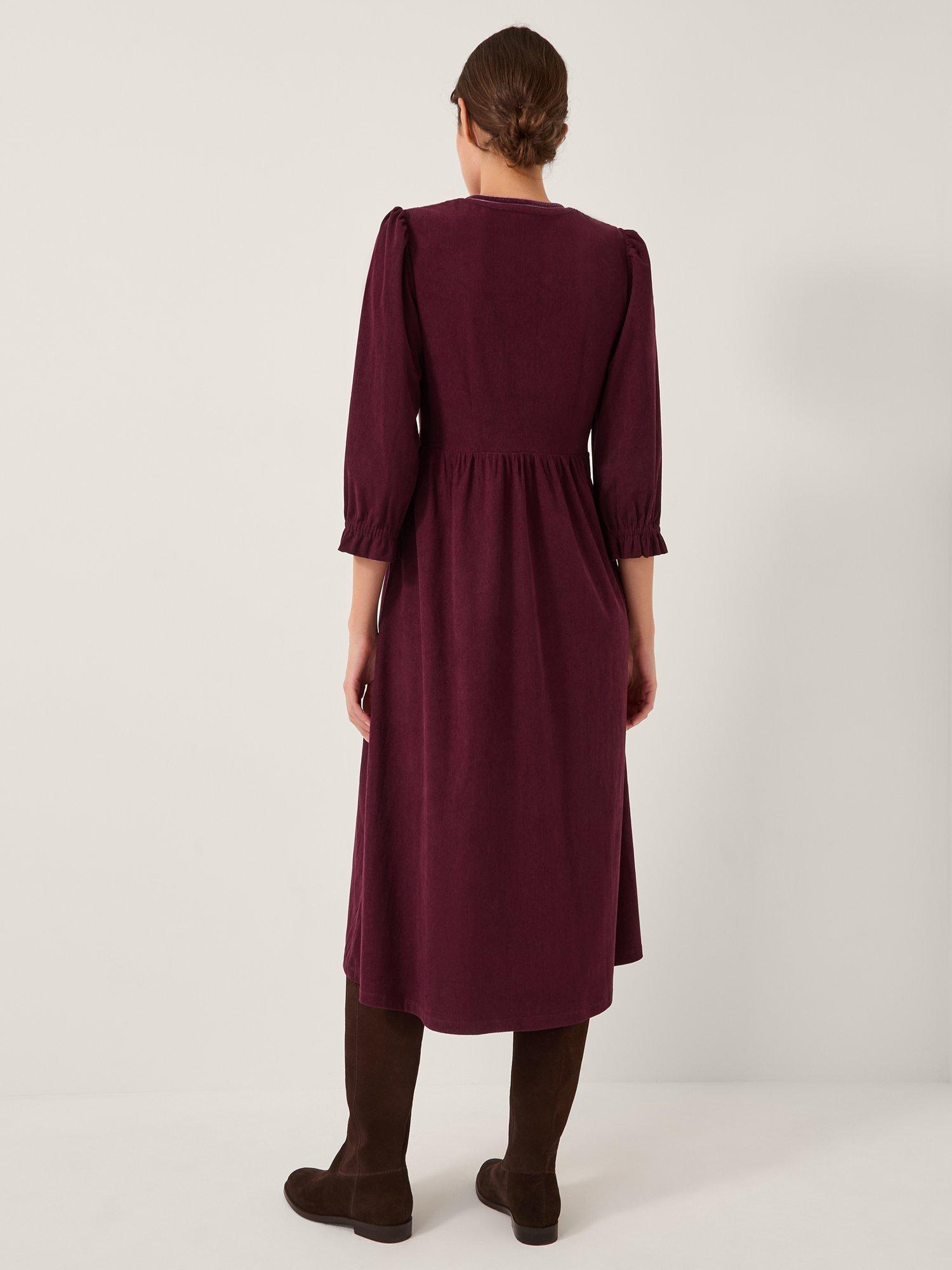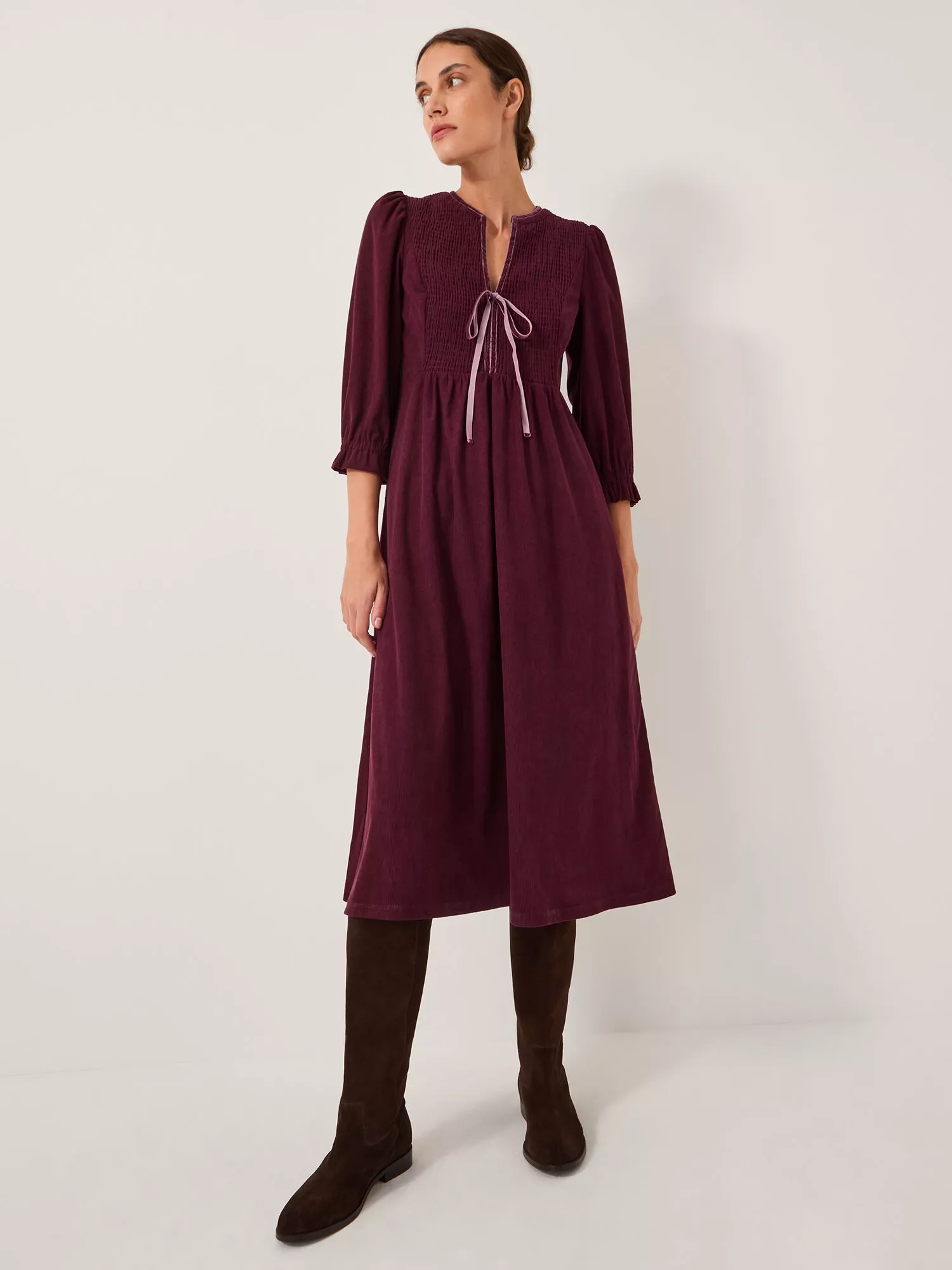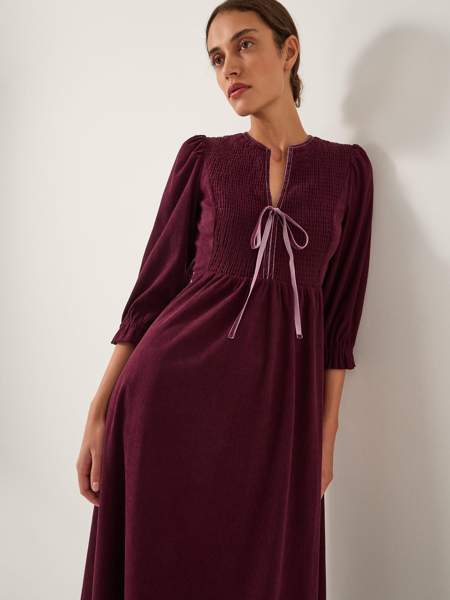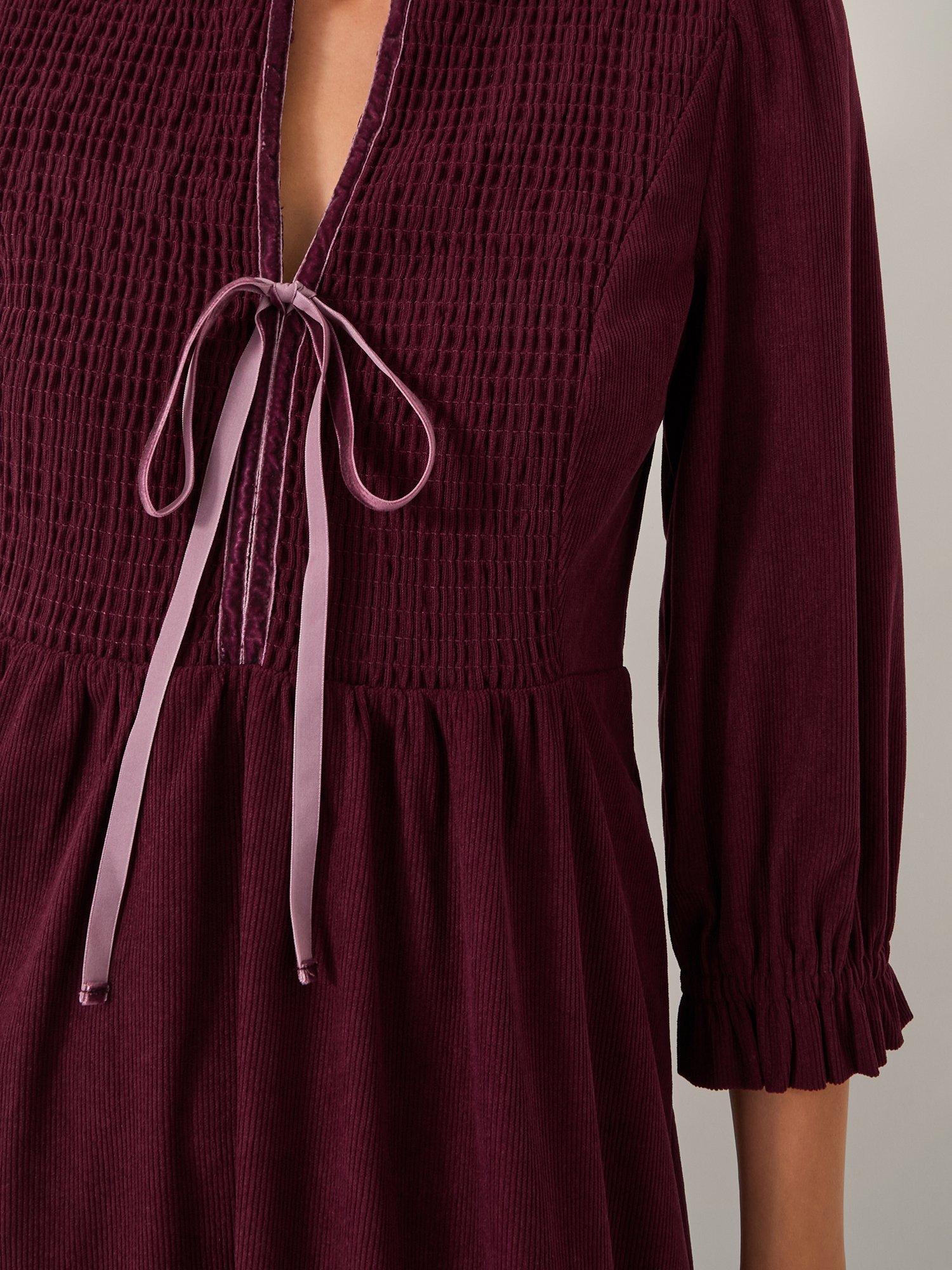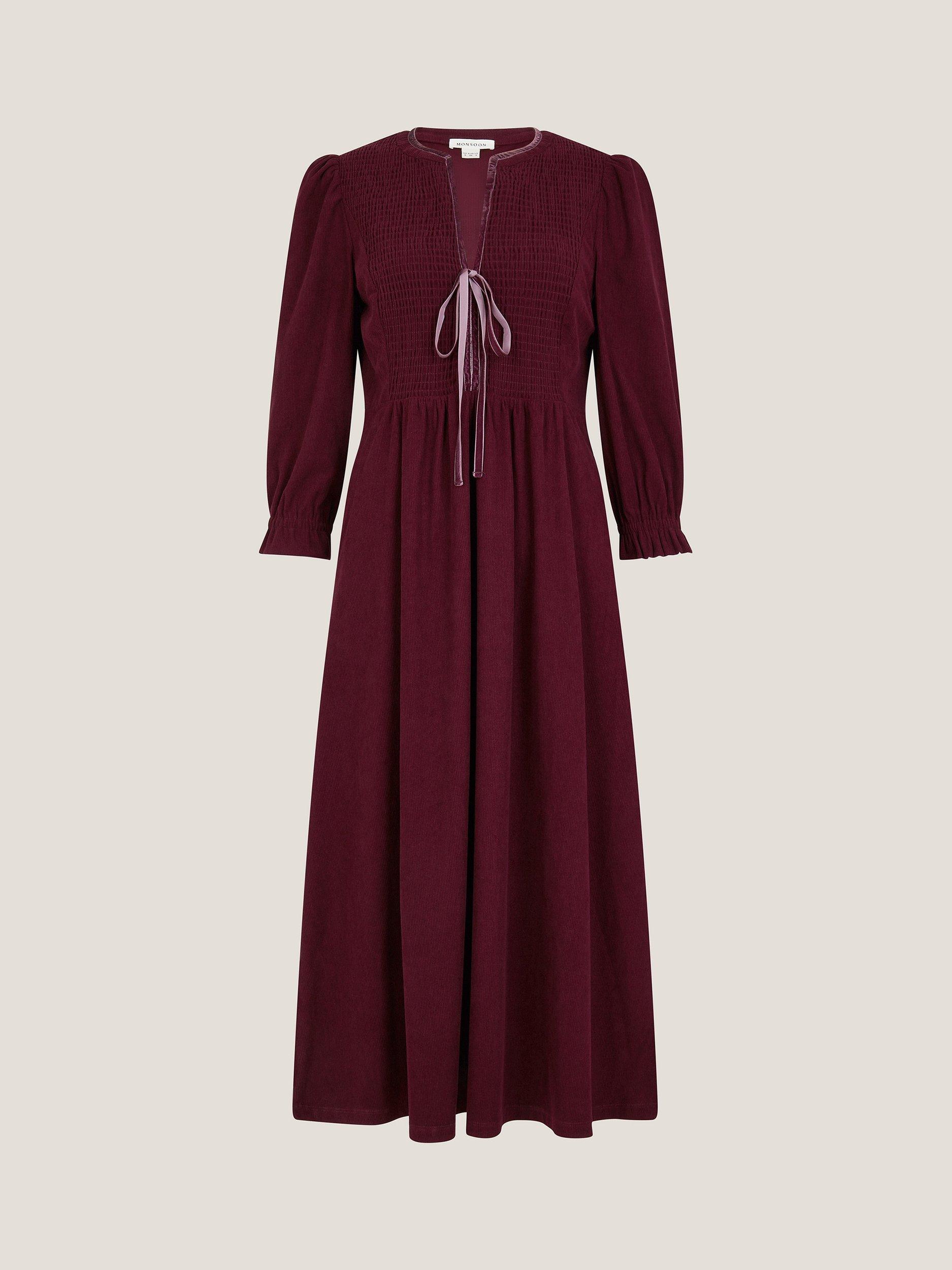 Designed in classic corduroy and falling to a midi length, this dress is finished with a smocked bodice, frilly sleeves, and tie detailing to the front.