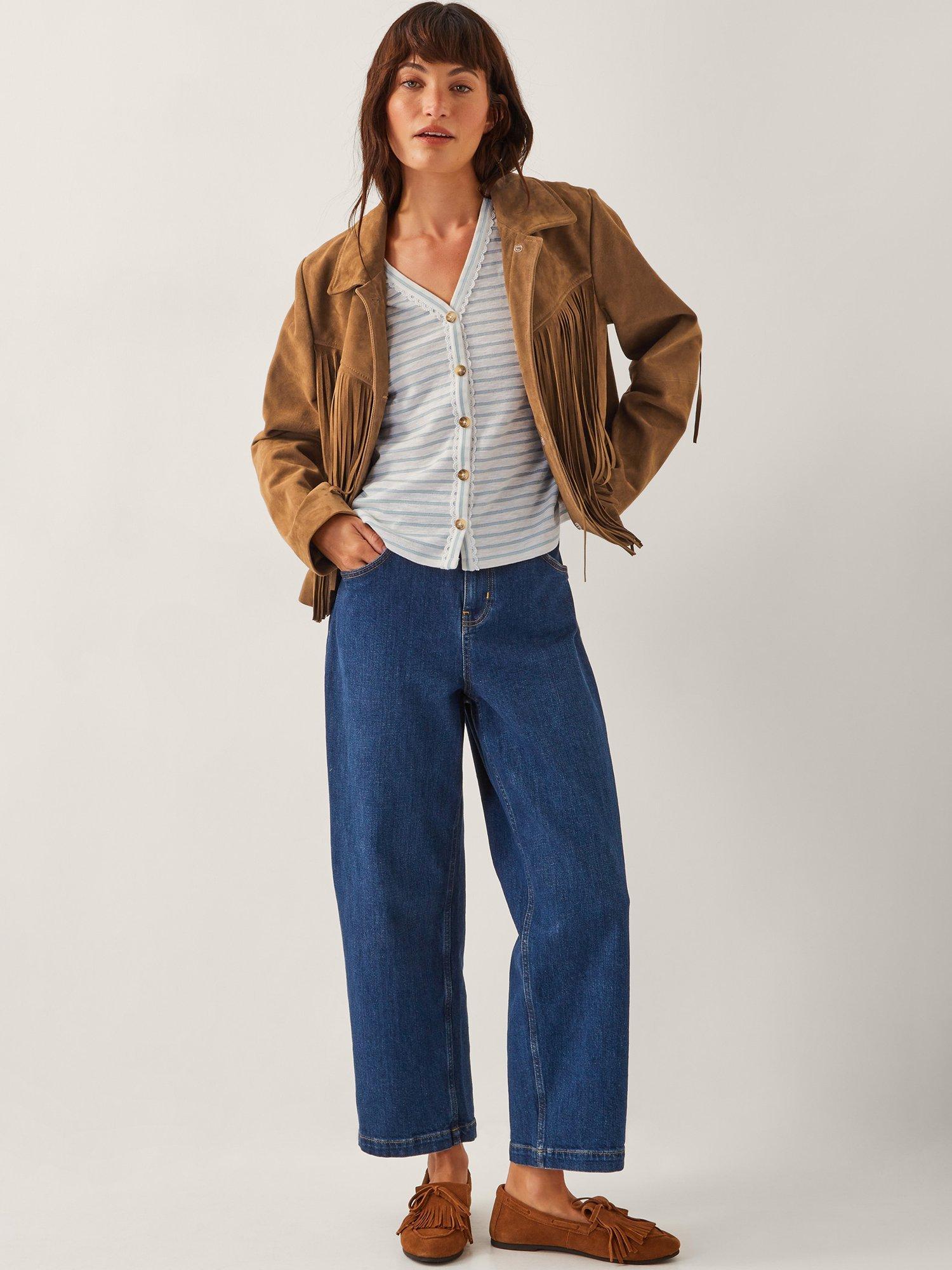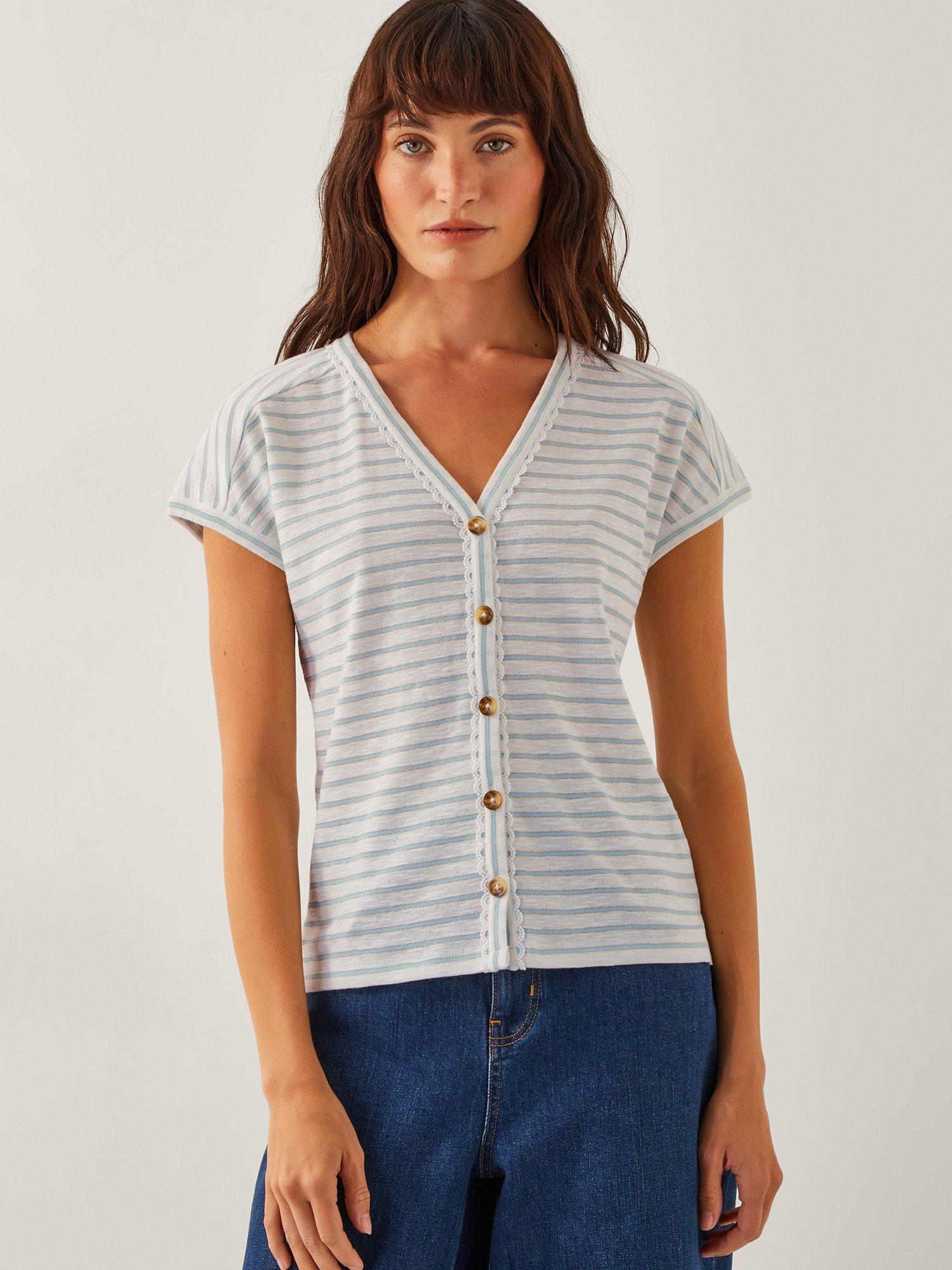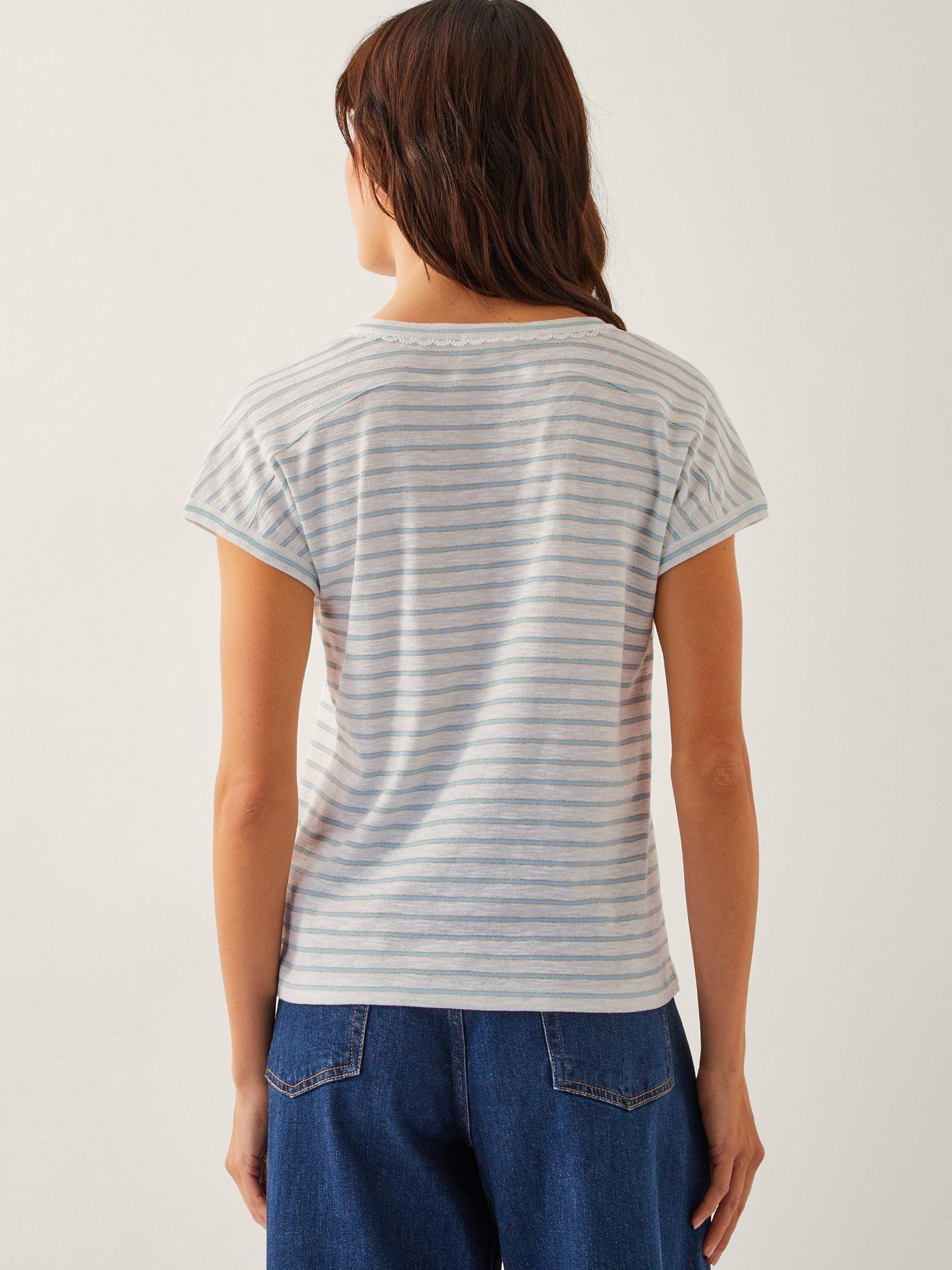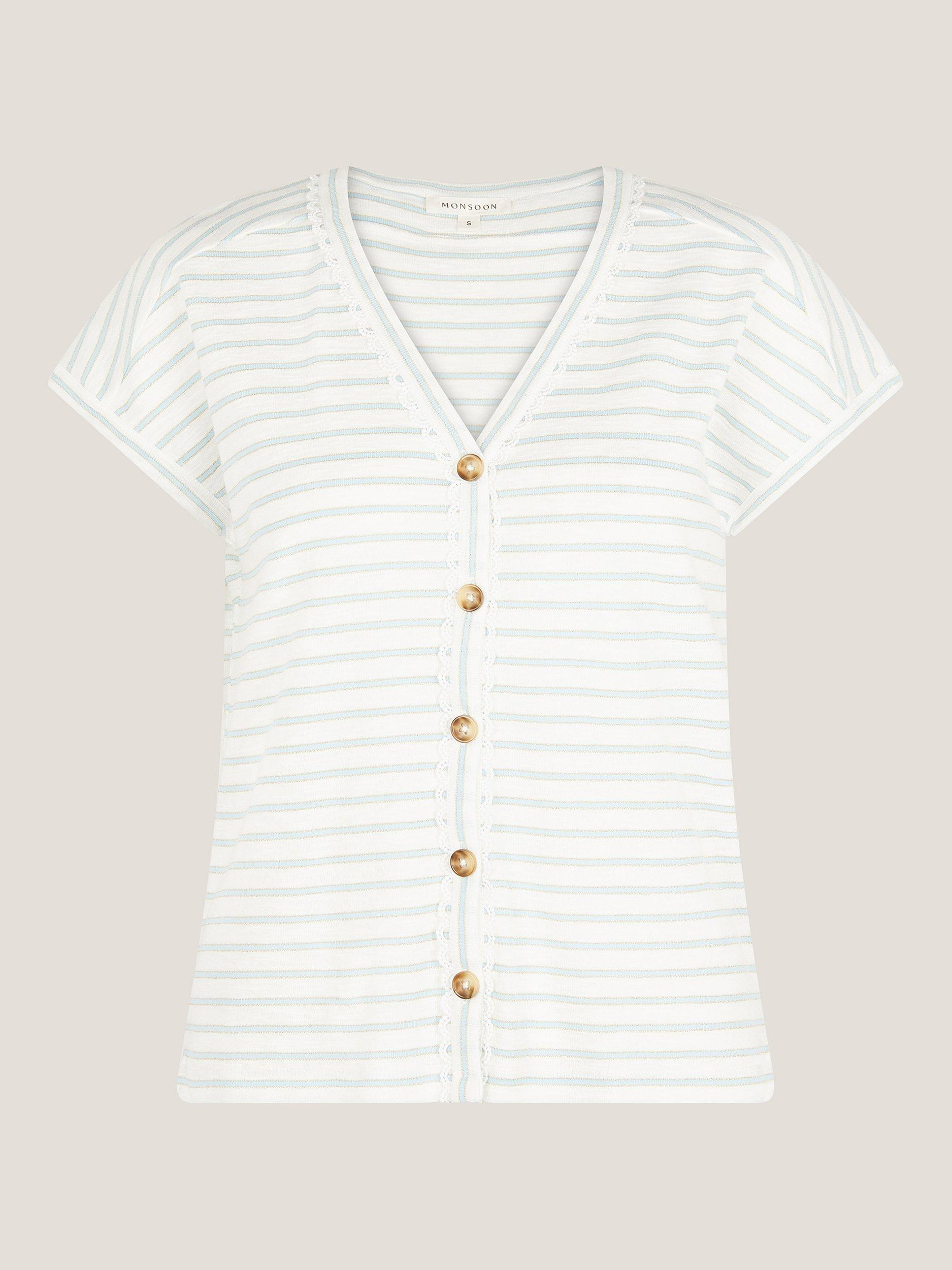 The essentials, but elevated. Showcasing subtly glittered stripes, this T-shirt is designed with a V-neckline and scalloped lace framing the front button details. Style with your go-to jeans and favourite loafers for a casual weekend look.