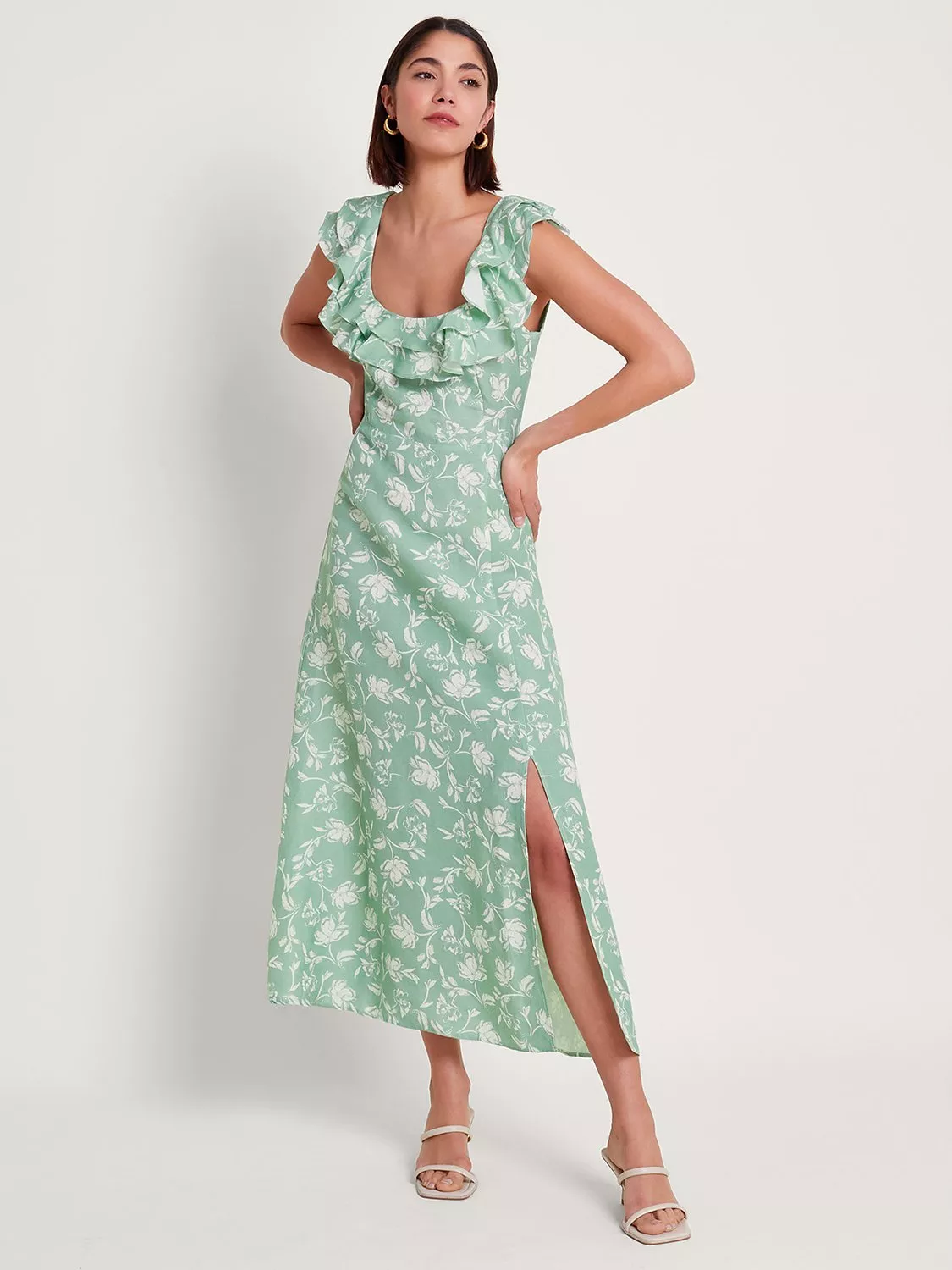 Designed in a fuss-free A-line style with a deep thigh slit, this midi dress from Monsoon is dreamt up from a light linen blend. Versatile with its double ruffle trim scoop neckline, this style captures a leafy print.