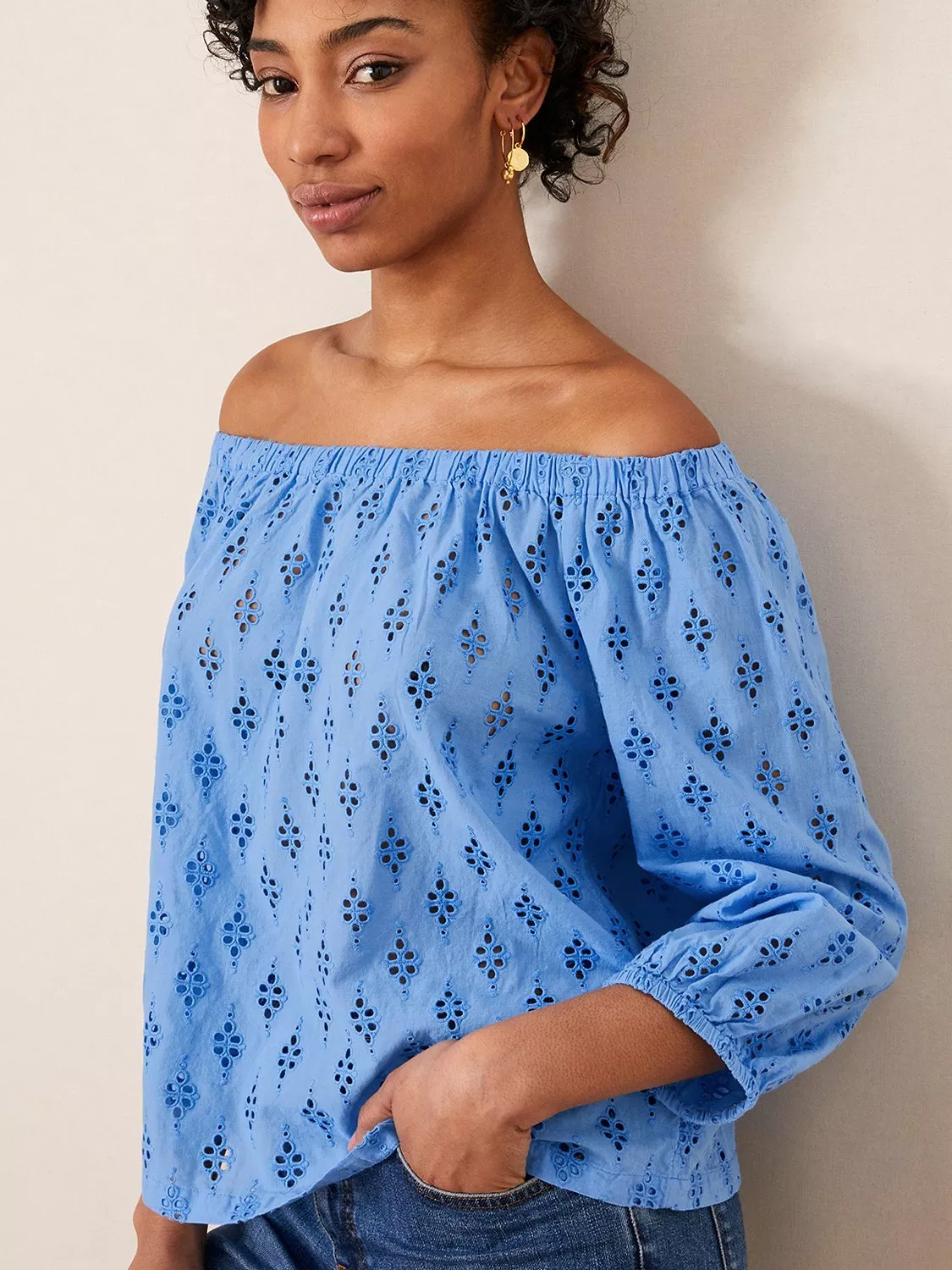 Exposing the shoulders with a dramatic Bardot neckline and three-quarter length sleeves, it's made from soft and breathable cotton and pairs effortlessly with floaty summery skirts for warm days spent with good friends.