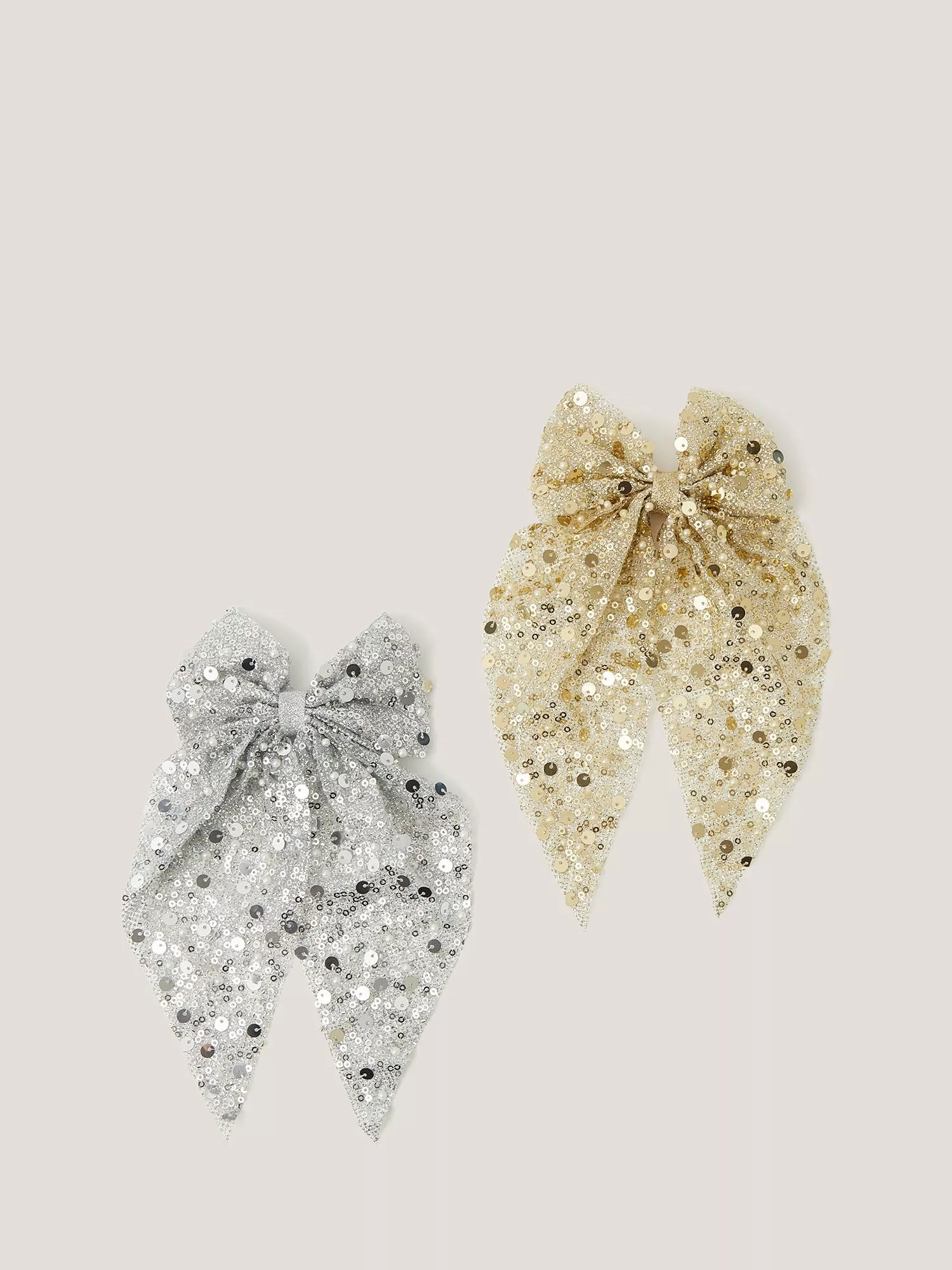 Razzle dazzle. Showcasing perfectly-tied bows and stitched with endless sparkly sequins, these hair clips are the ultimate party accessories. Two included.