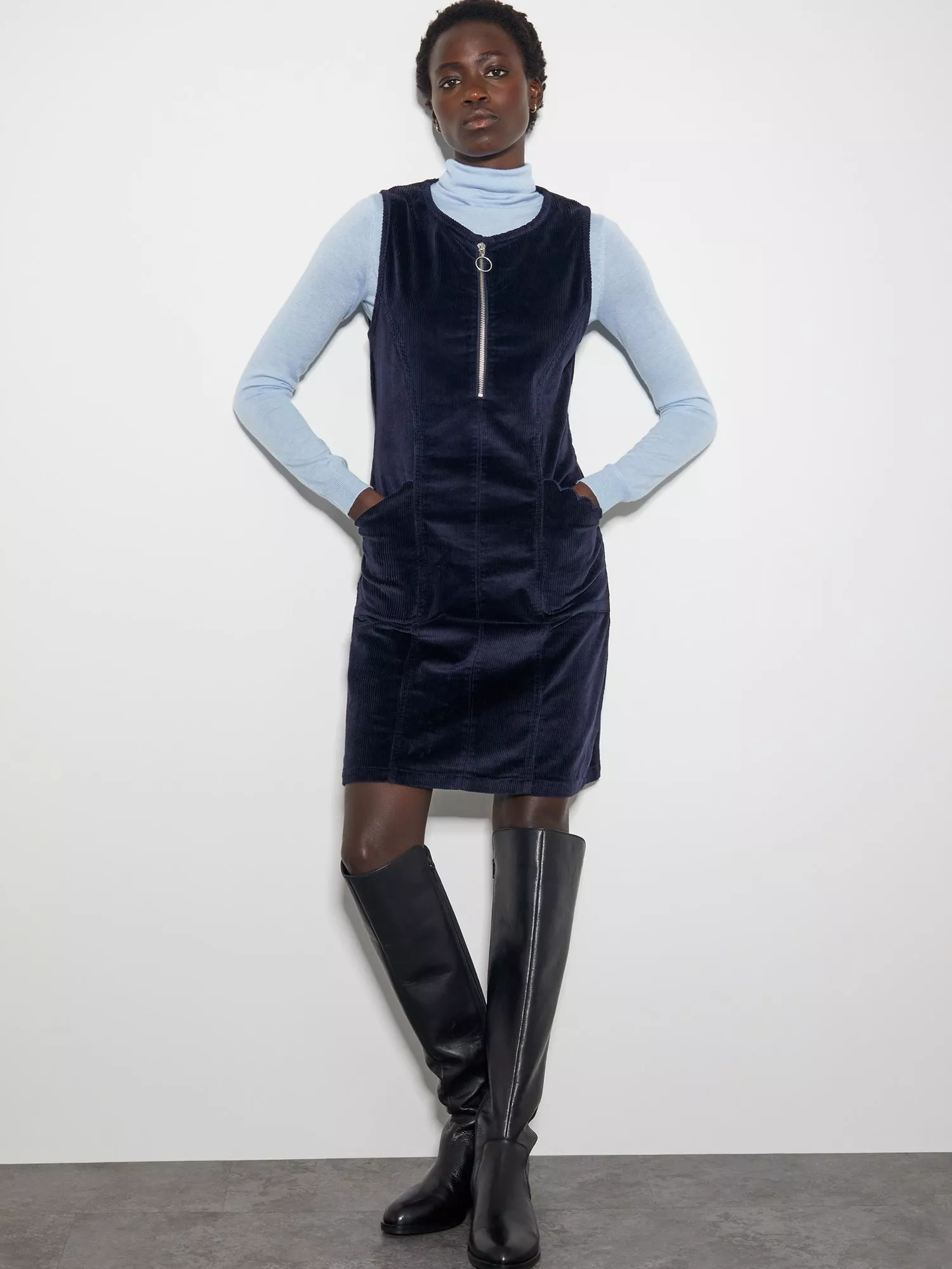 A corduroy pinafore? Must be Autumn! Sitting snuggly on your frame, this dress is finished in a shiny corduroy fabric with a sleeveless bodice, mini skirt, and zip to the front.
