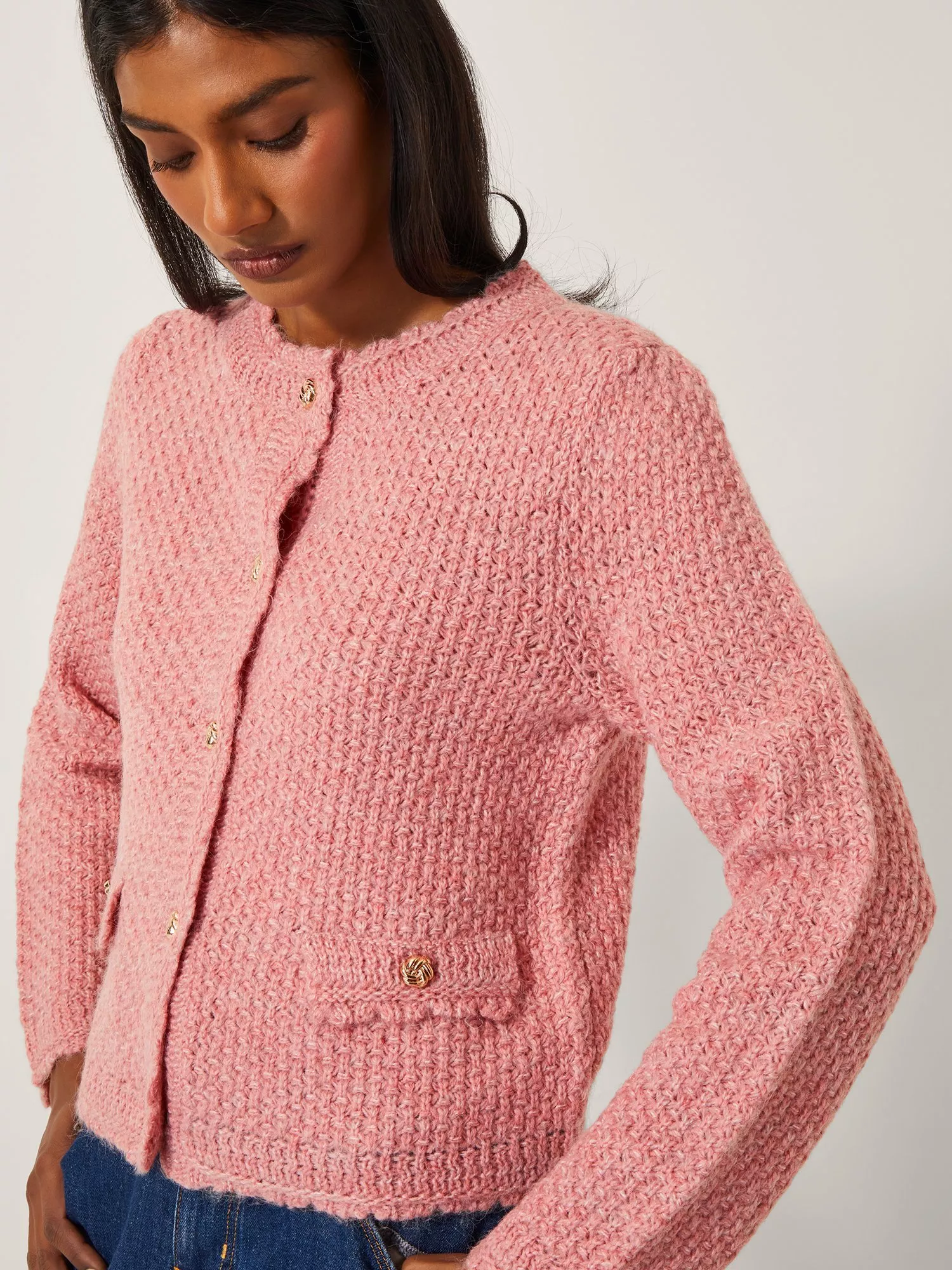 Soft, medium-weight stitch cardigan with a round neck and subtle textured pattern. Long sleeves and an easy button fastening make it practical for work or weekends.