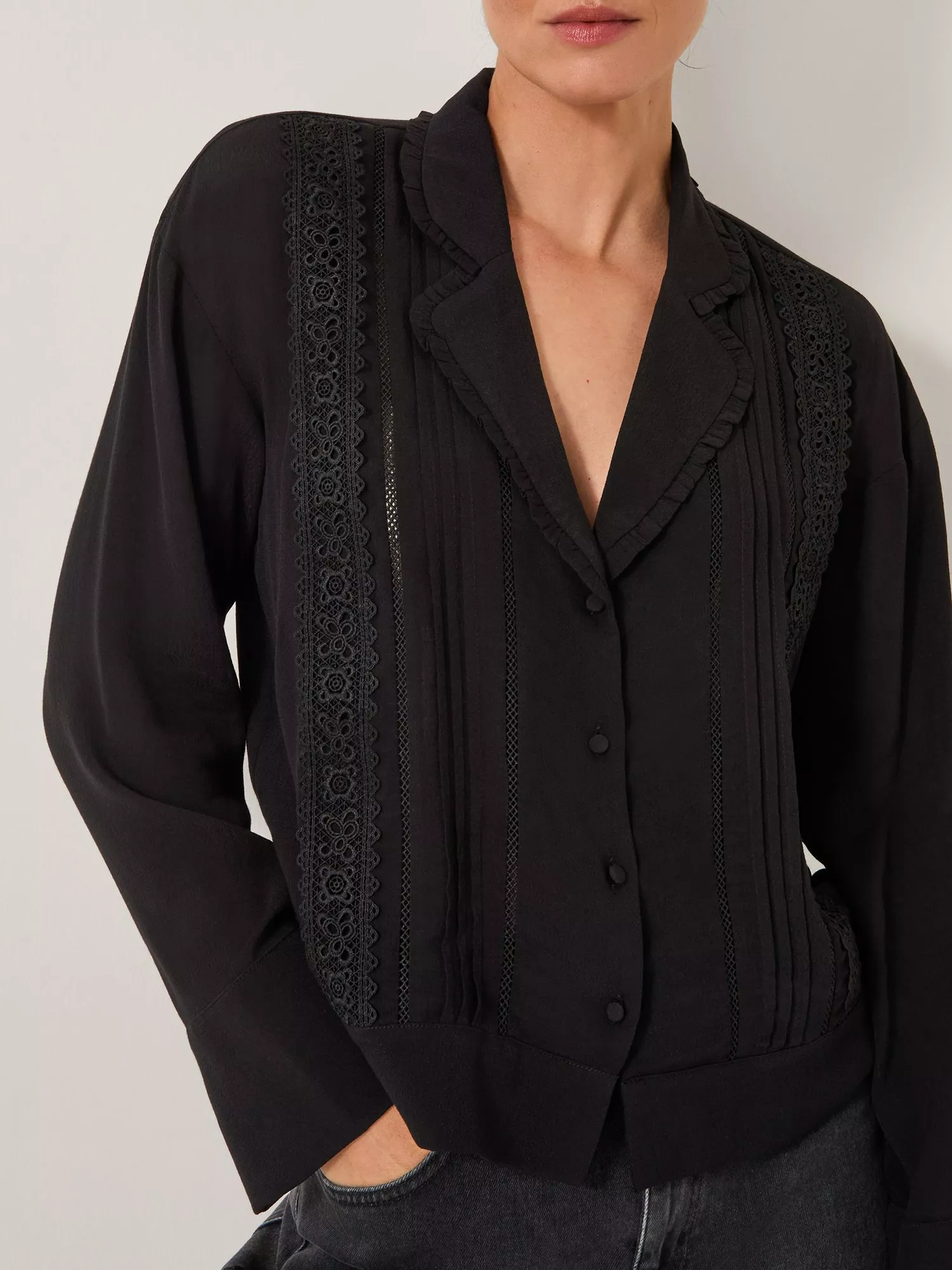 Lightweight and easy to style, this blouse showcases long sleeves, a ruffle collar and intricate lace embroidery. Finished with front button fastenings.