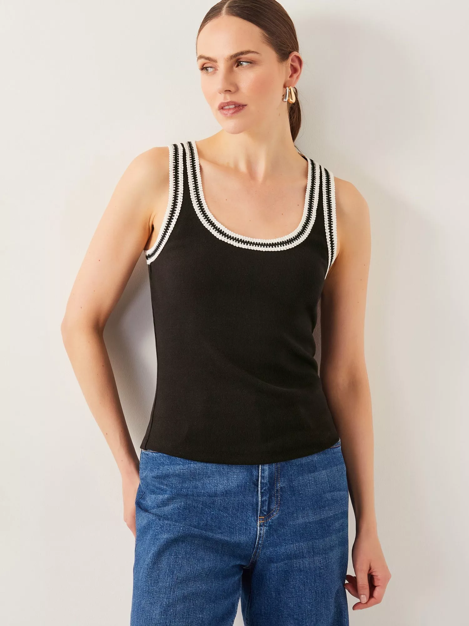 Boho basics. Designed in a classic tank top style with a ribbed jersey finish, it's decorated with crochet-style embroidery around the scoop neckline and sleeveless seams.