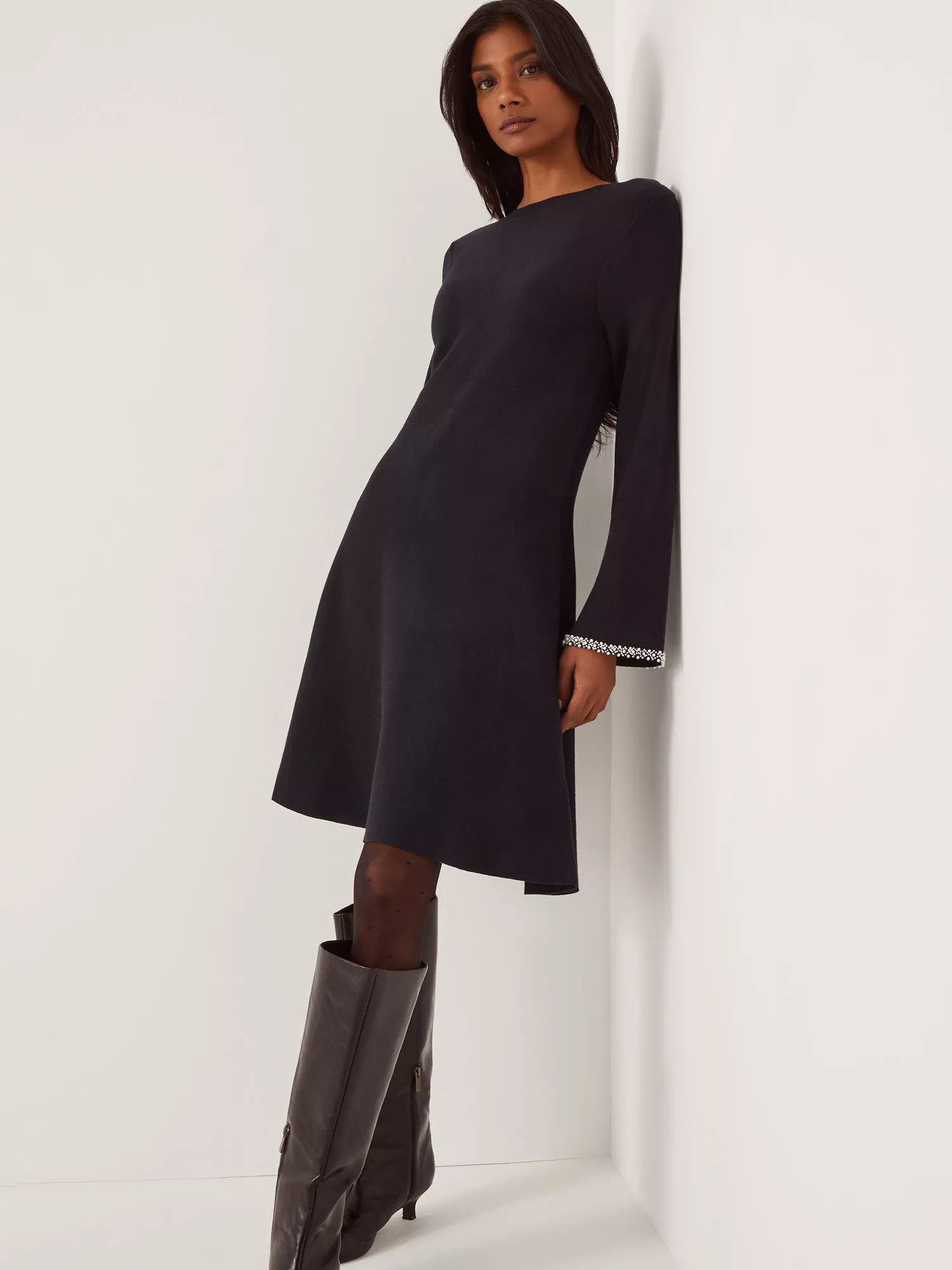 This knee-length skater dress combines a relaxed fit with embellished cuffs. The boat neck keeps things elegant while the soft viscose blend ensures comfort, making whenever you wear it memorable and effortless.