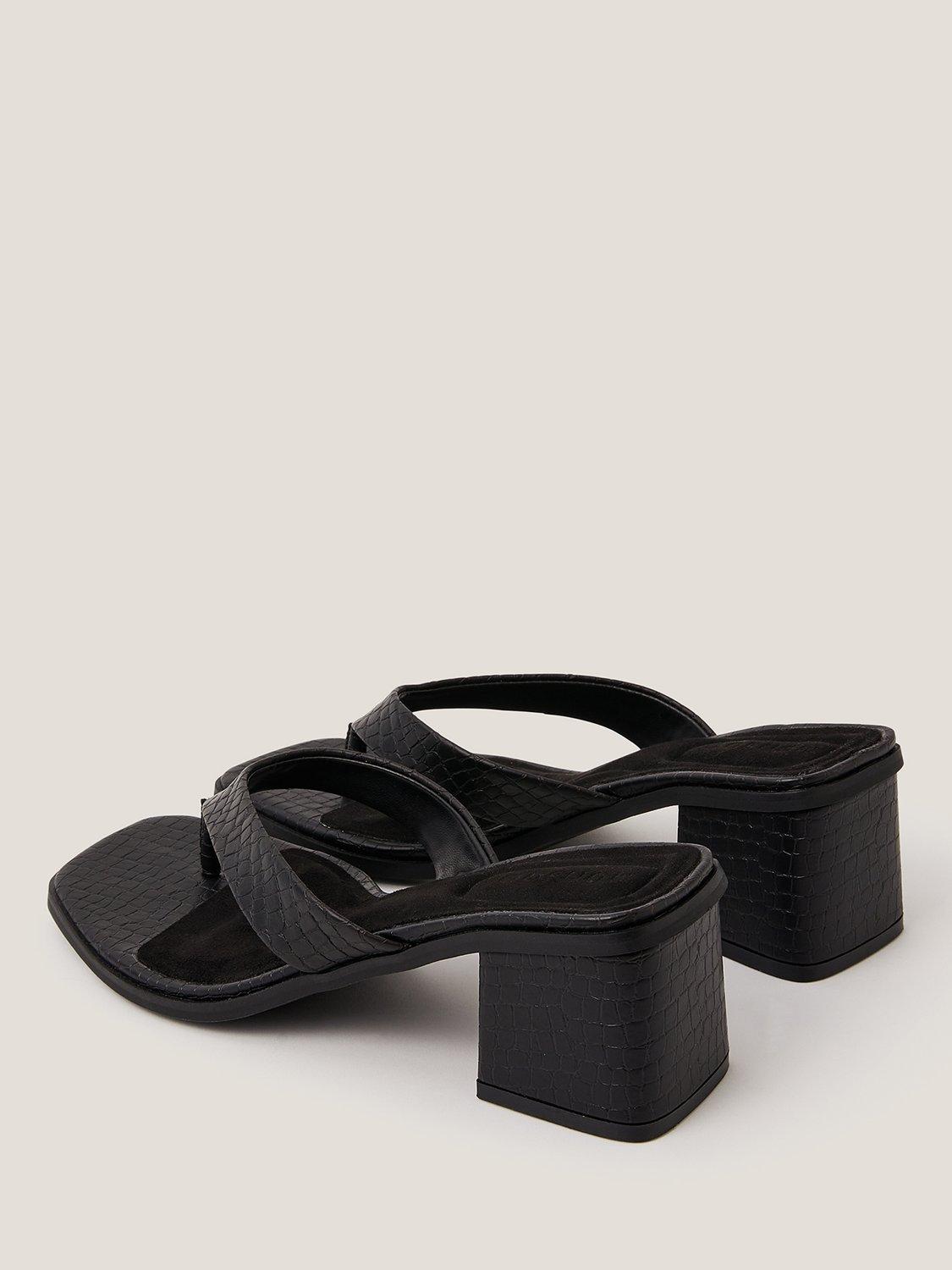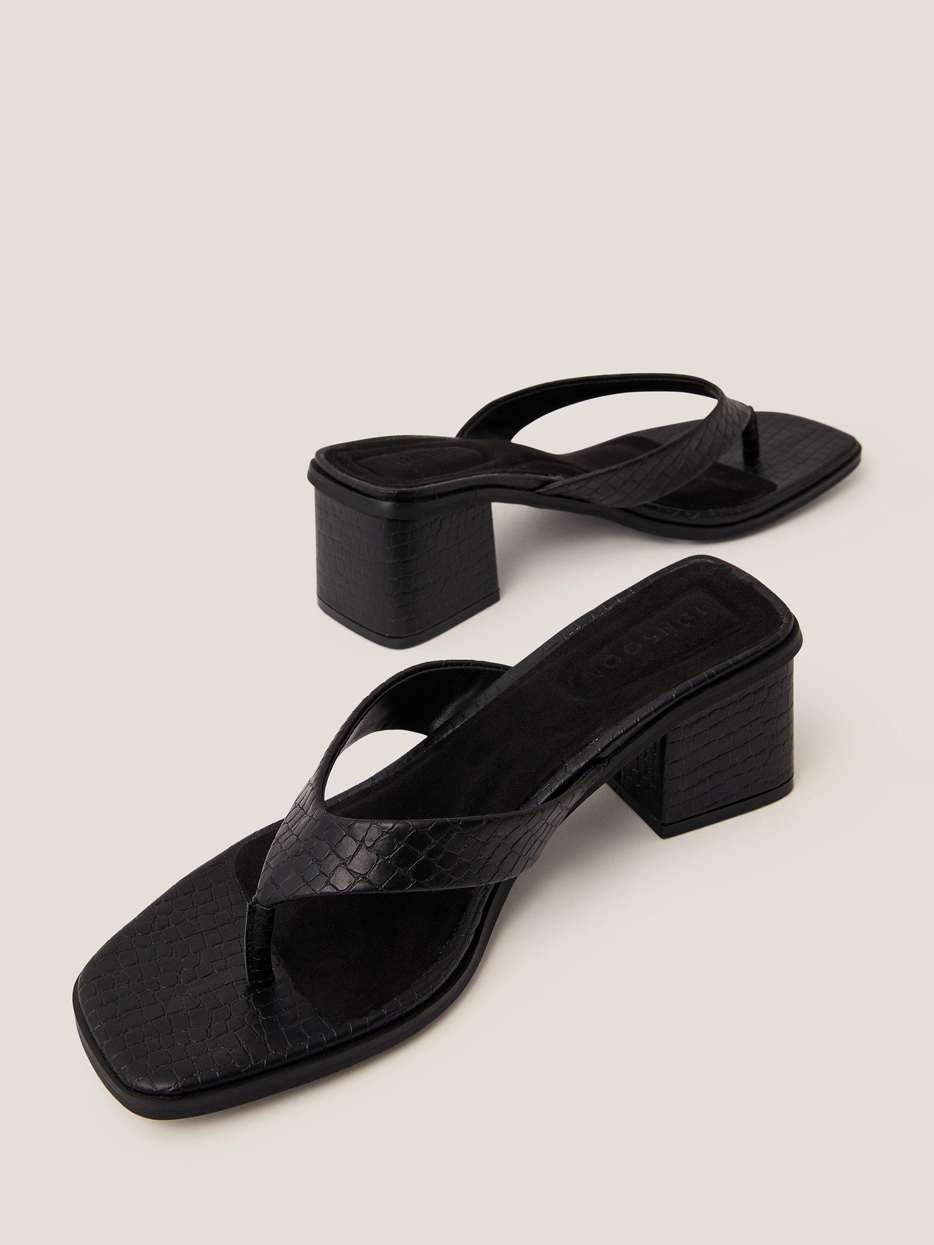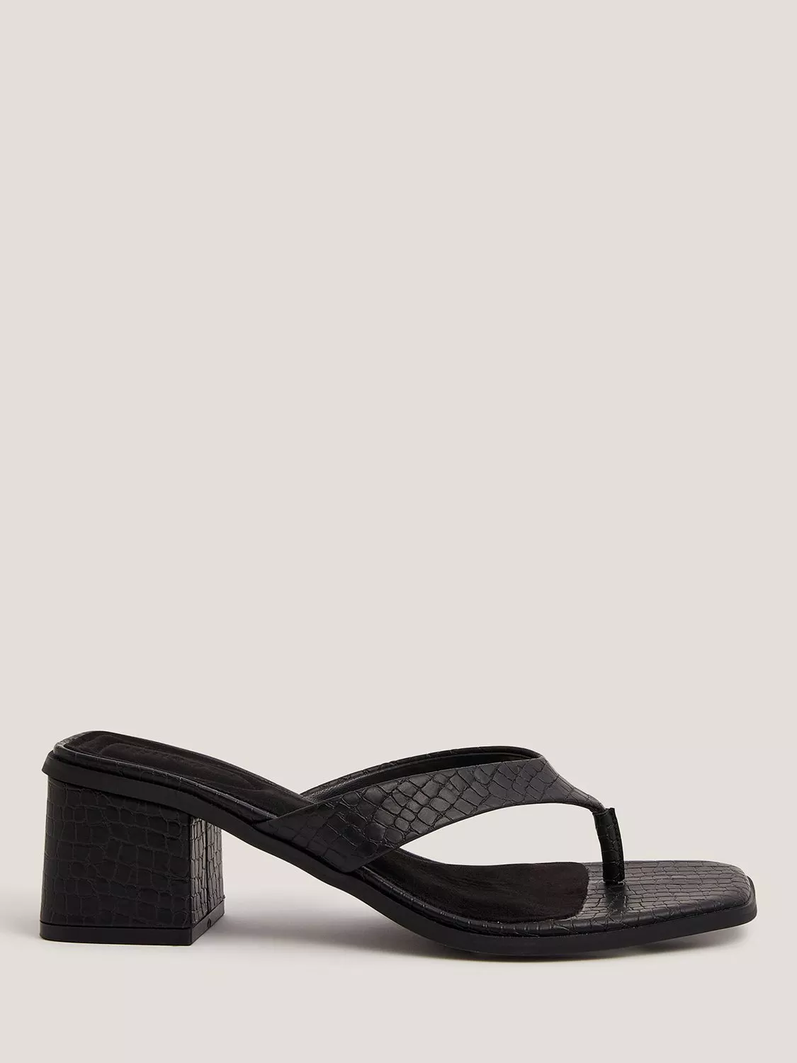Summer heels: Sorted. Designed in faux leather with a croc-effect finish, these mules are great for pairing with your evening summer looks. Featuring a thong-style strap atop a chunky heel, they make the perfect pedestal to show off your freshly painted pedi.