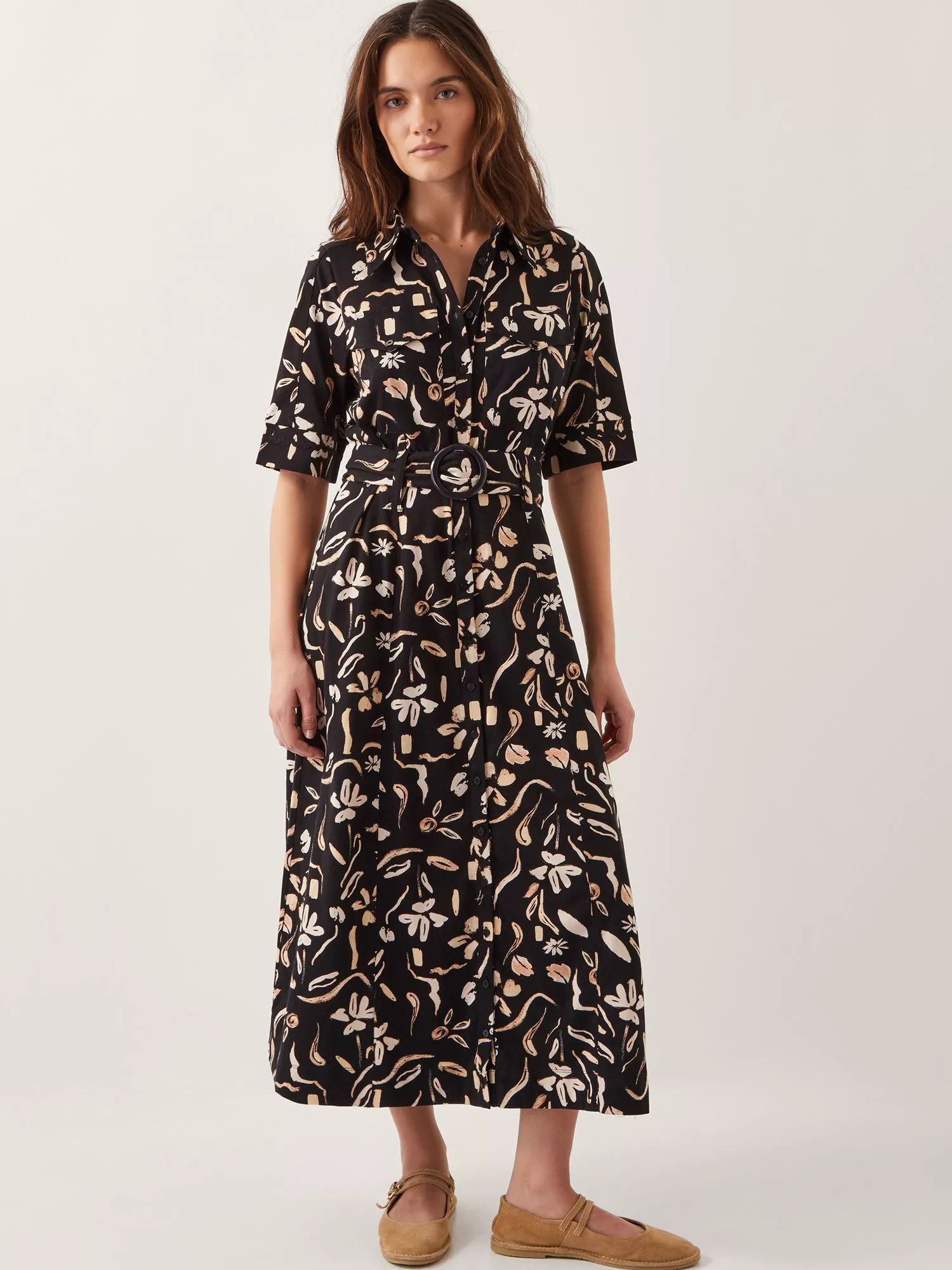 Who says florals are just for spring? This effortlessly chic shirt dress proves they're a year-round staple. Designed in a flowing midi length with a waist-cinching belt, it's the perfect blend of relaxed and refined. Finished with a button-down front and short sleeves, it's a throw-on-and-go piece that's equal parts comfortable and chic.