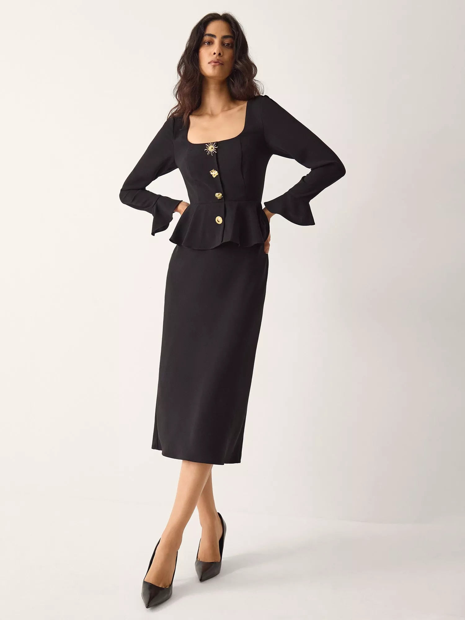 Monsoon midi pencil dress. Its square neckline, peplum waist and long sleeves create a sharp impression, ensuring you stay comfortable and collected, no matter the agenda.