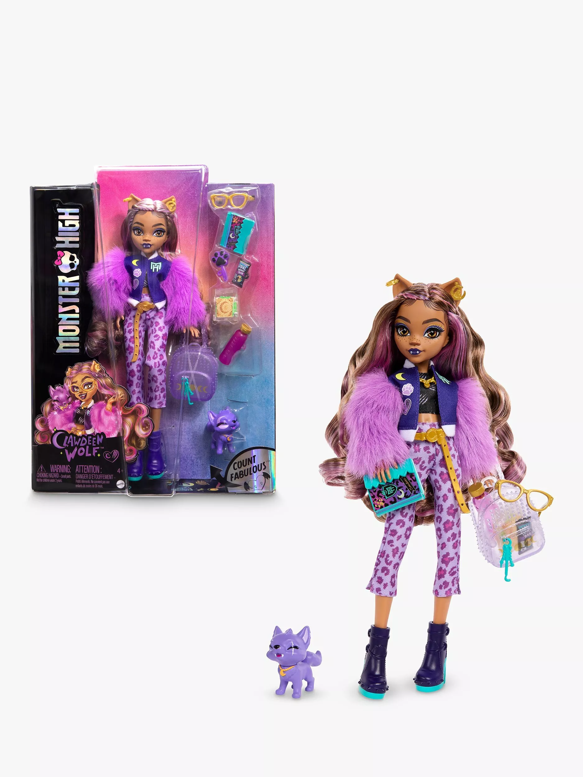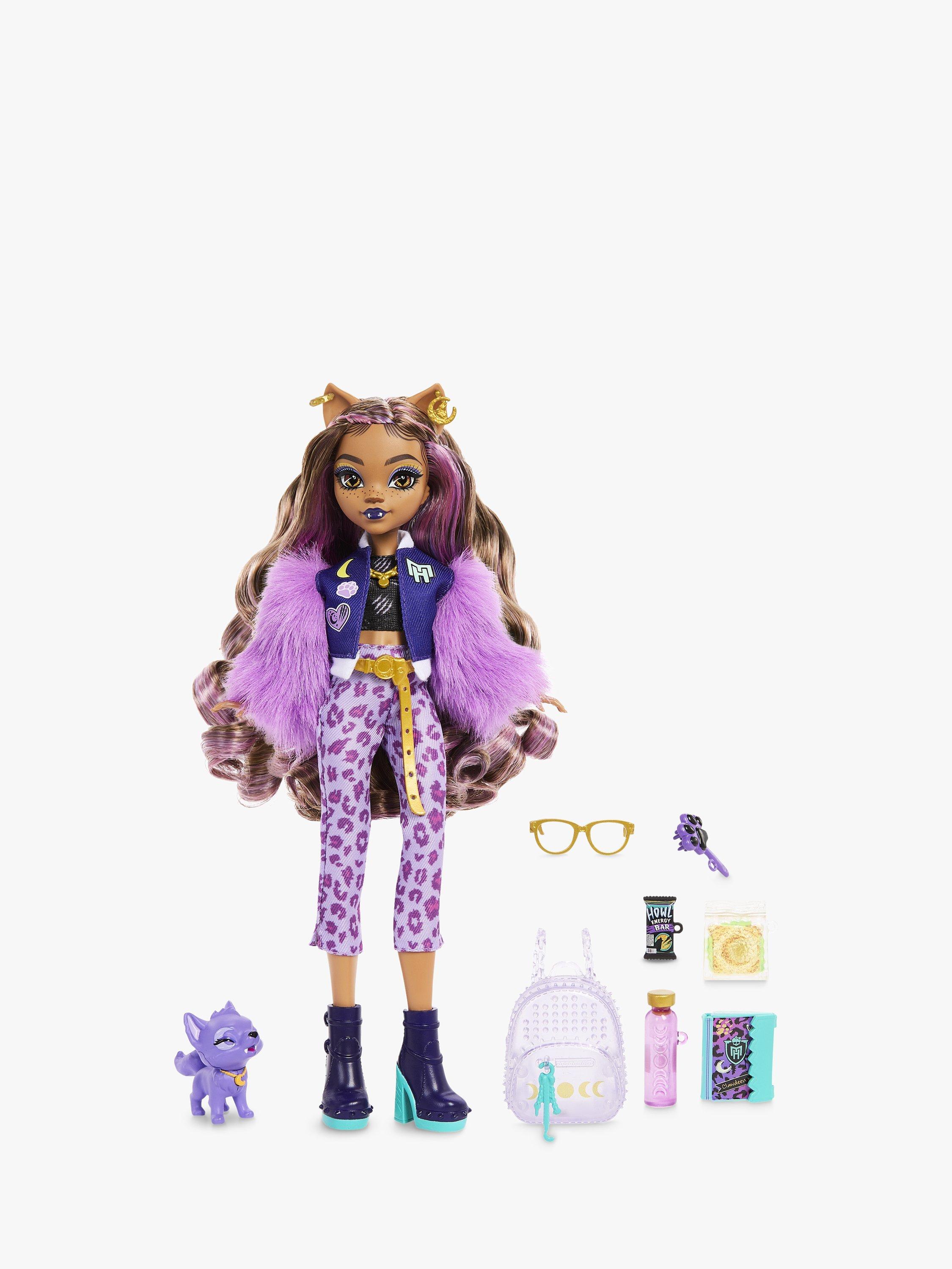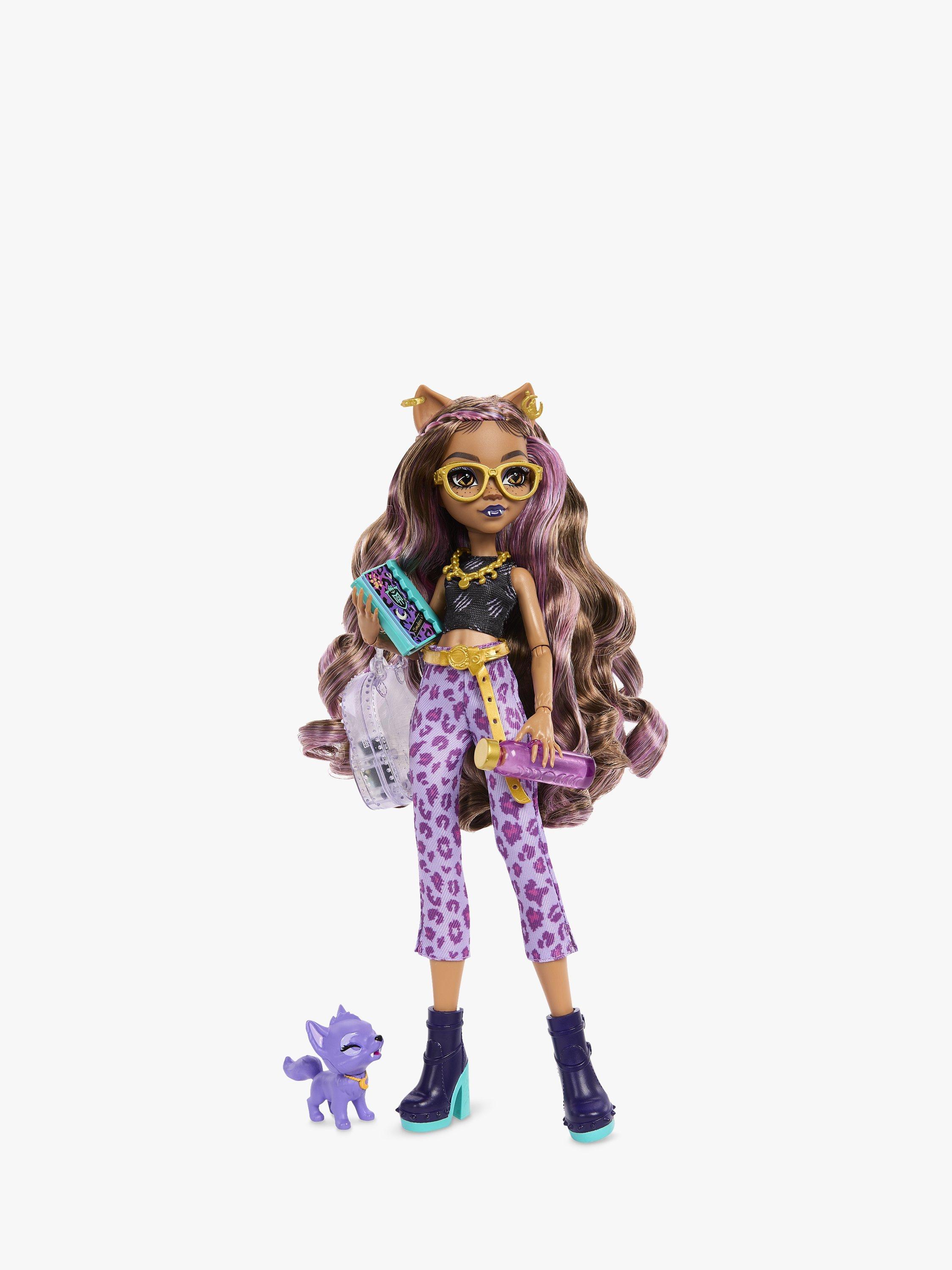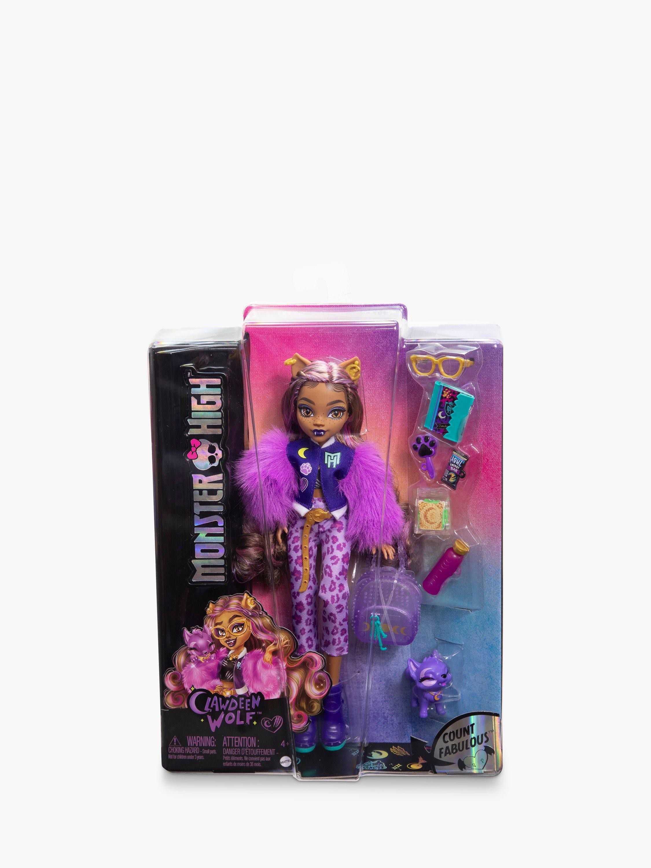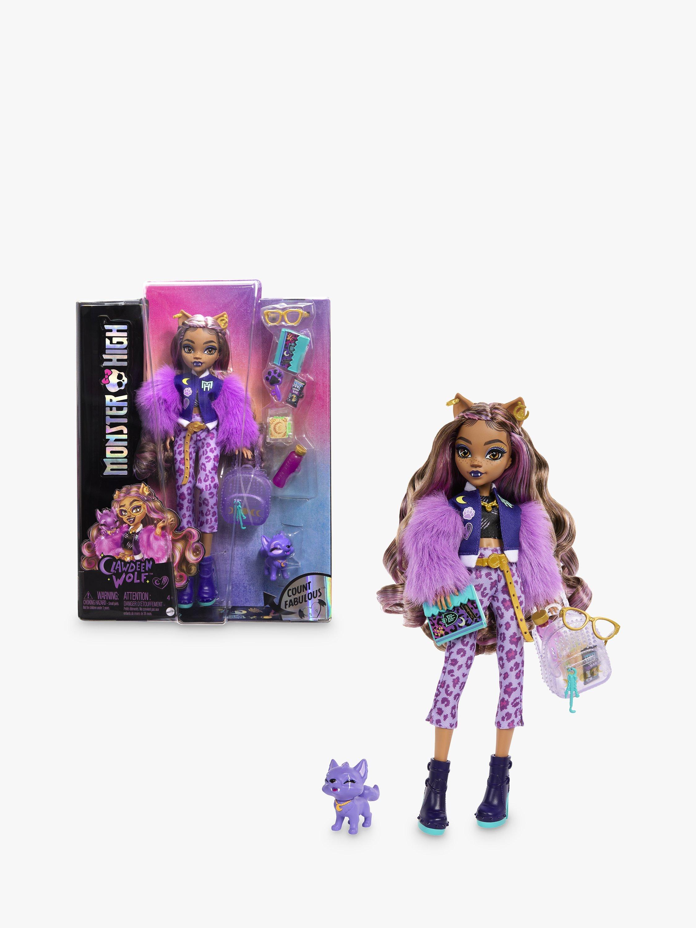 This Monster High doll makes quite an iclawnic werewolf! Clawdeen Wolf shows off her furrocious fashion sense in a head-to-toe purple lurk. Her creeptastic canine, Crescent is ready to join in on the fun, too.