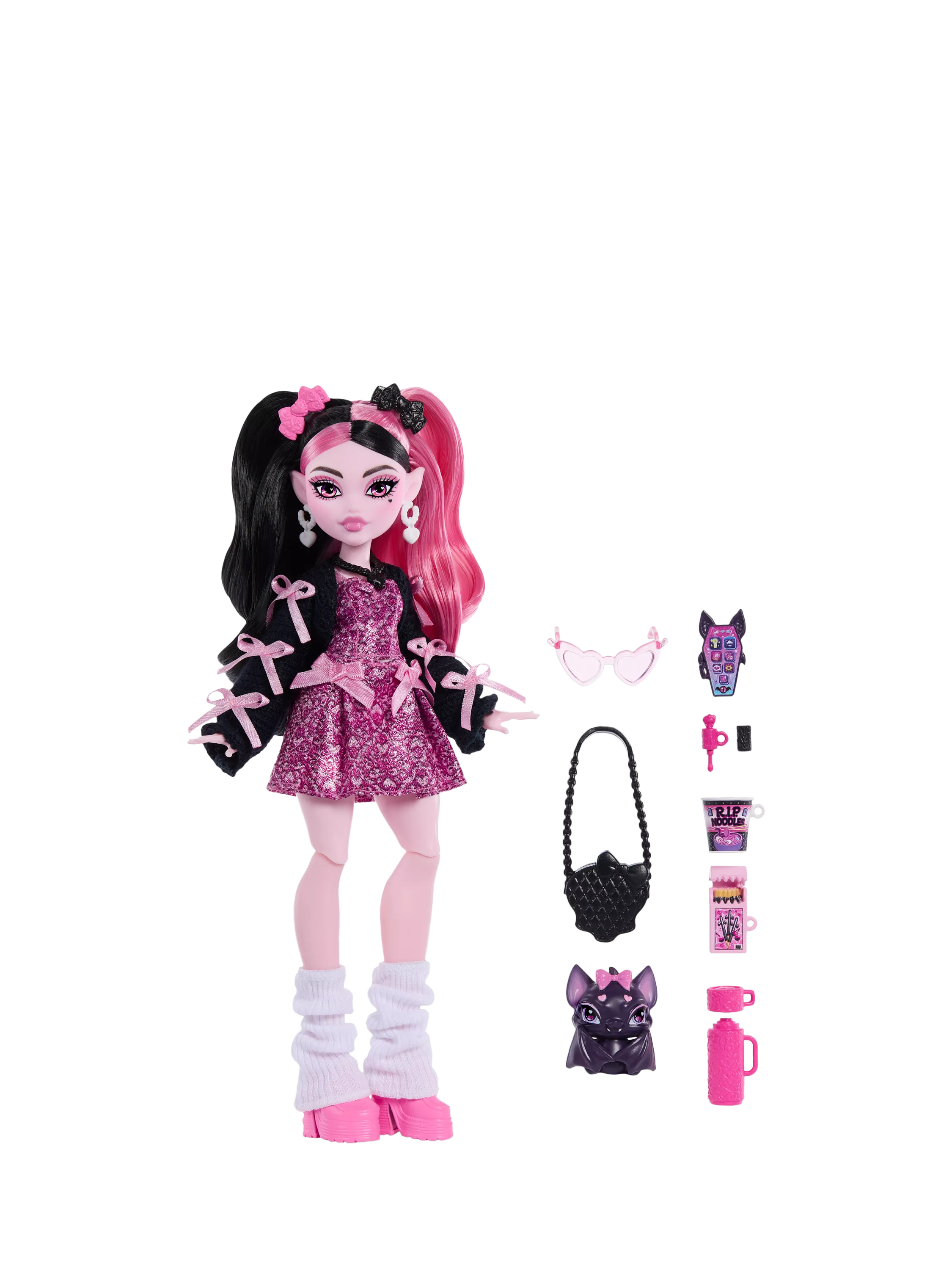 Includes one Draculaura doll, one pet figure and seven accessories. Fully articulated. Doll cannot stand alone. Doll stand not included. Colours and decorations may vary.