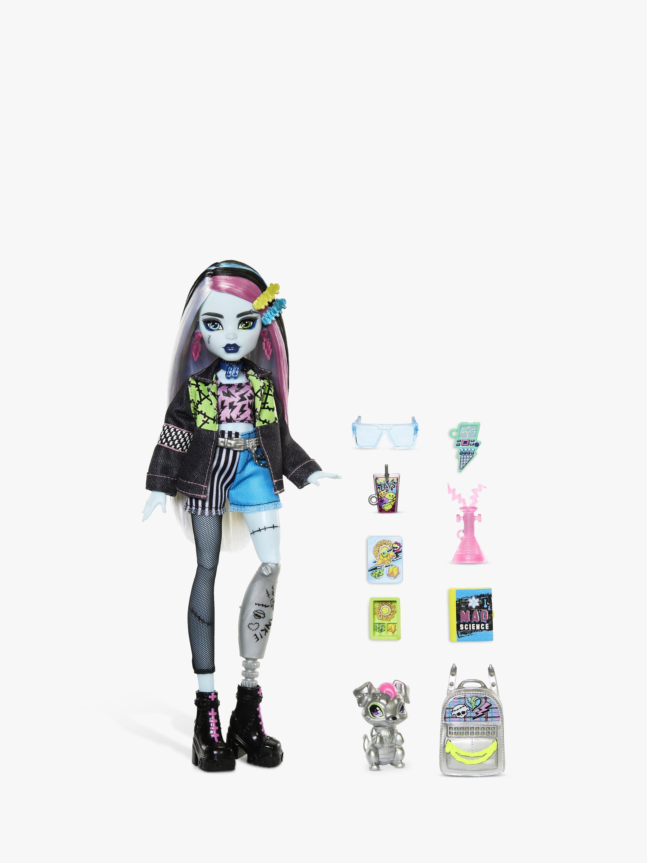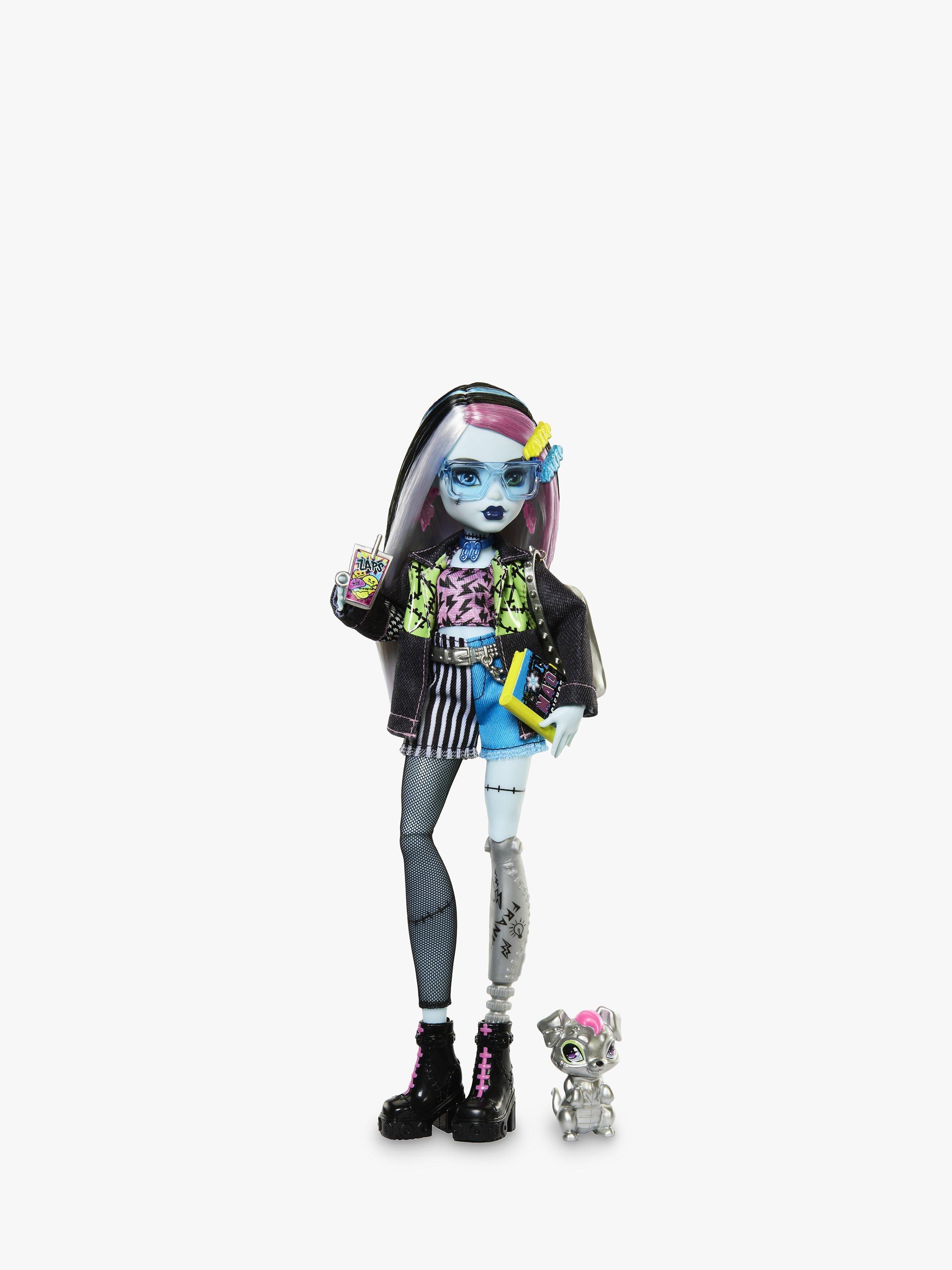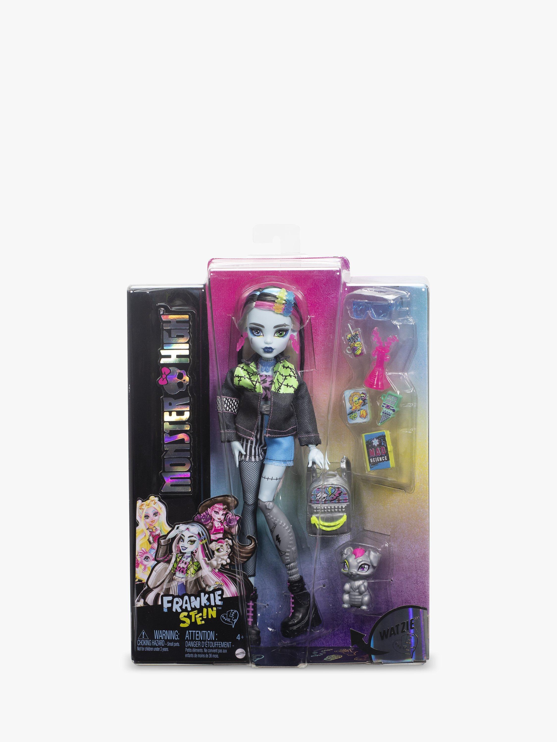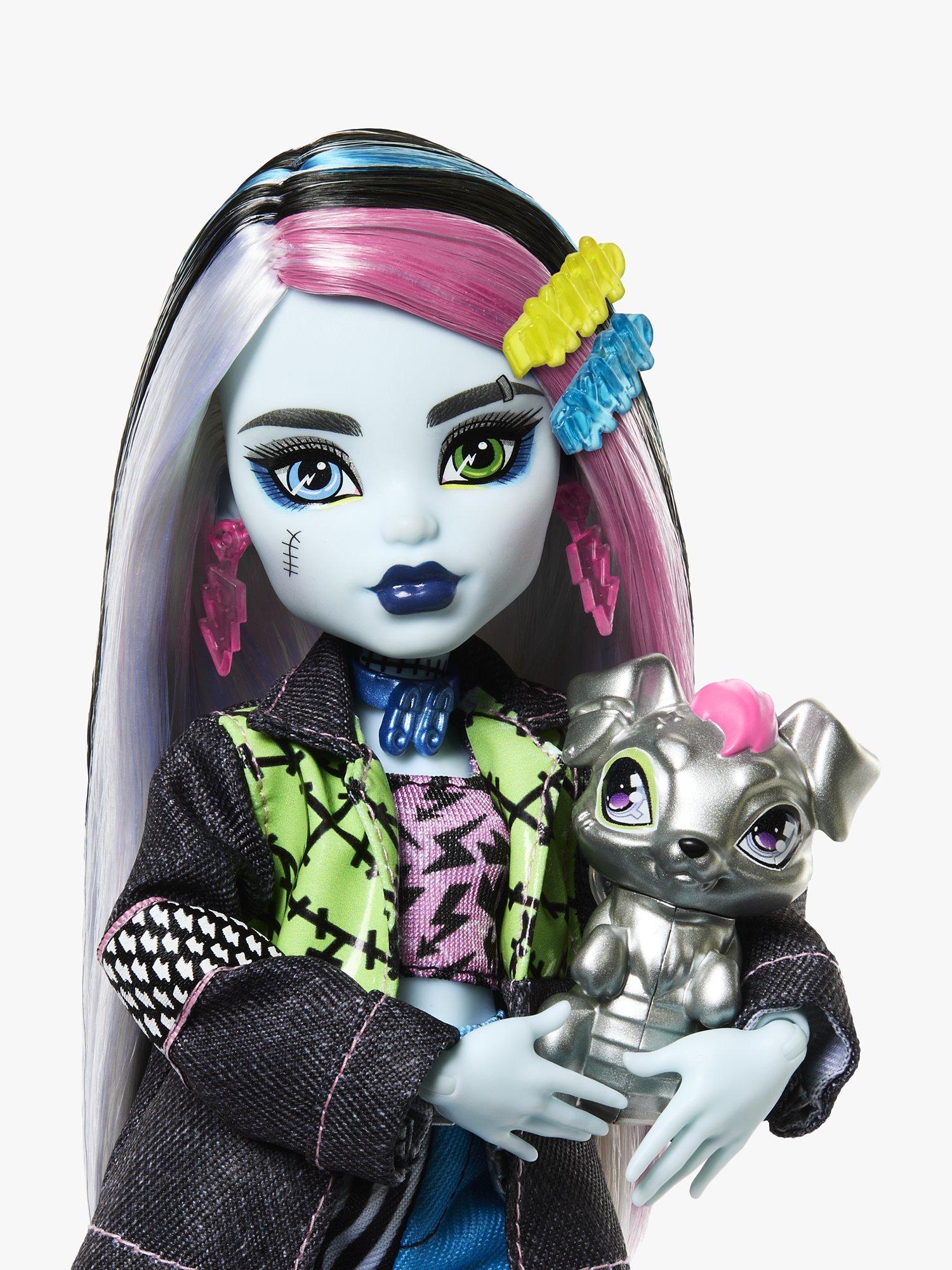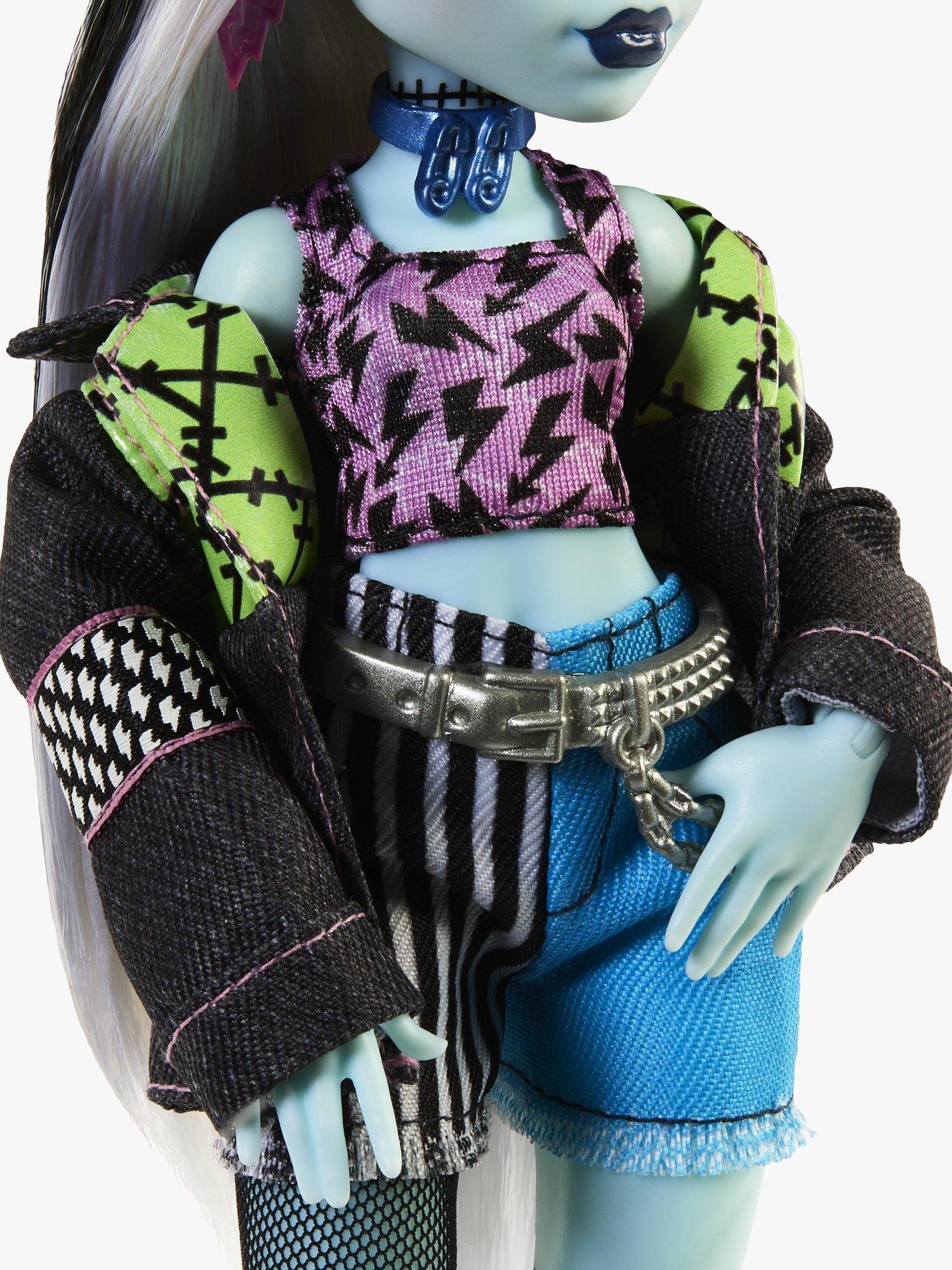 Frankie Stein is a spooktacular style icon! This Monster High doll serves lurks in a denim patchwork outfit that shows off their electrifying fashion sense. Watzie the pet dog is ready to join in on the fearsome fun, too! With a poseable body and voltageous storytelling accessories, Frankie Stein doll makes a bootiful gift for kids 4 years old and up. Fully articulated. Doll cannot stand alone. Colors and decorations may vary.