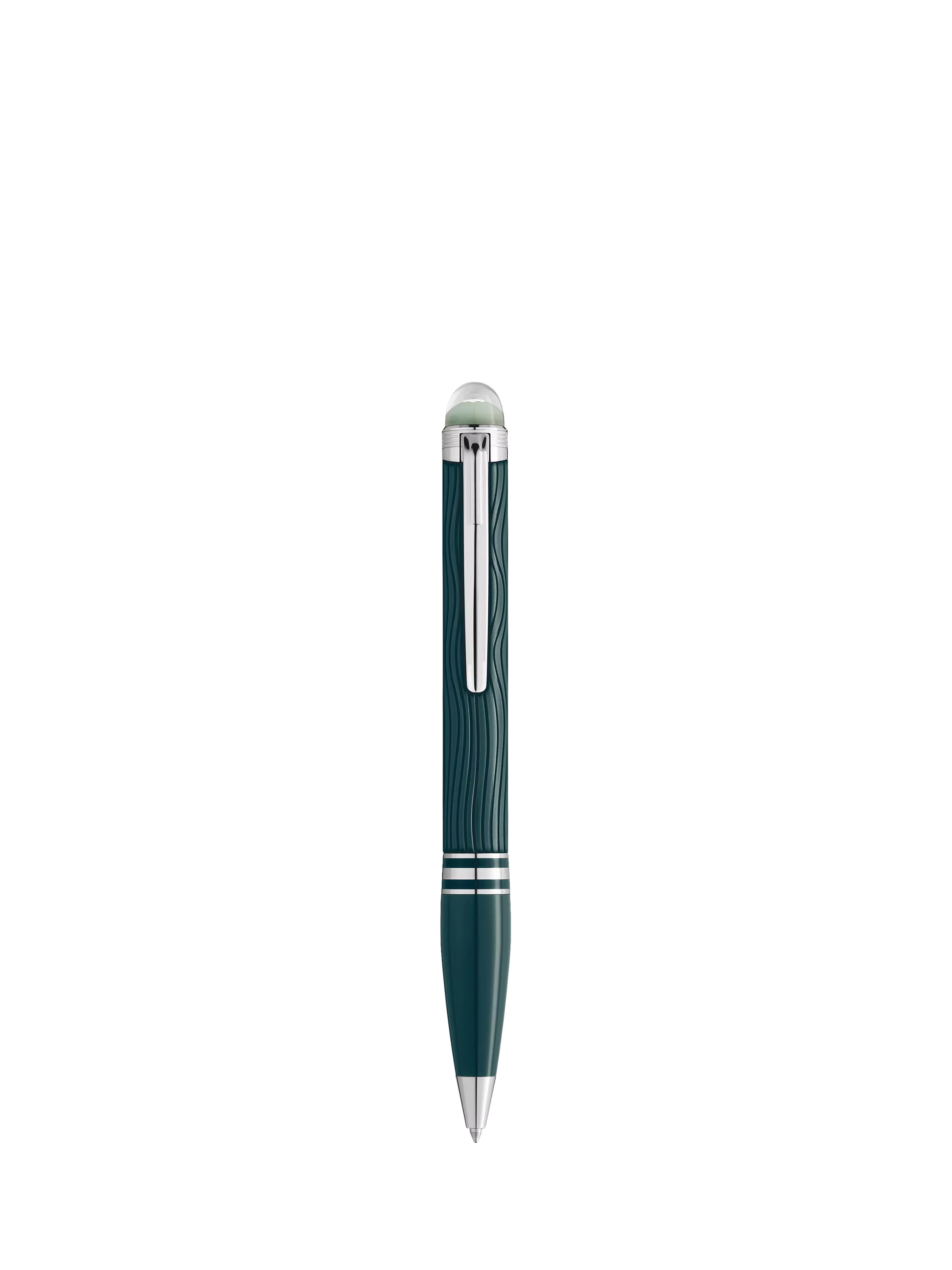 StarWalker PolarGreen brings the beauty of the Northern Lights to life. On Earth, humans can gaze skyward and be transported to realms of wonder as they witness their grand spectacle. The dome on the cap top is made of transparent resin and glows in low light, recalling the enchanting dancing auroras of the night sky. The wave pattern on the dark green precious resin of the cap and barrel admirably captures the spectral sheen of the lights, and the matte finish accentuates the seemly reflections. The dark green resin rings of the forepart enhance the platinum-coated fittings of the ballpoint.