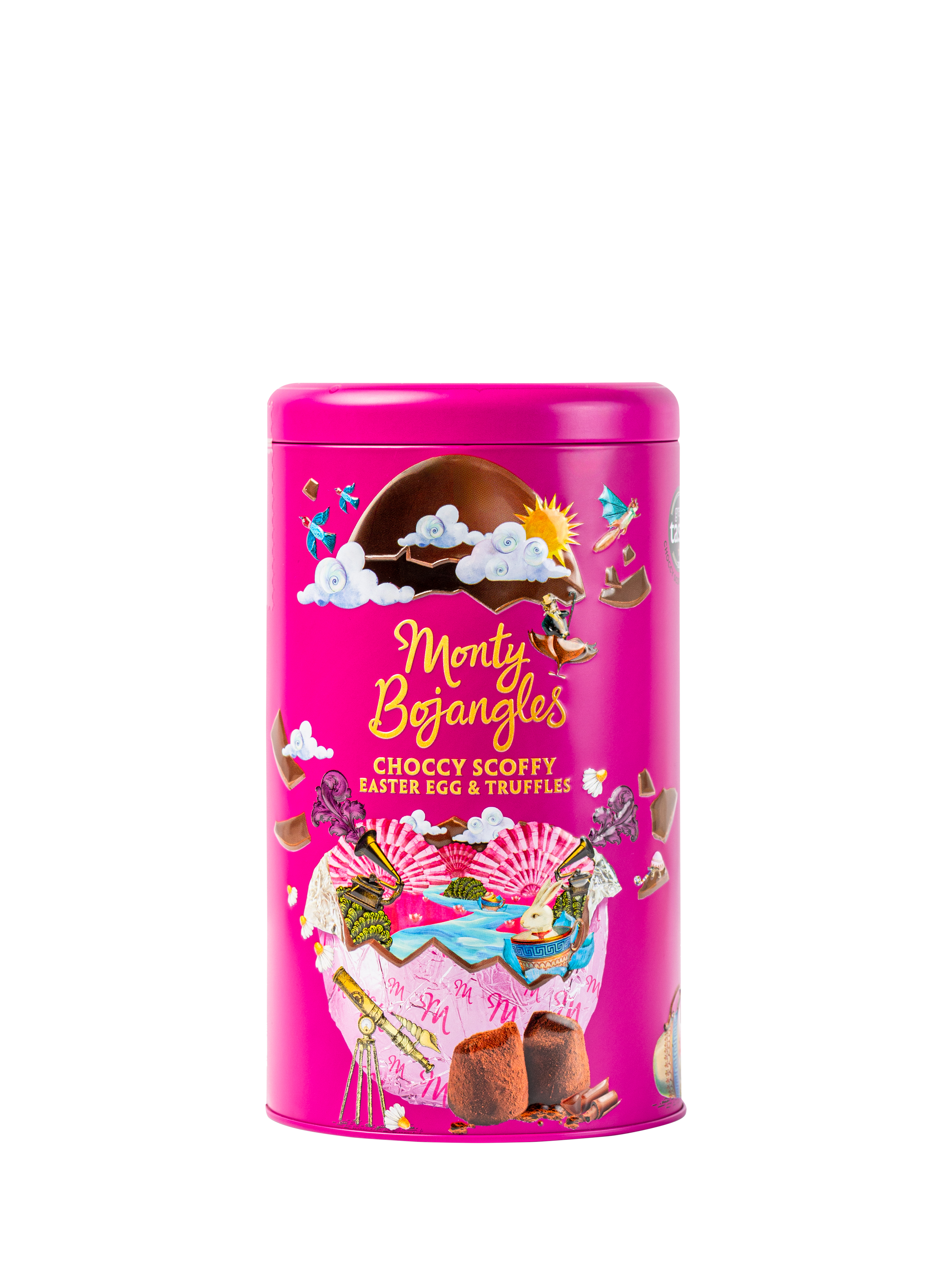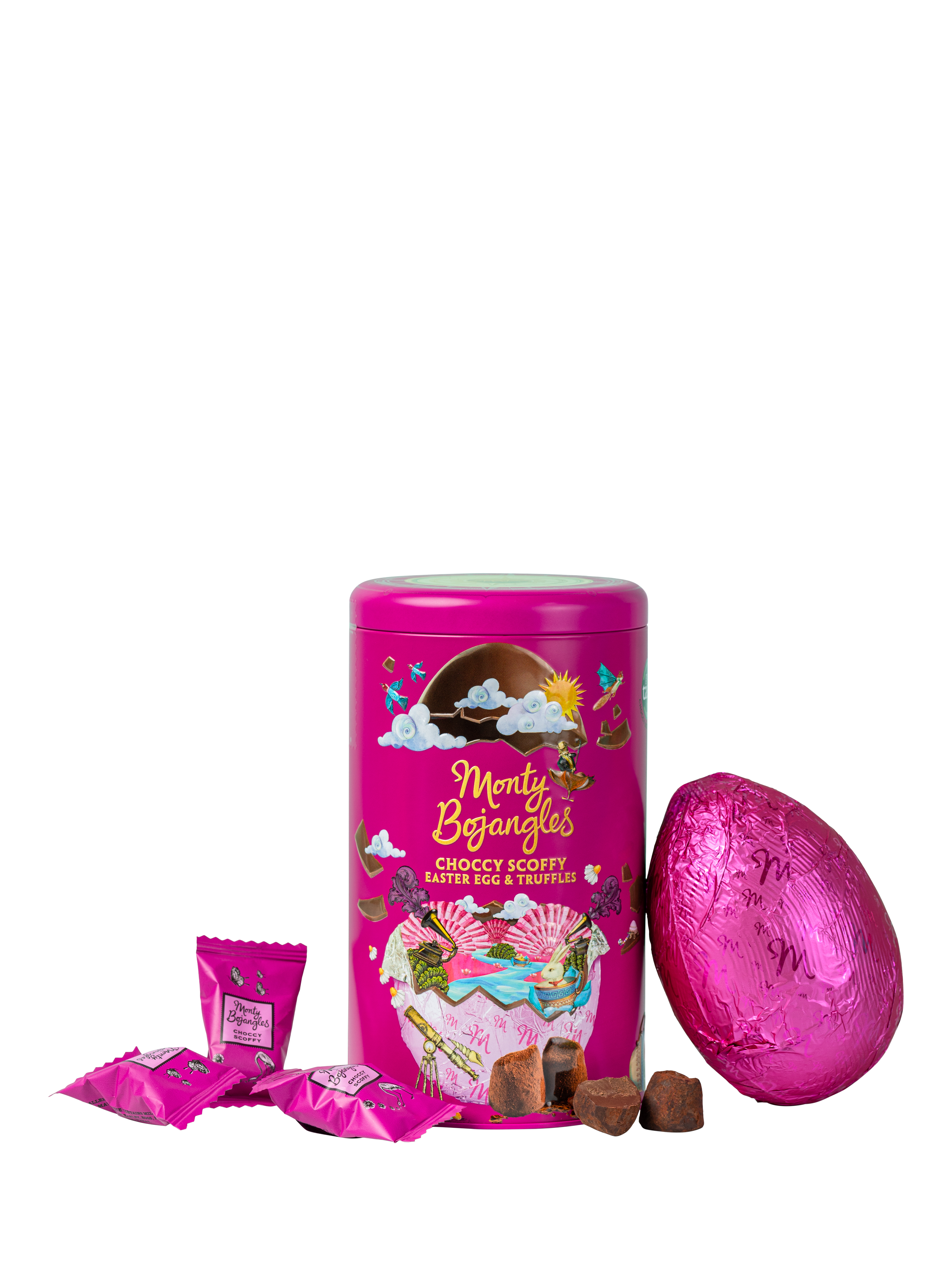 A premium embossed tin with Choccy Scoffy Cocoa Dusted Truffles and a foiled Easter Egg.
