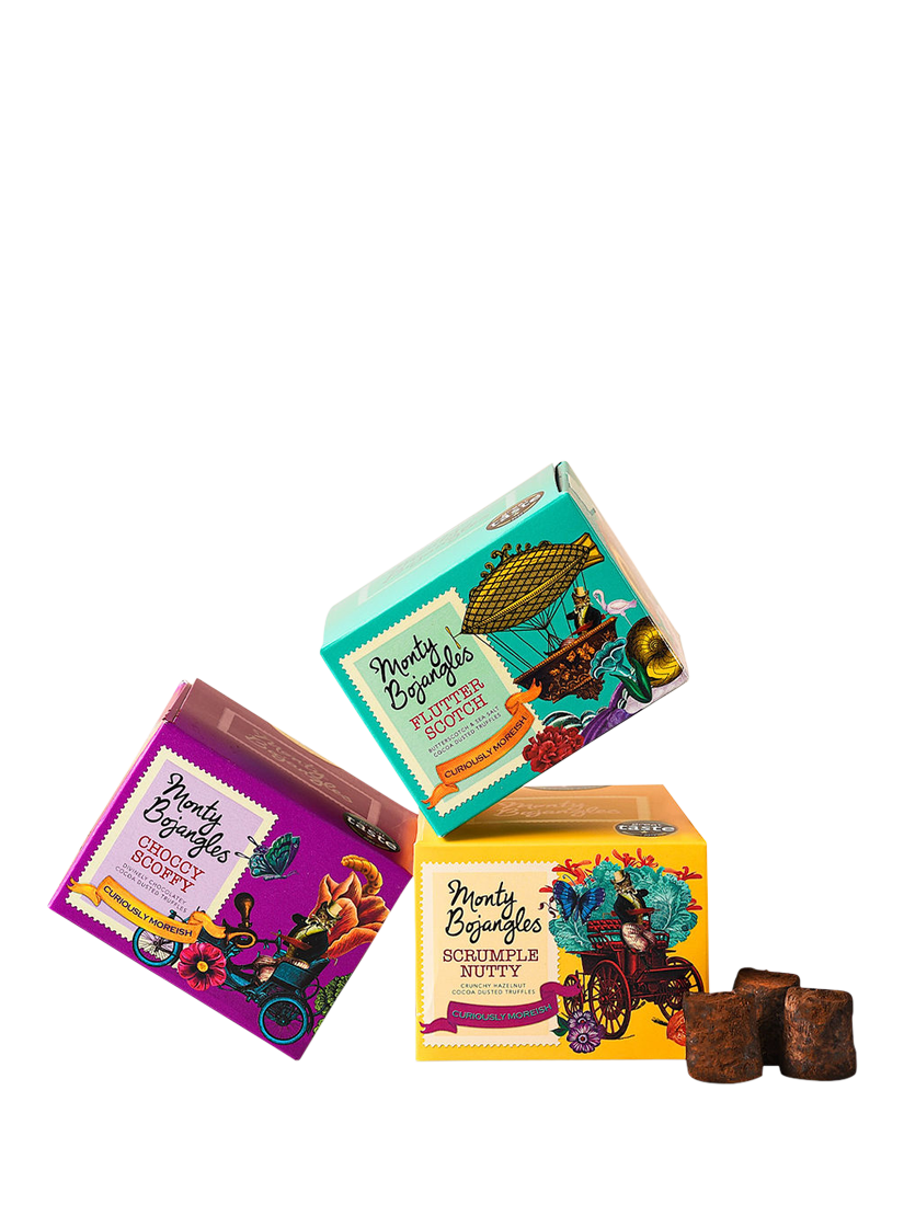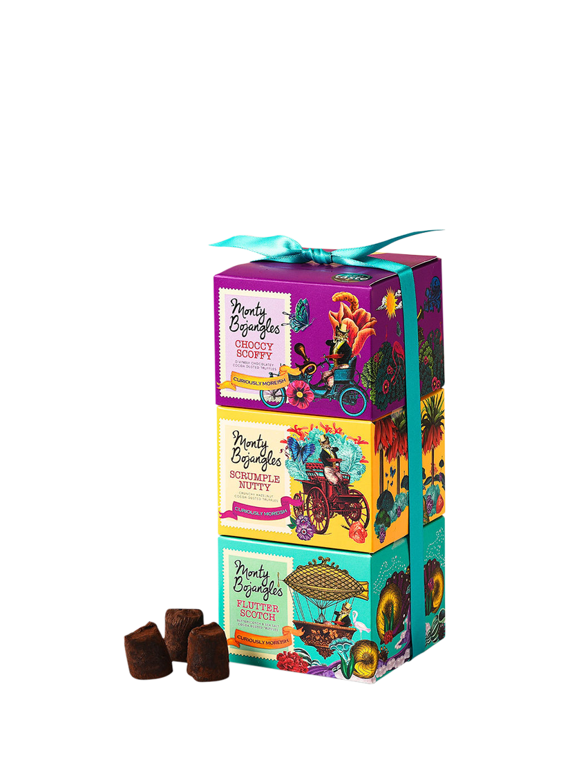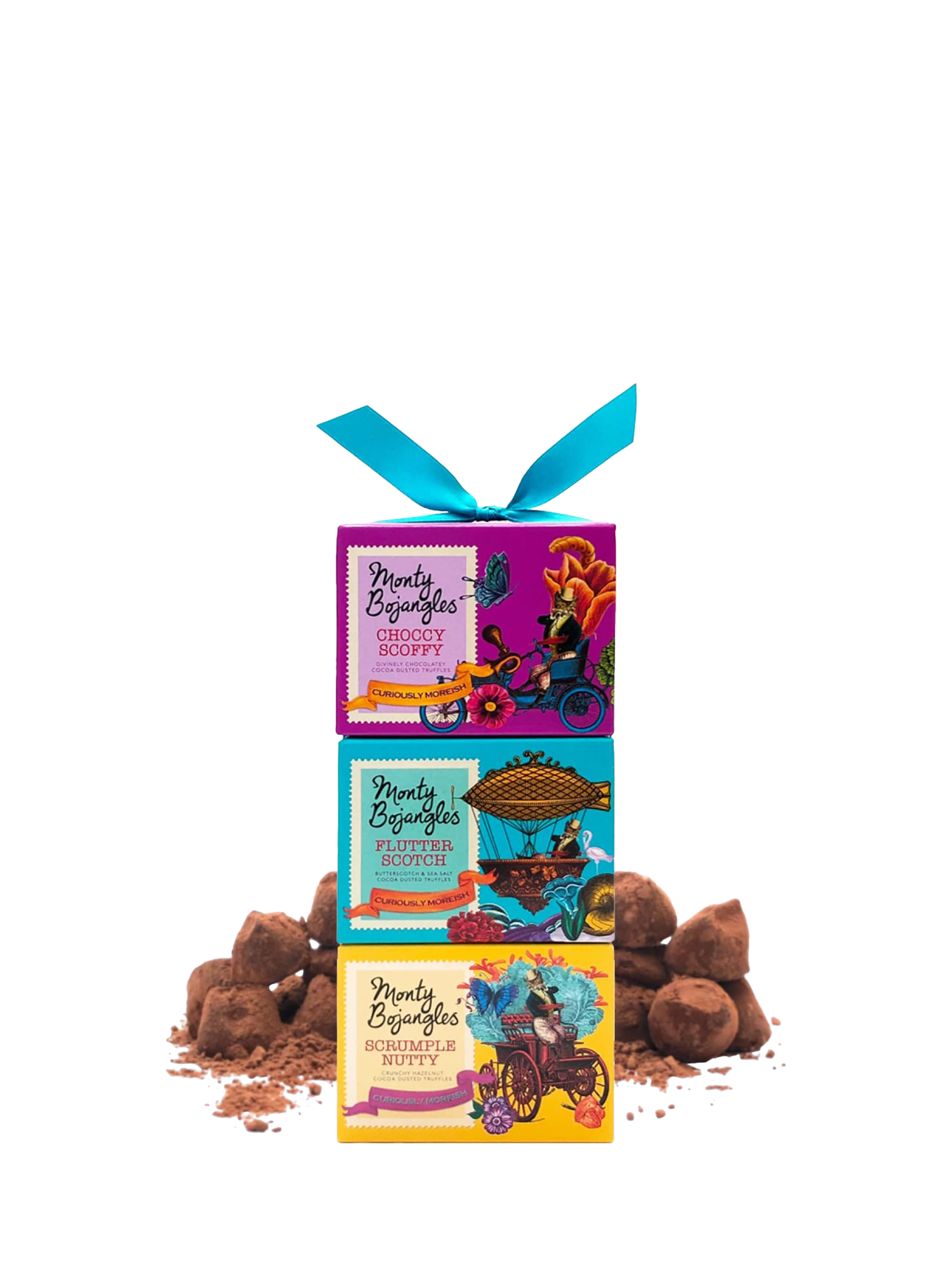 A gift tower of Cocoa Dusted Truffles by Monty Bojangles compromising of three of their most popular flavours: Choccy Scoffy, Flutter Scotch and Scrumple Nutty, tied together with a ribbon.