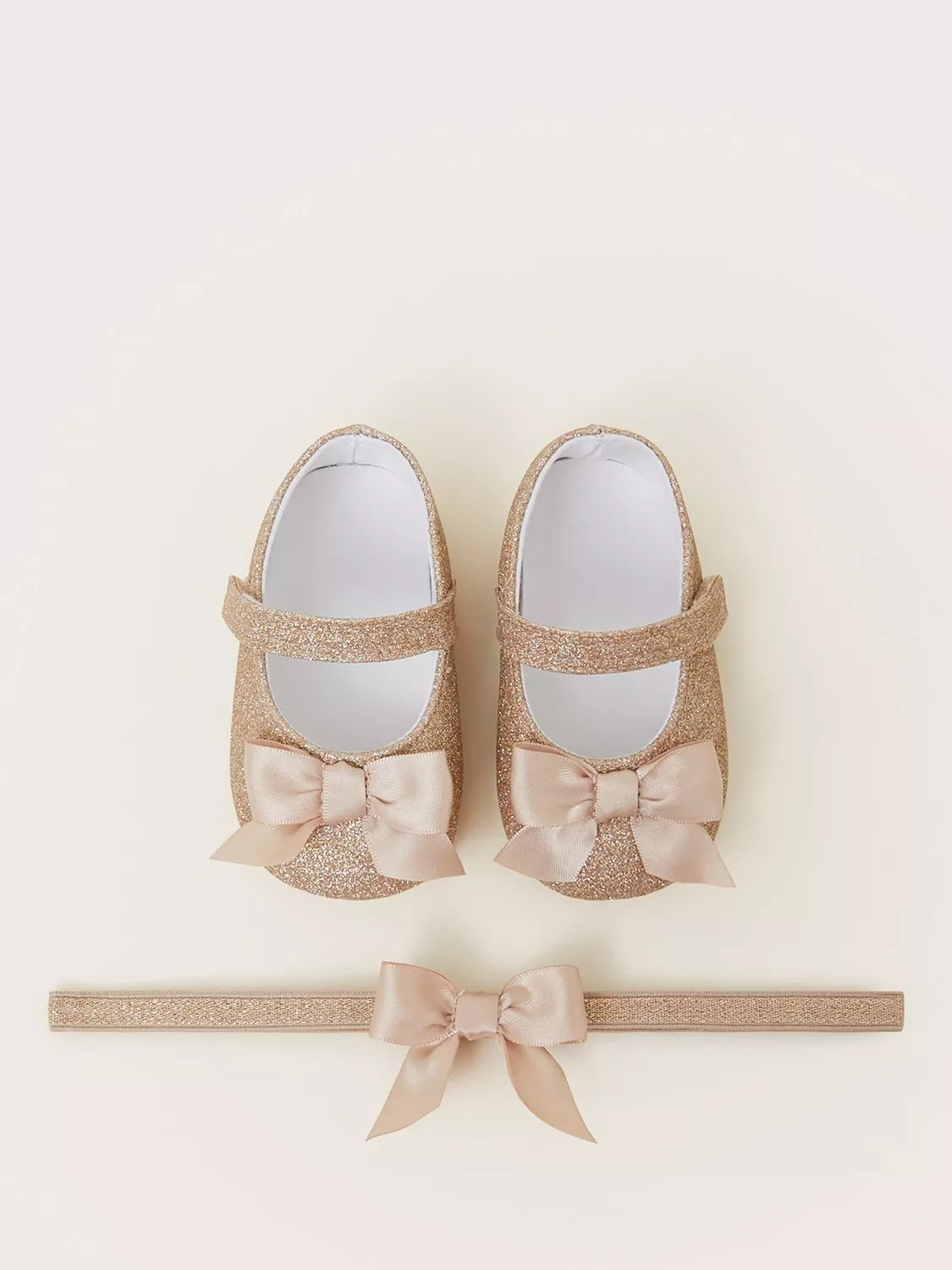 Sparkles from head to toes. Perfect for baby's first special occasion or party, this set includes a stretchy bando headband and booties, both sprinkled with gold glitter and topped with satin bows.