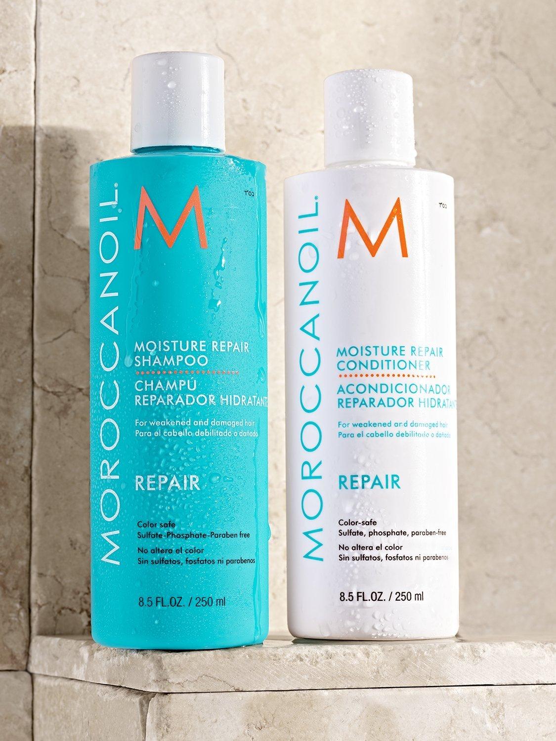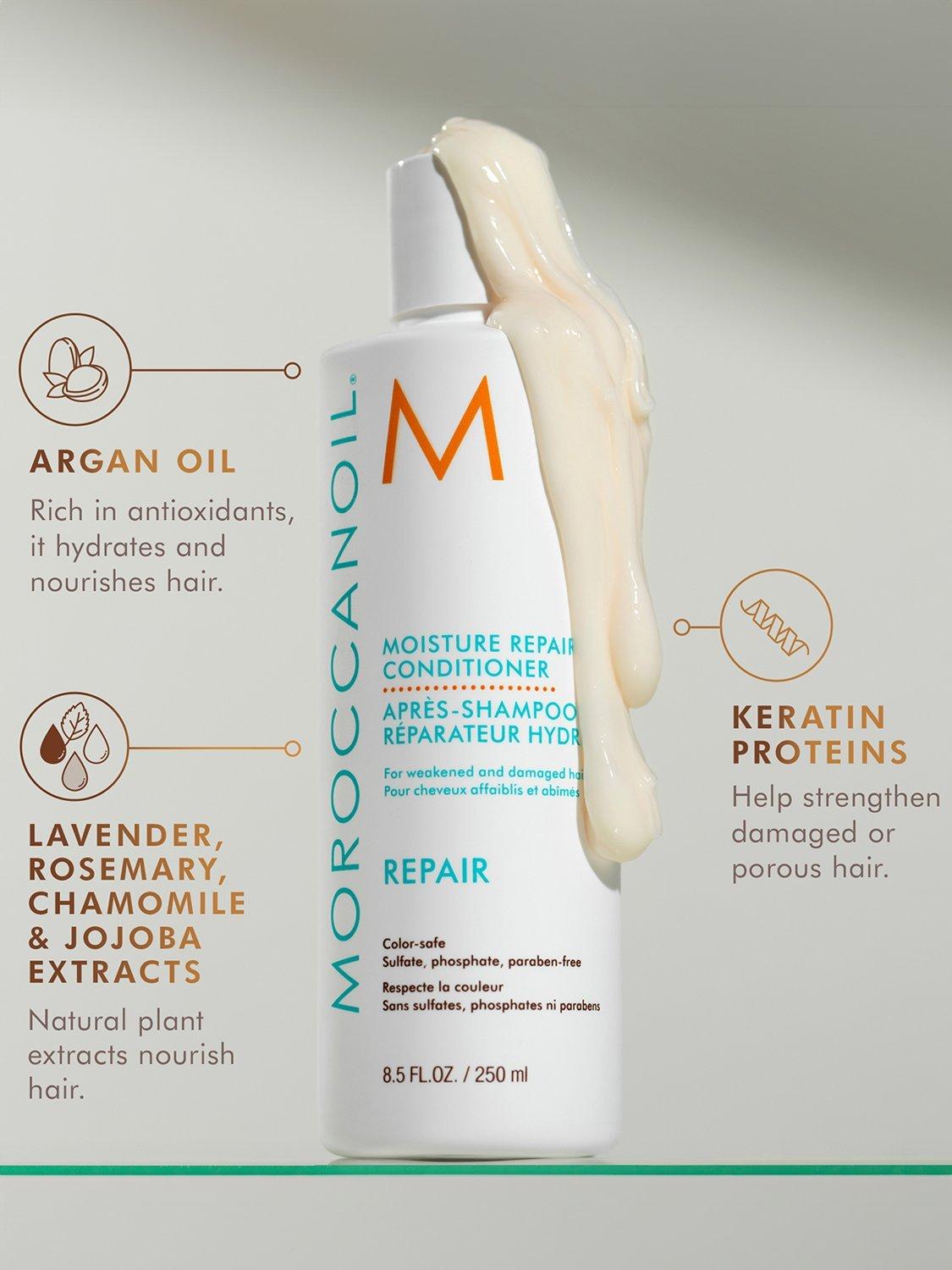Moroccanoil Moisture Repair Conditioner gently and effectively detangles and conditions the hair to leave it hydrated, manageable and strong. Its highly concentrated, reparative formula restores hair's health, moisture and elasticity with antioxidant-rich argan oil, reconstructive keratin and fatty acids.