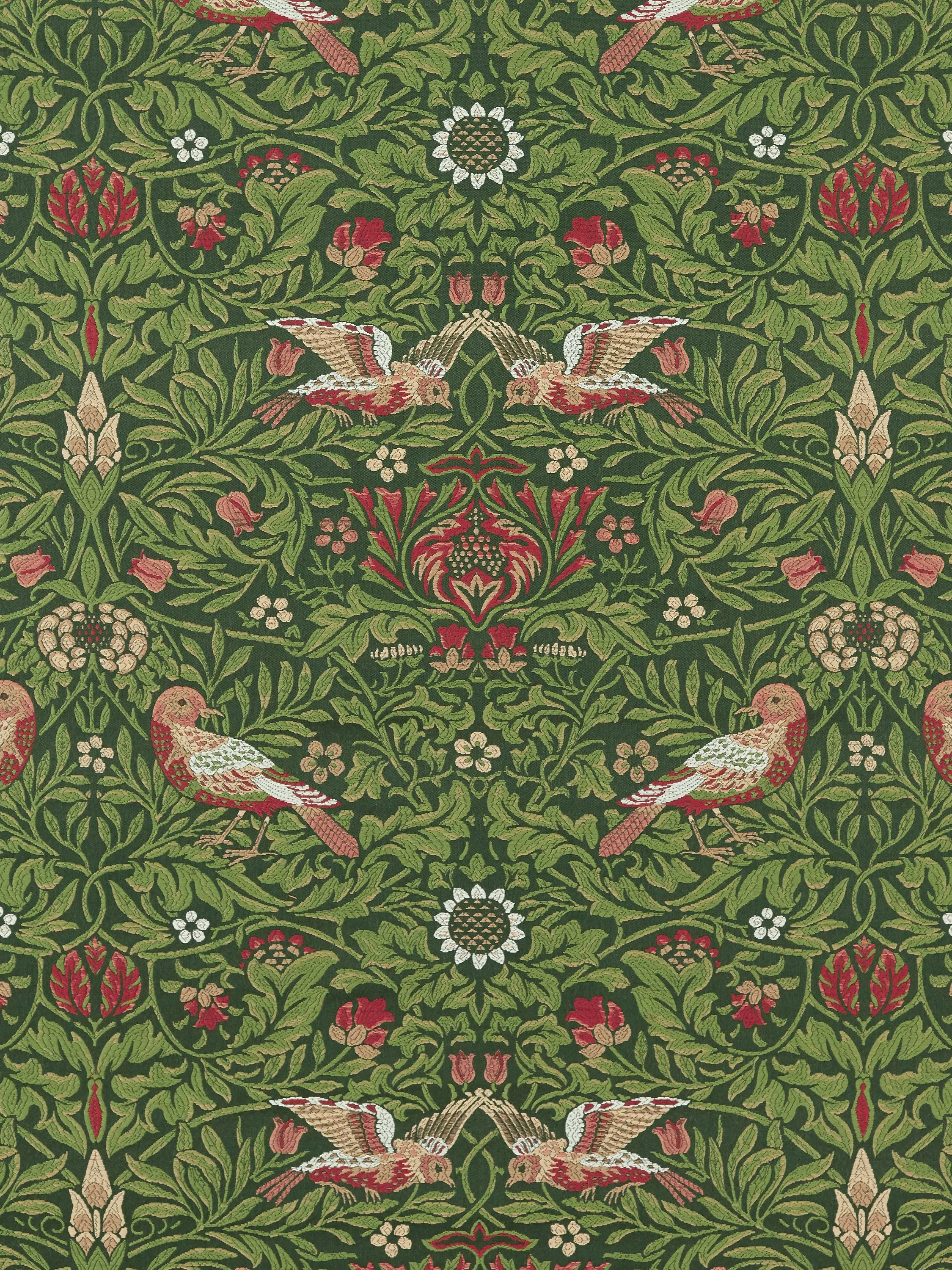 Paired birds alternate between perched and in-flight in this serene 1878 tapestry design from William Morris. Surprising bursts of colour emerge upon closer inspection, pulling the eye towards the original hand-driven jacquard loom production quality. William Morris designed Bird in 1878 to adorn the walls of his own drawing room in Kelmscott House. His friend and neighbour, the noted typographer Sir Emery Walker, adorned his dining room with an identical Bird tapestry after receiving an inheritance from either Morris or Philip Webb, the famous Arts & Crafts architect.