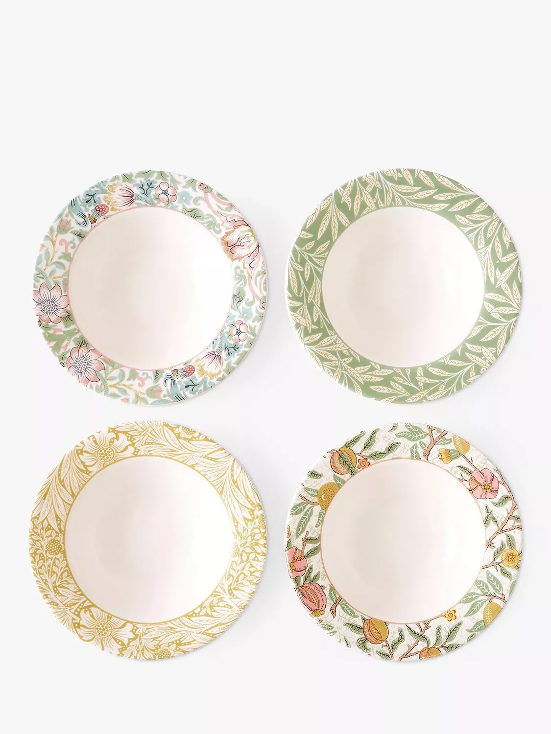 Four cereal bowls with different heritage patterns from the archive of Arts and Crafts pioneer William Morris. From Spode's Morris & Co. collection, each earthenware bowl has a nature-inspired print on the rim: Fruit, Marigold, Strawberry Thief and Willow, creating a beautiful mix-and-match setting. Made in England, these bowls are dishwasher, freezer and microwave-safe, as well as oven-safe up to 170°C.