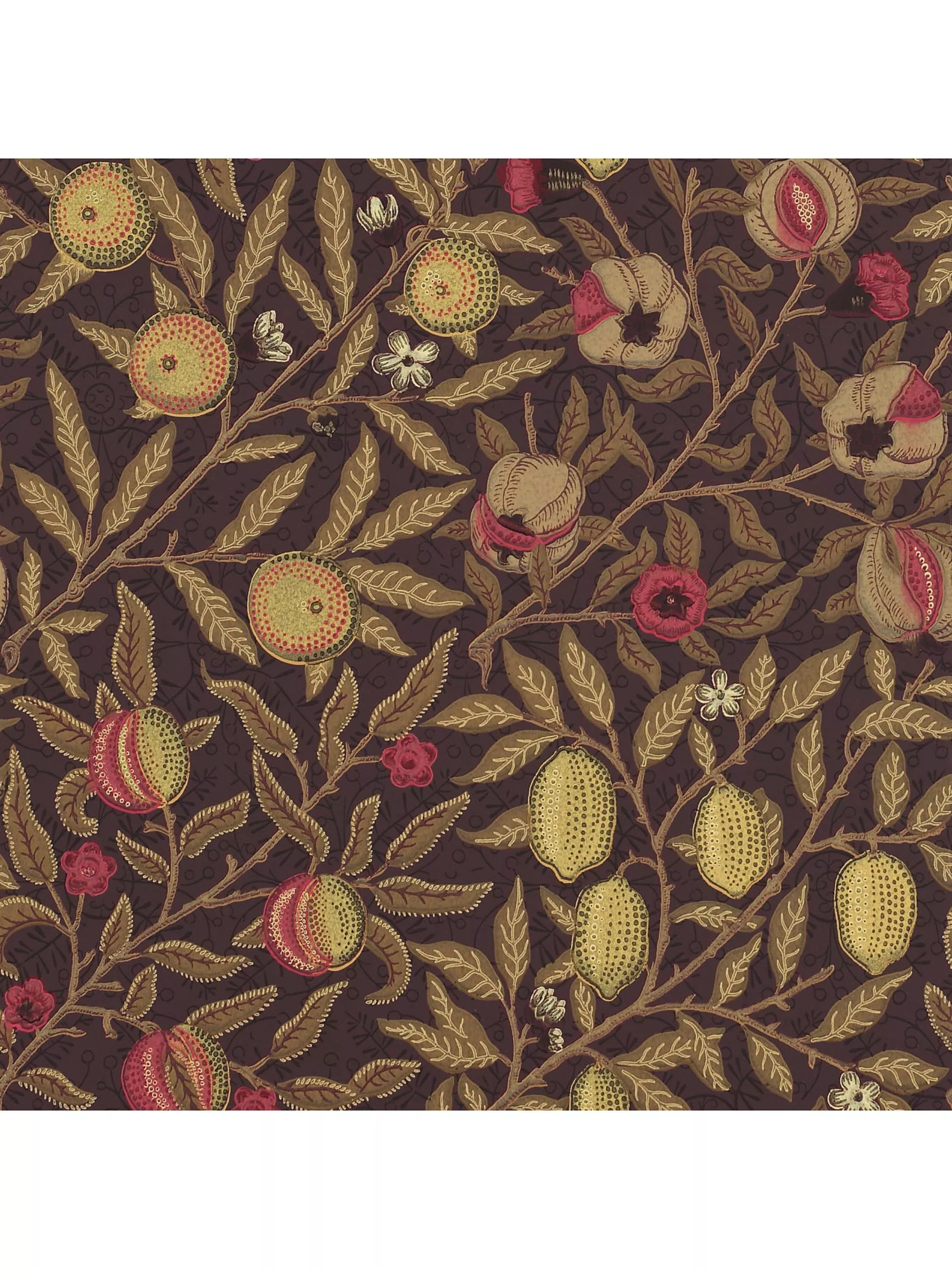 The peaches, pomegranates and citrus fruits throughout this elaborate design have a heritage feel. It is reminiscent of the motifs used by Morris & Co to decorate the Green Dining Room in the South Kensington Museum in 1866.