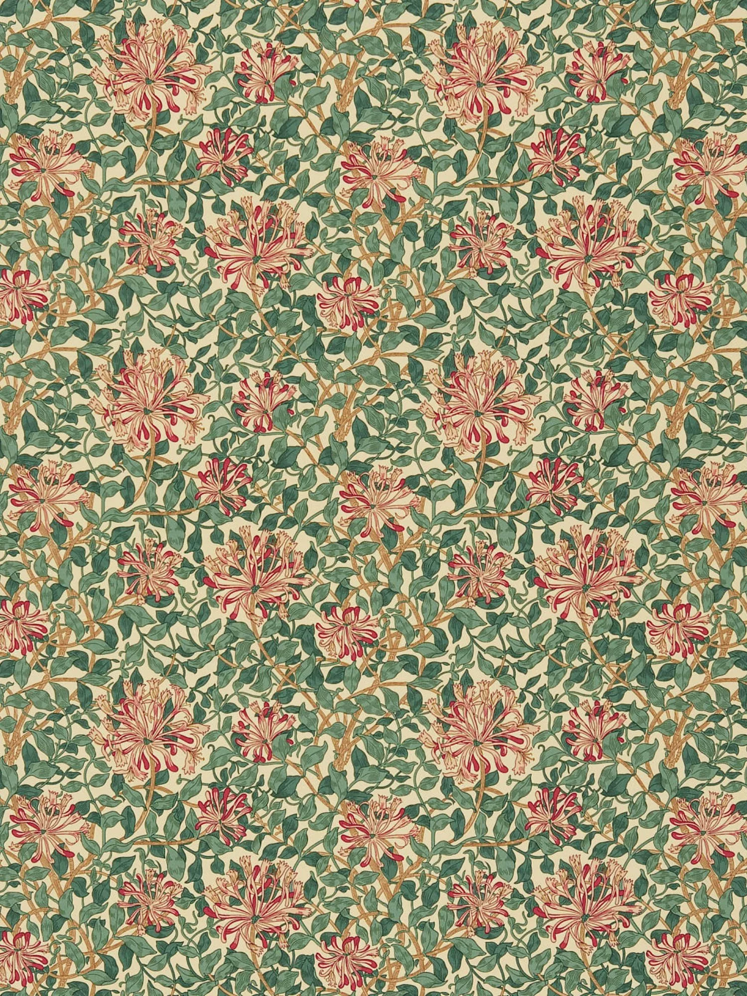 Honeysuckle, designed by May Morris in 1883, is a realistic arrangement of the climbing scented flower with captivating entwining leaves. Although best known for her work with embroidery, Morris's youngest daughter also designed several wallpapers. Honeysuckle is reimagined based on samples in the Morris & Co. archive and is available in classic and naturalistic colourways on printed cotton.