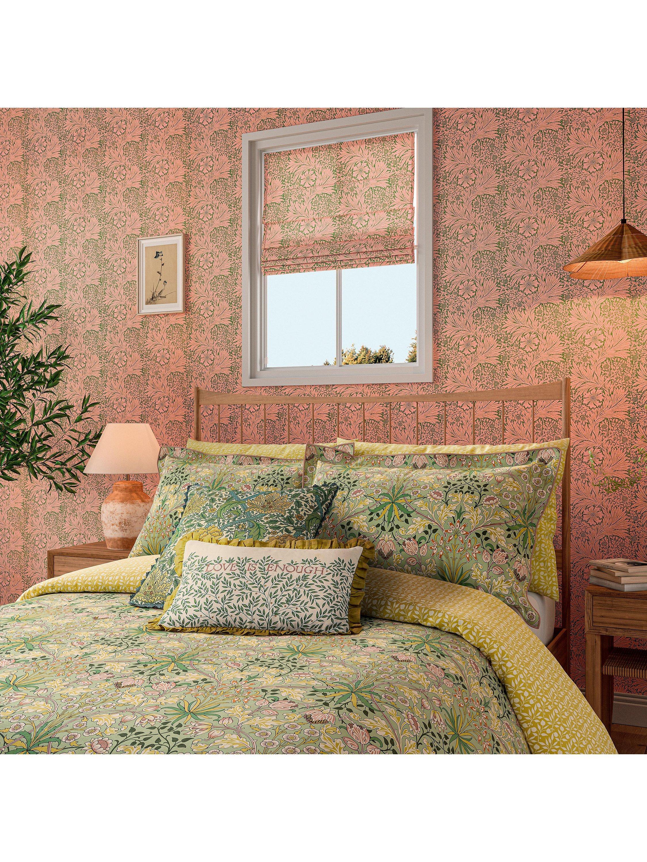 Entwining foliage and flower motifs in a mirrored pattern repeat. Features Morris branded buttons along the bottom of the duvet cover.