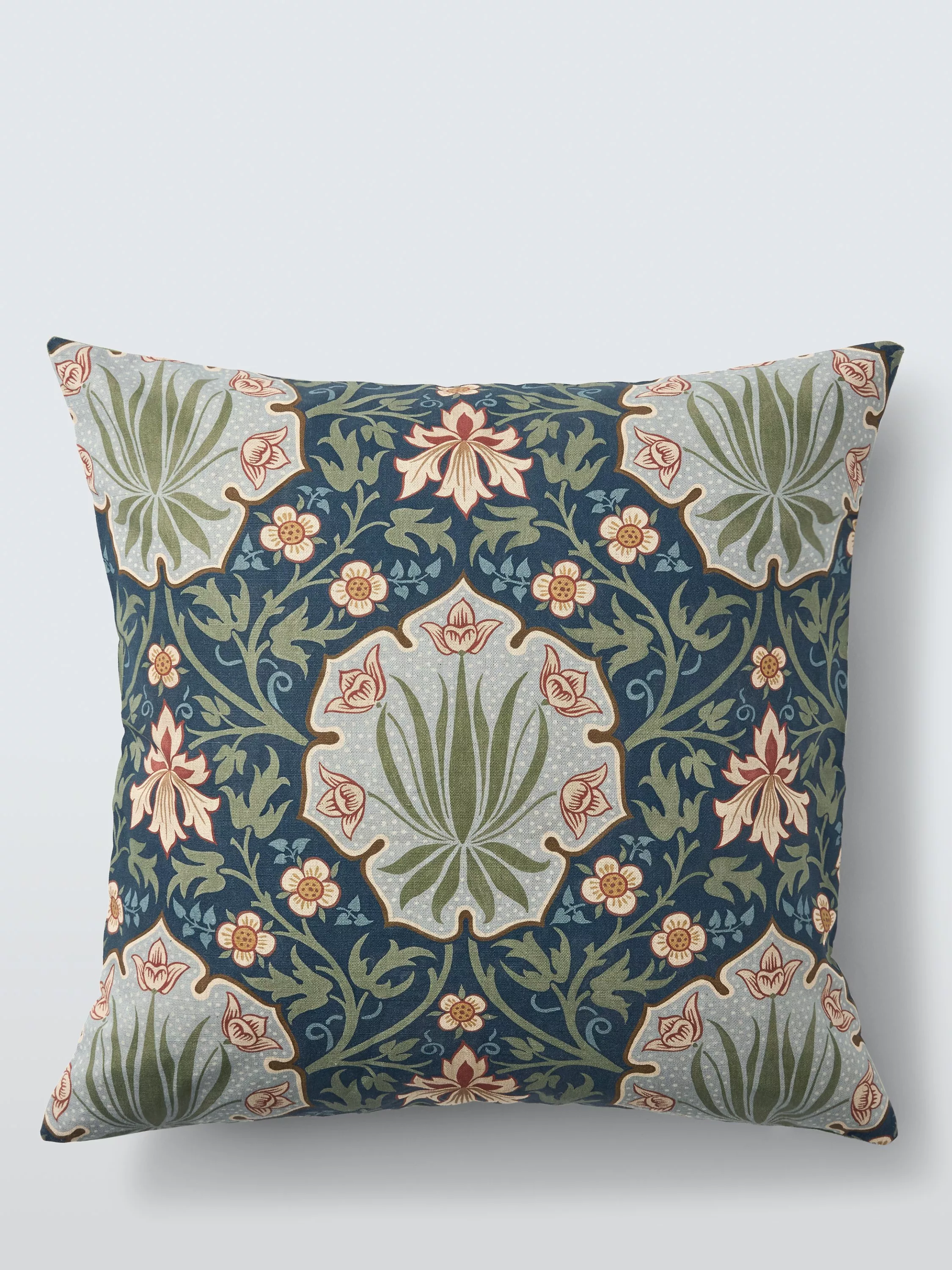 Retaining the striking shield motif of the original document Iris & Rose celebrates both flowers in a richly ornamental design. Central to the pattern the iris features within and beyond the shield motif, while roses sit delicately across the ground. Vine leaves weave through the background and the shields' dotted detailing adds a playful charm.
