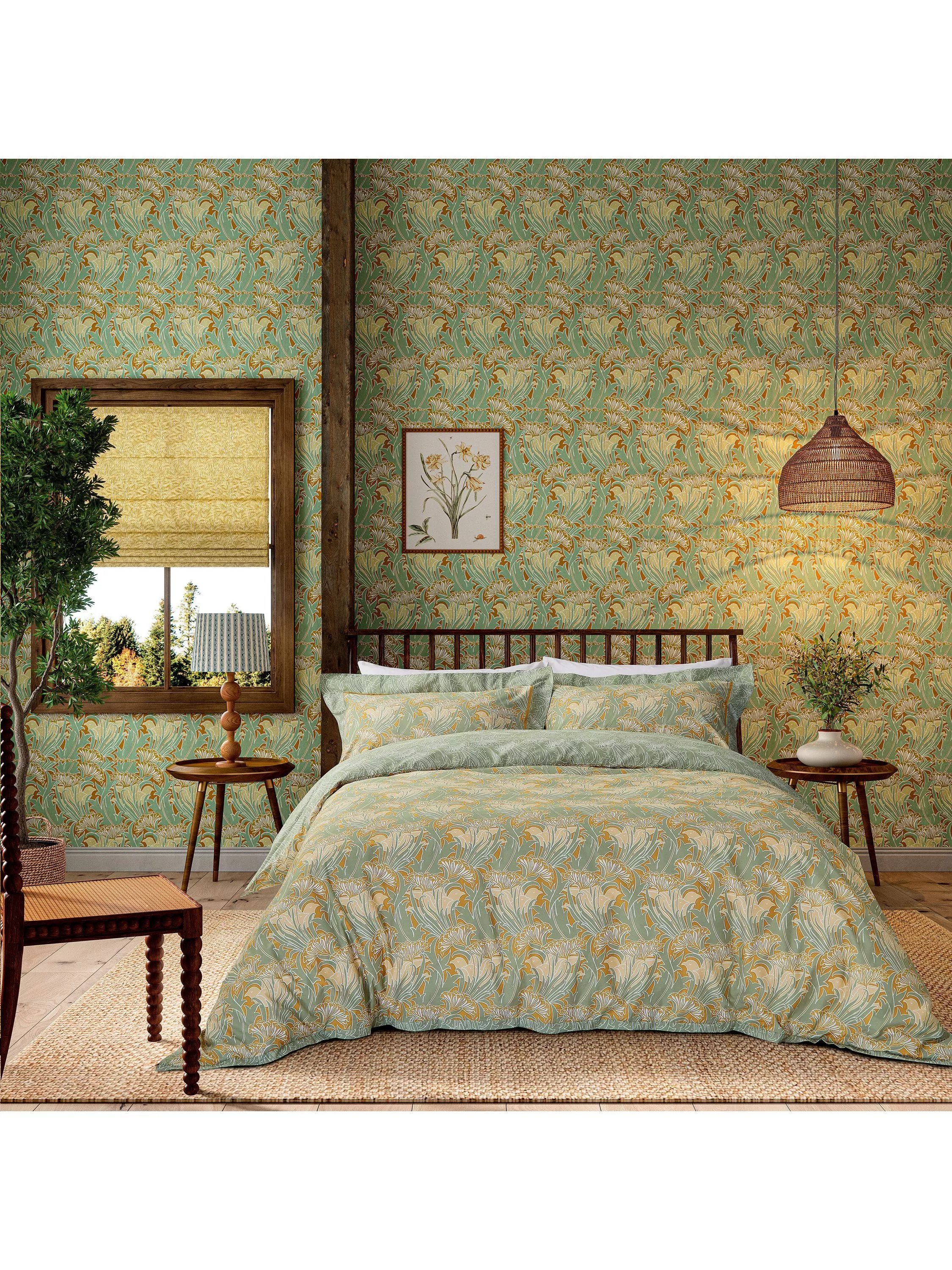 From around 1895, C.F.A. Voysey designed Laceflower. Here, Voysey's birds chirp among the sinuous stems and flowerheads that sway in an imagined wind. It gives us a sense of a calm, gentle breeze that is grounded in this earthed palette; perfectly poised to set the tone for a good night's rest. The duvet is finished with feature flat piping.