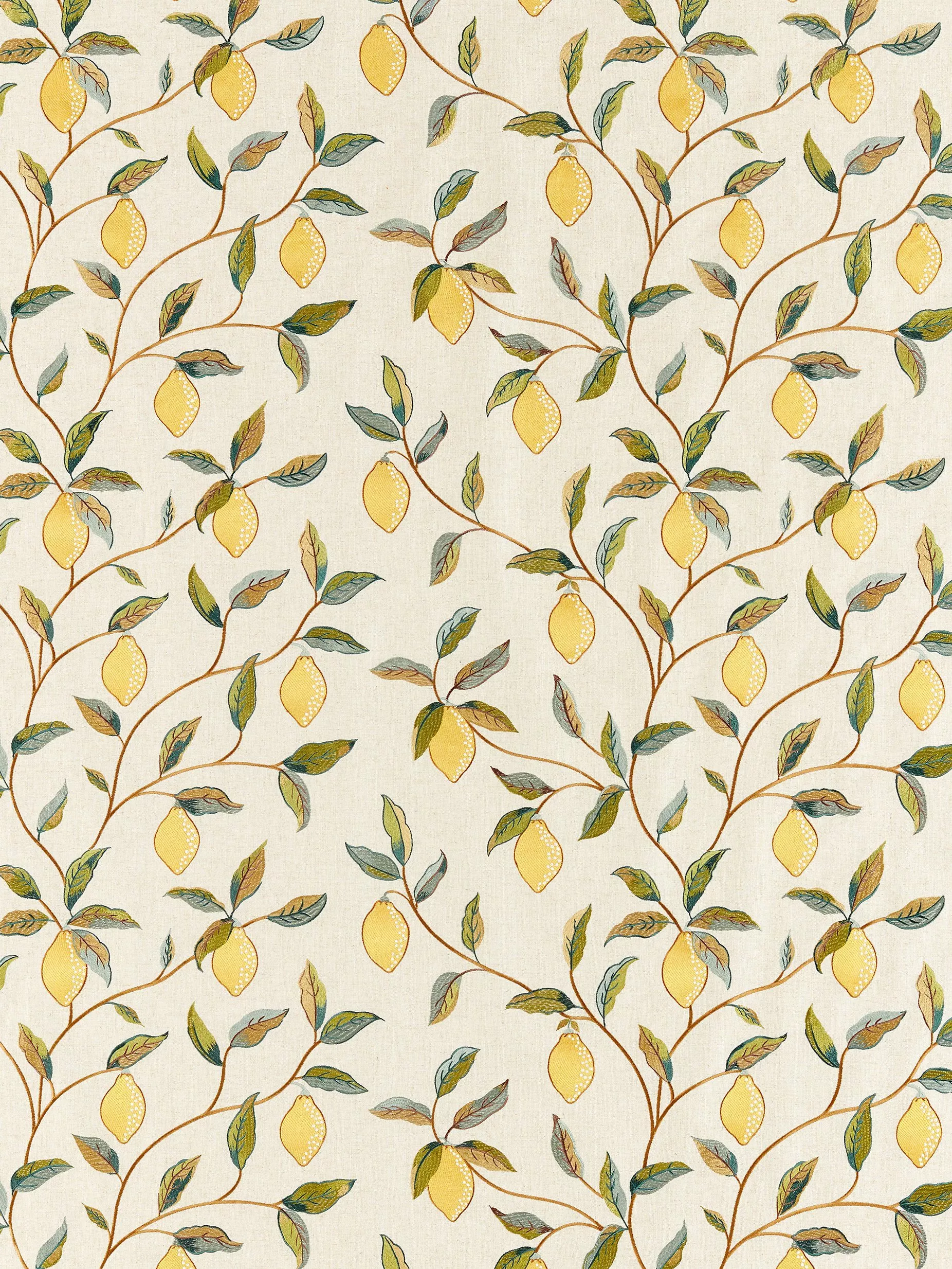 A finely embroidered fabric from Morris & Co., Lemon Trees features trailing branches and delicate blossom.