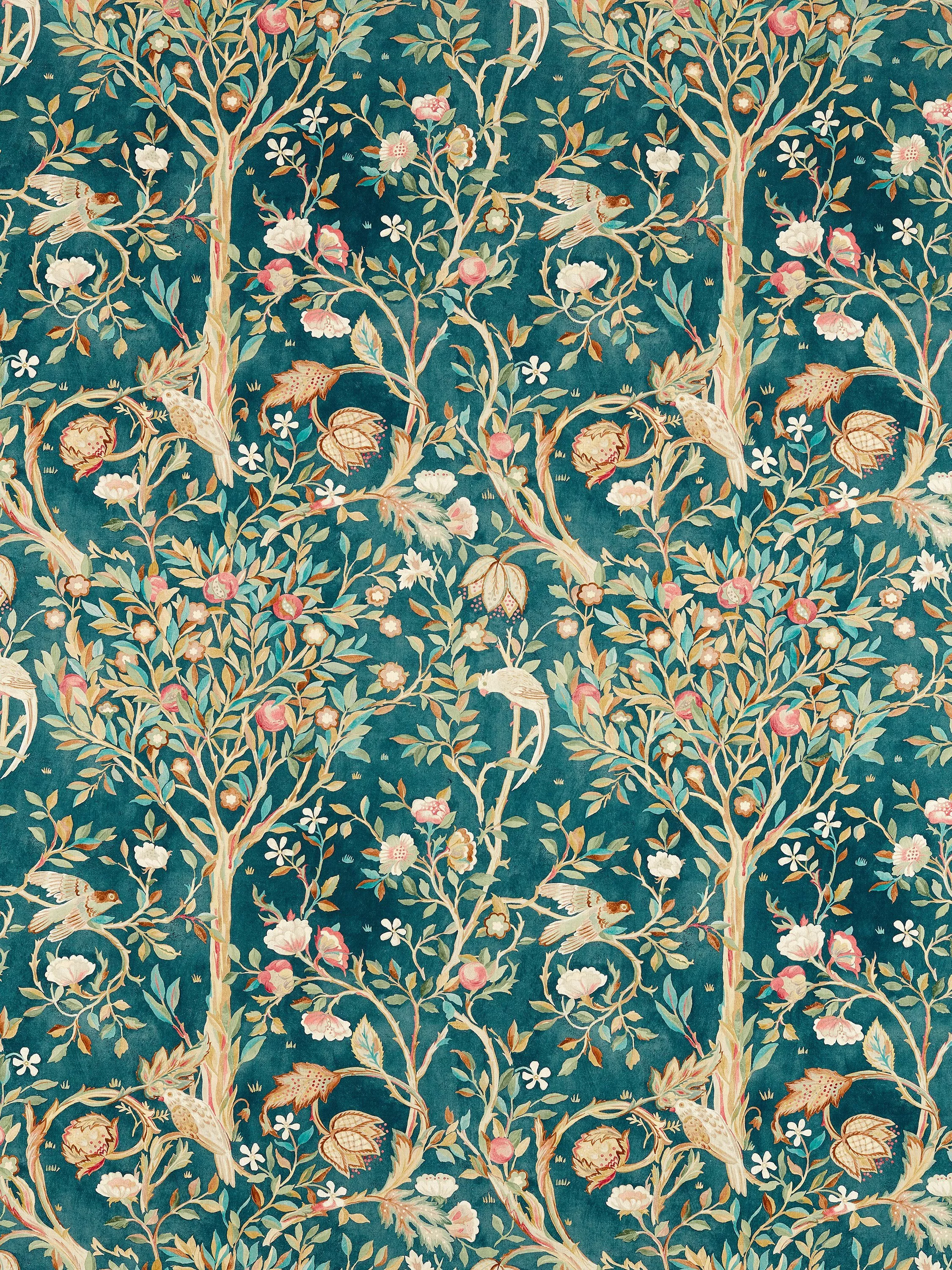 A new design by Morris & Co. based on a version from Morris' home of Kelmscott Manor, Melsetter is a linen blend fabric with a printed design of birds and flowerheads surrounding a central fruit tree.