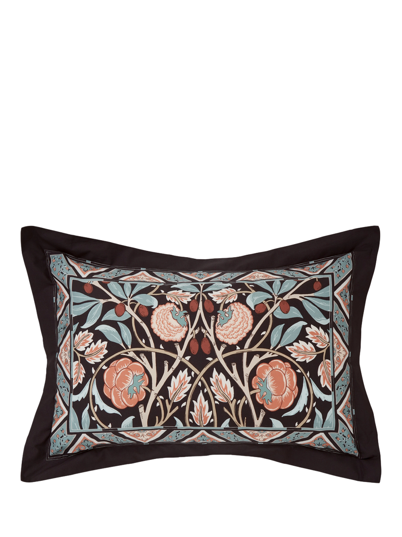 Originally created for a cushion or firescreen kit, now held in the V&A, this exquisite pattern features thorned roses spiralling around olive branches. Framed by a bold patterned border around the duvet cover and pillowcases, inspired by the rich colours and intricate patterns of stained-glass windows by Edward Burne-Jones on display in the Morris Room at the V&A, the border adds a touch of elegance.
