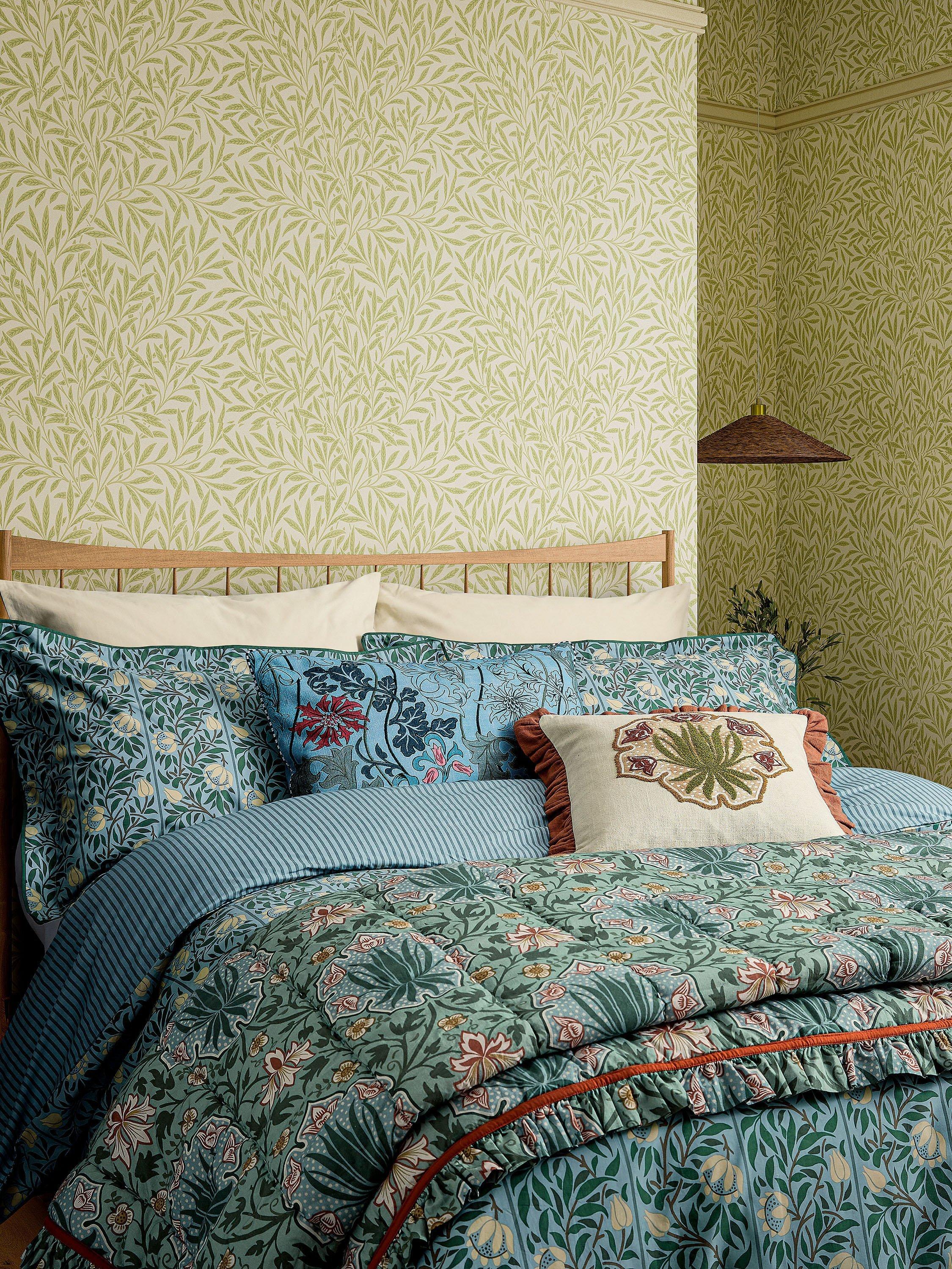 Originally intended as a border design, the pattern has been joined as an all-over stripe, with a climbing trellis and stylised florals forming a subtle ogee pattern. The Peony Trellis design has been beautifully transformed for bedding, featuring a tonal reverse stripe, printed across 200 thread count cotton percale.