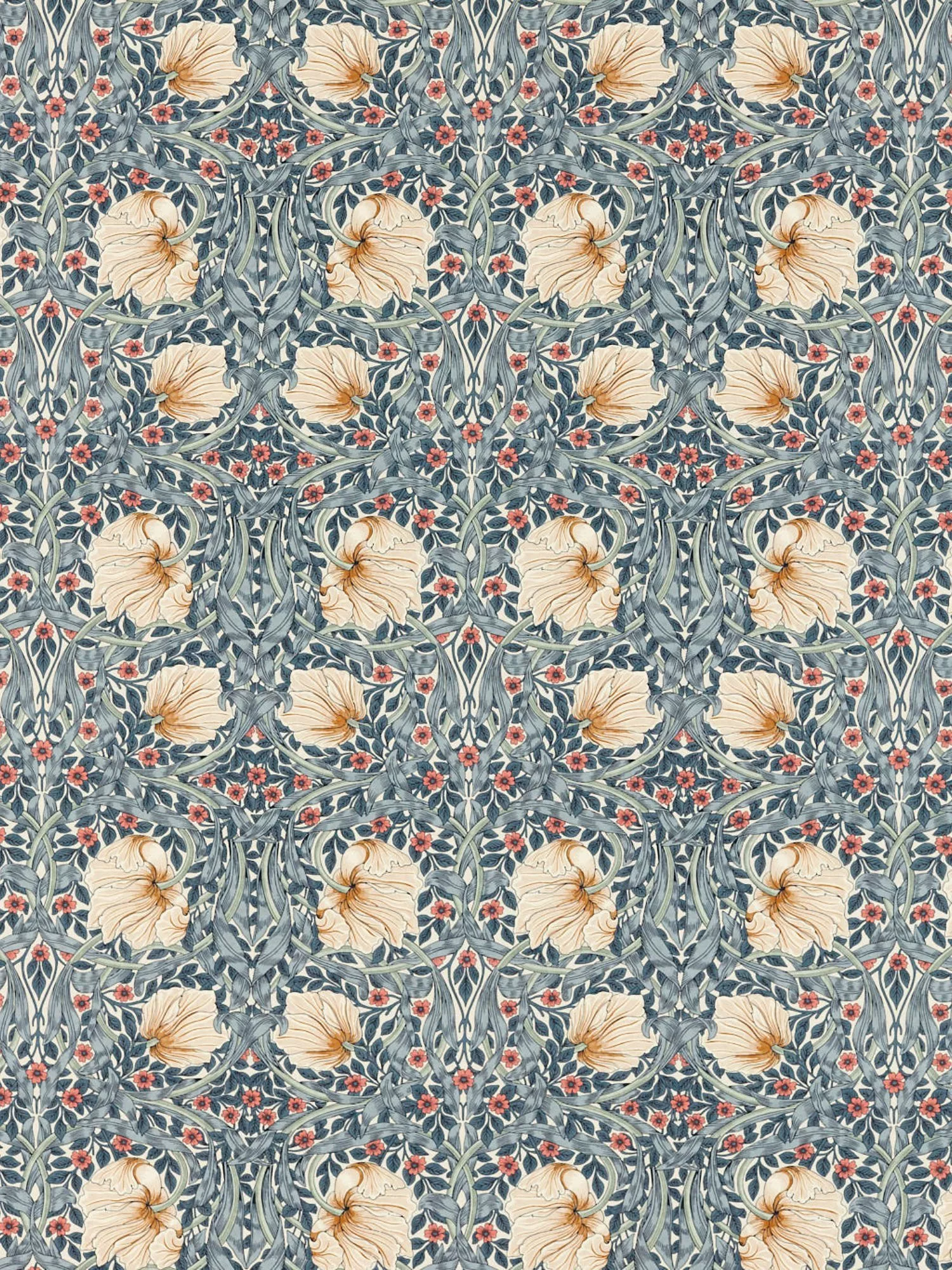 William Morris's 1876 design Pimpernel swirls tendrils bowed in the wind. Still beloved today for its virile energy and tender floral form it was the design of choice for William Morris himself when decorating his dining room in Kelmscott Manor, Oxfordshire.