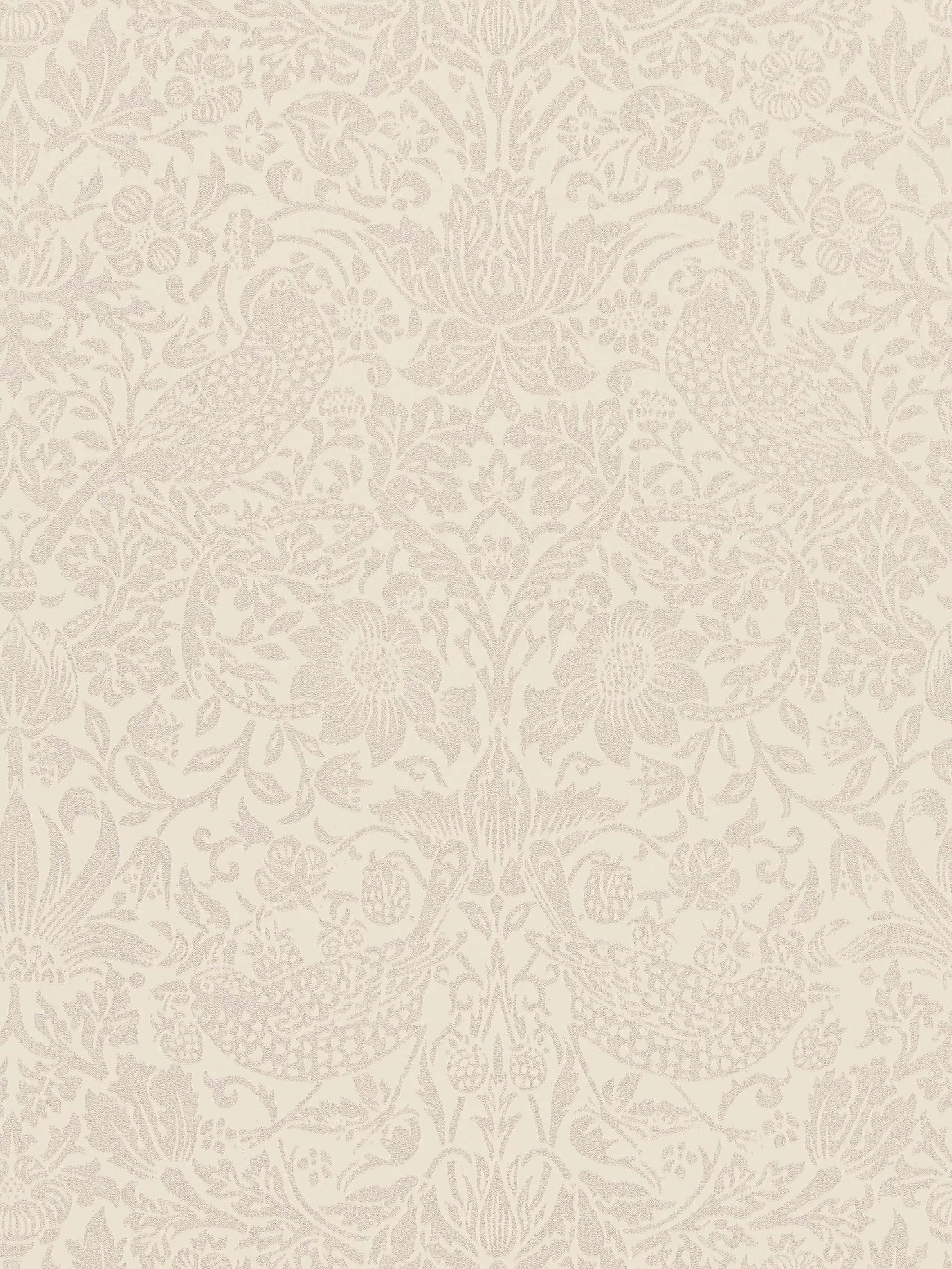 Originally a fabric designed by Morris in 1883, Strawberry Thief was first indigo discharge printed at Merton Abbey. Translated onto wallpaper for the first time in 2013, for this collection it has been re-painted in one colour at the same time retaining the exquisite detail of the multi-coloured original. Inspired by wallpapers in the Morris & Co. archive which used crushed glass techniques, we have used beading to create a superb, shimmering, contemporary flock effect wallcovering.
