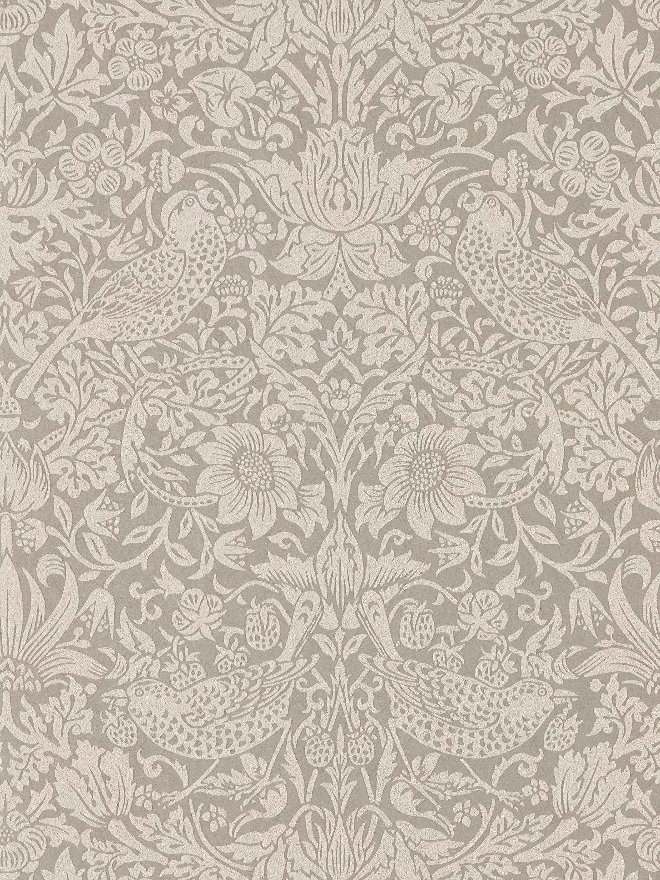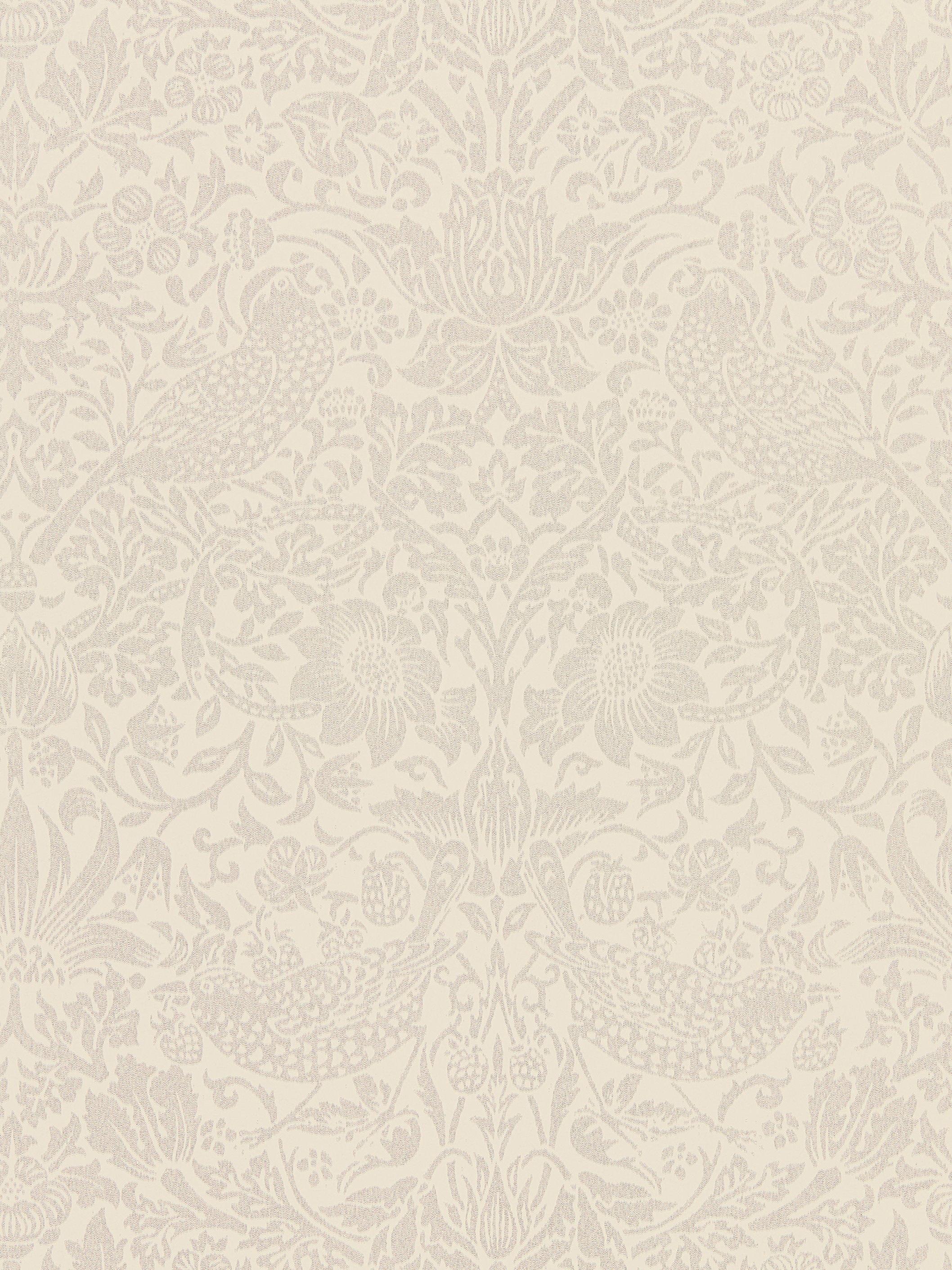 Originally a fabric designed by Morris in 1883, Strawberry Thief was first indigo discharge printed at Merton Abbey. Translated onto wallpaper for the first time in 2013, for this collection it has been re-painted in one colour at the same time retaining the exquisite detail of the multi-coloured original. Inspired by wallpapers in the Morris & Co. archive which used crushed glass techniques, we have used beading to create a superb, shimmering, contemporary flock effect wallcovering.