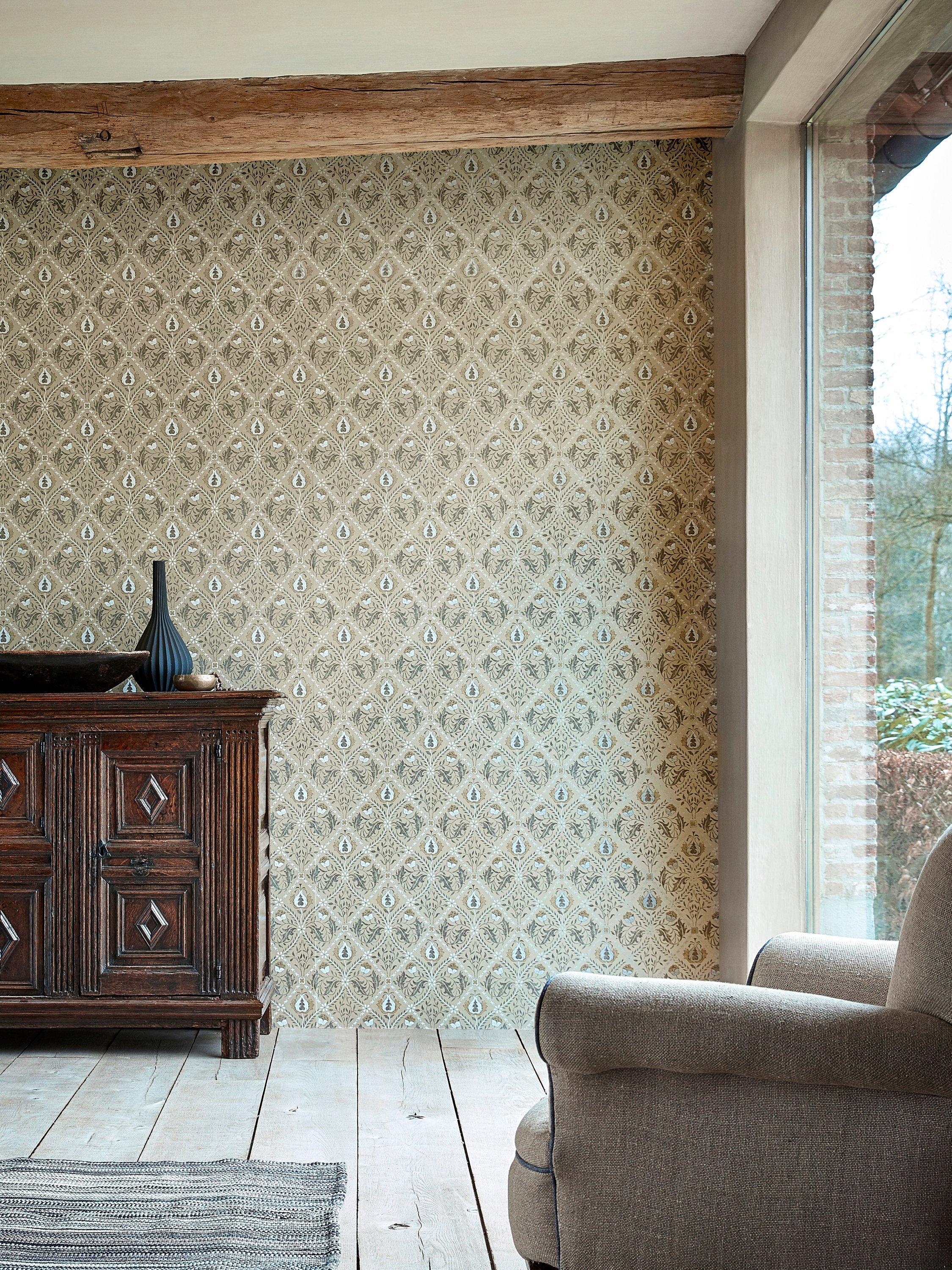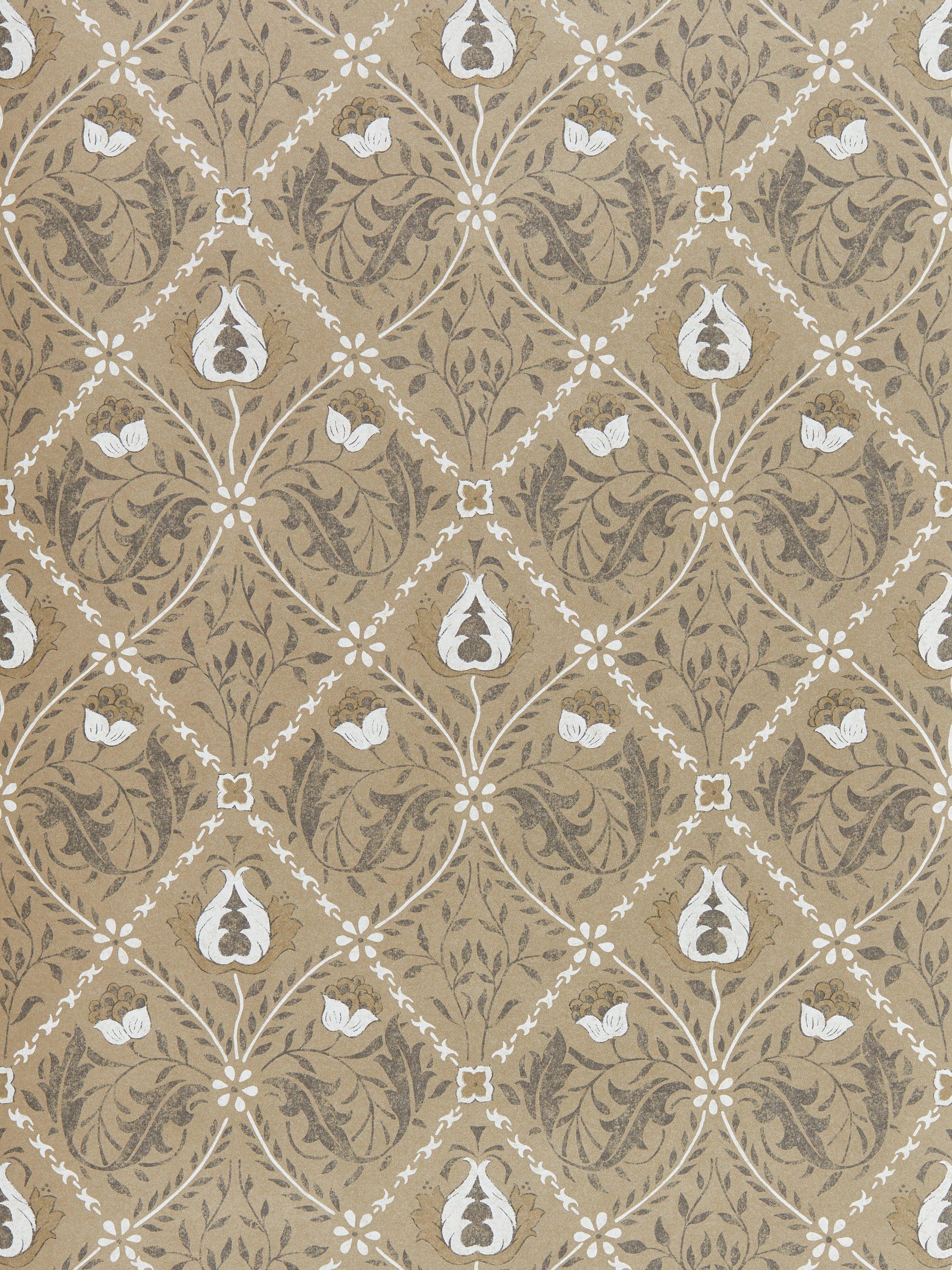 Adapted from the Indian Diaper block print of 1875, Pure Trellis has been elongated to enhance the trellis repeat, the motifs have been redrawn and refined with the addition of a slightly worn and irregular textural effect running throughout.