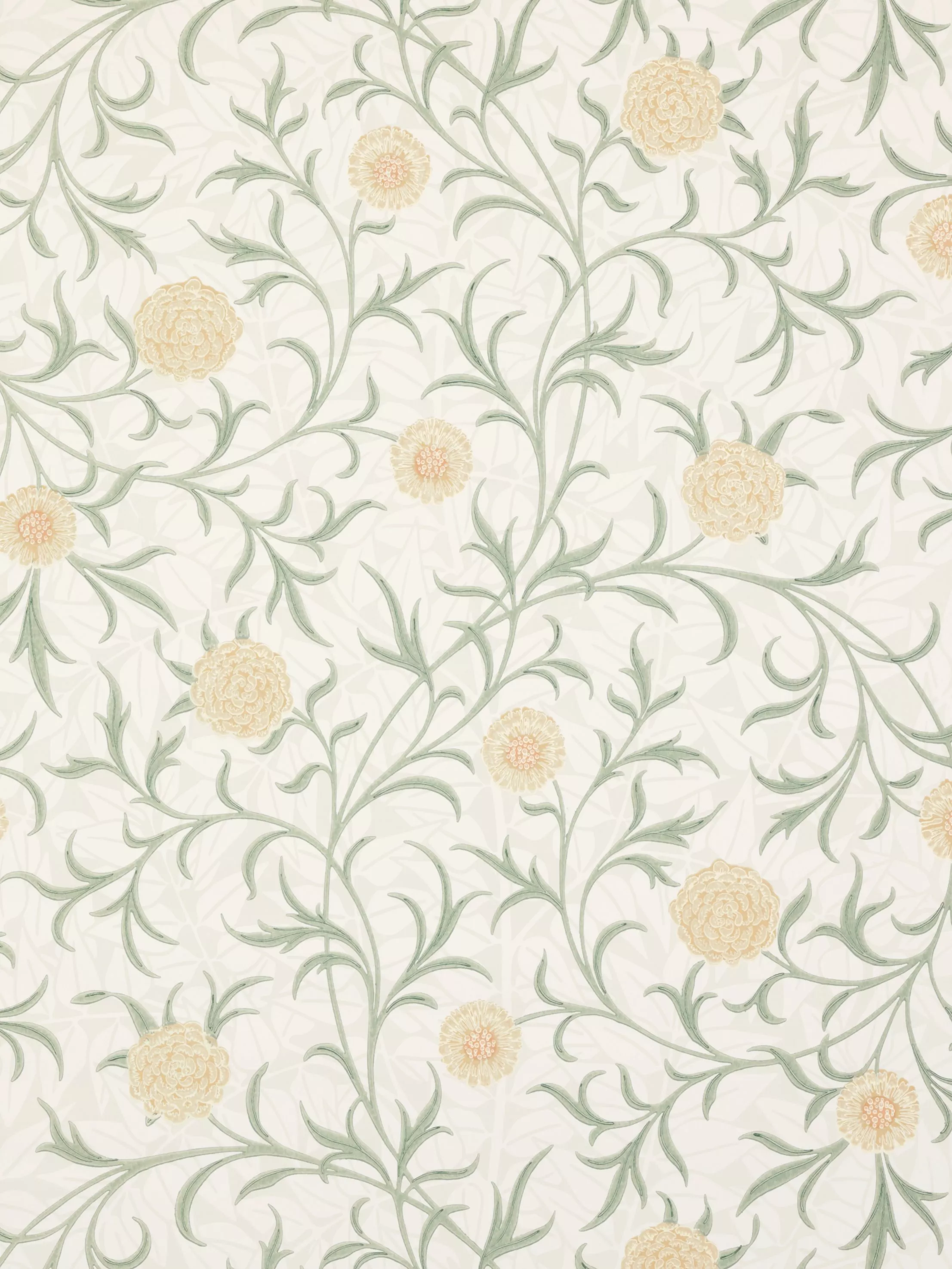 A showcase of William Morris' fascination with Medieval illustration, on a smaller and more delicate scale. The design features gently meandering marigold flowers and fronds.