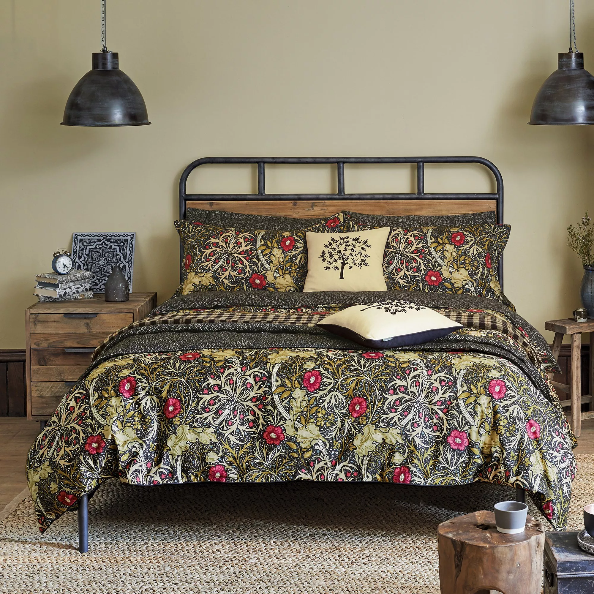 Taken from an original design by J. H. Dearle, dating back to 1901, the pattern of this stunning bedding captures the beautiful underwater movement of plants. Printed in a moody palette of black, red and sepia tones, it will make a statement in any bedroom.