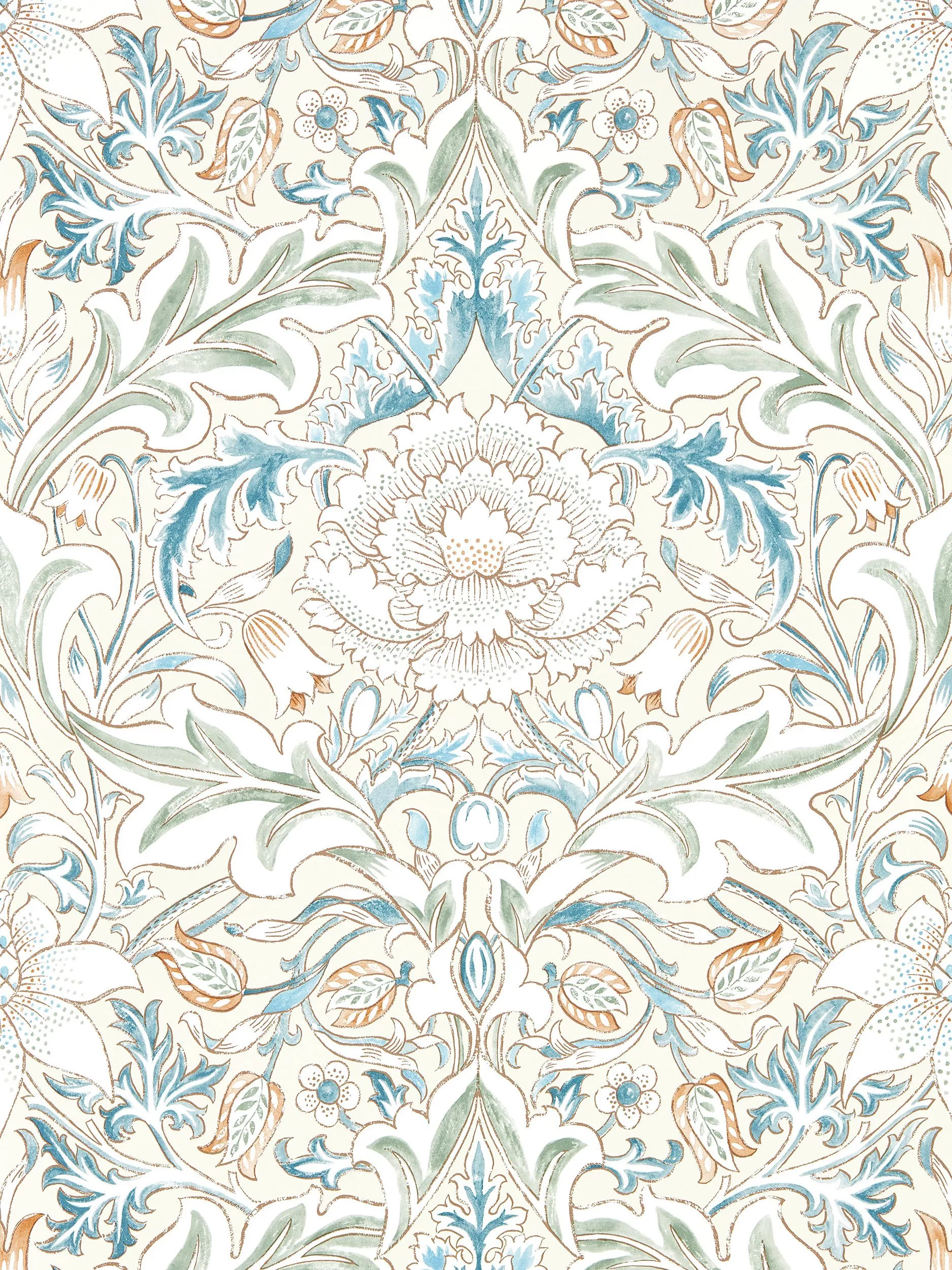 Slightly larger in scale than its fabric counterpart, "Severne" was originally printed at Morris's Merton Abbey workshop in South London. An elegant damask of acanthus leaves framing a central flowerhead.