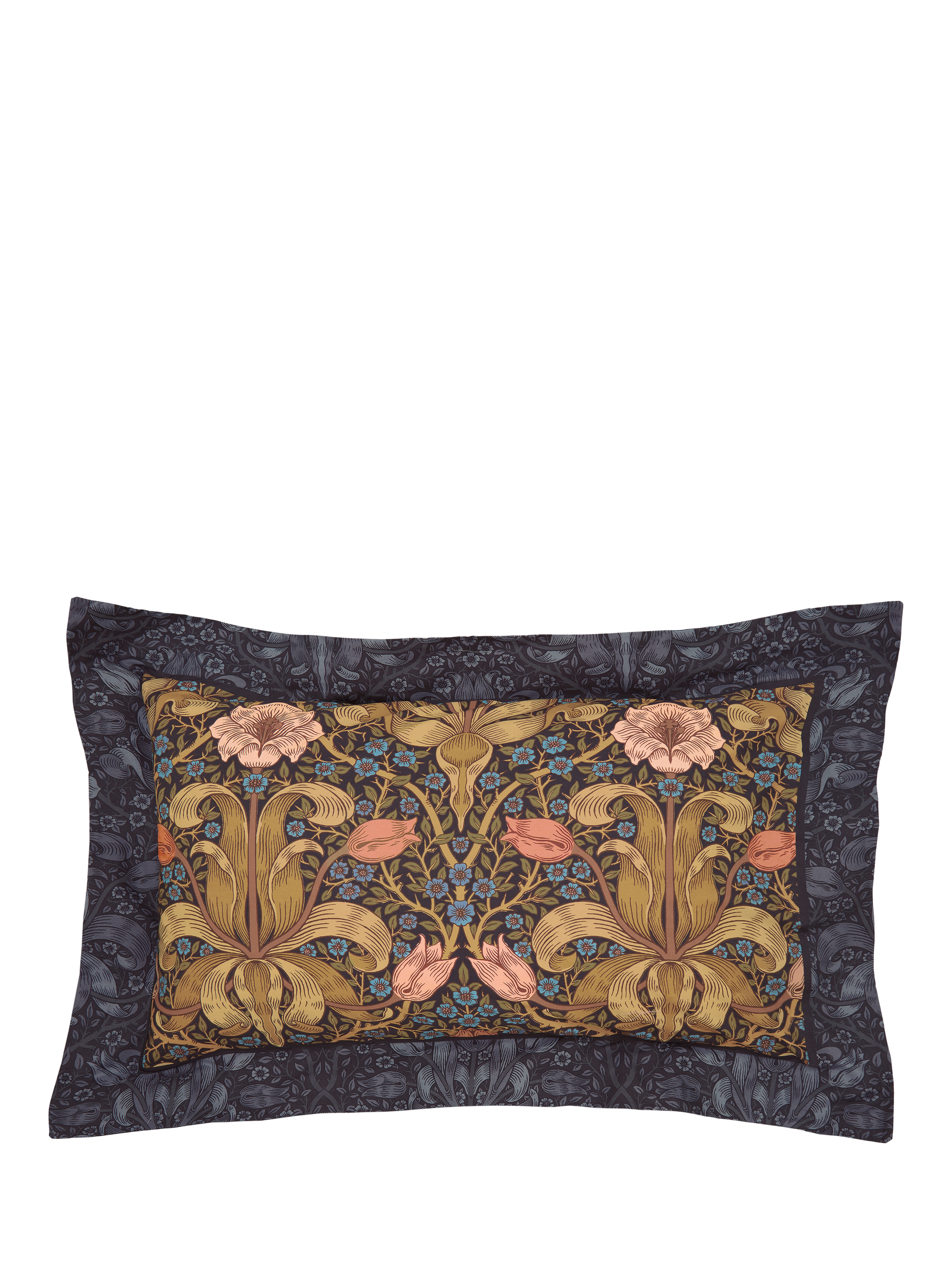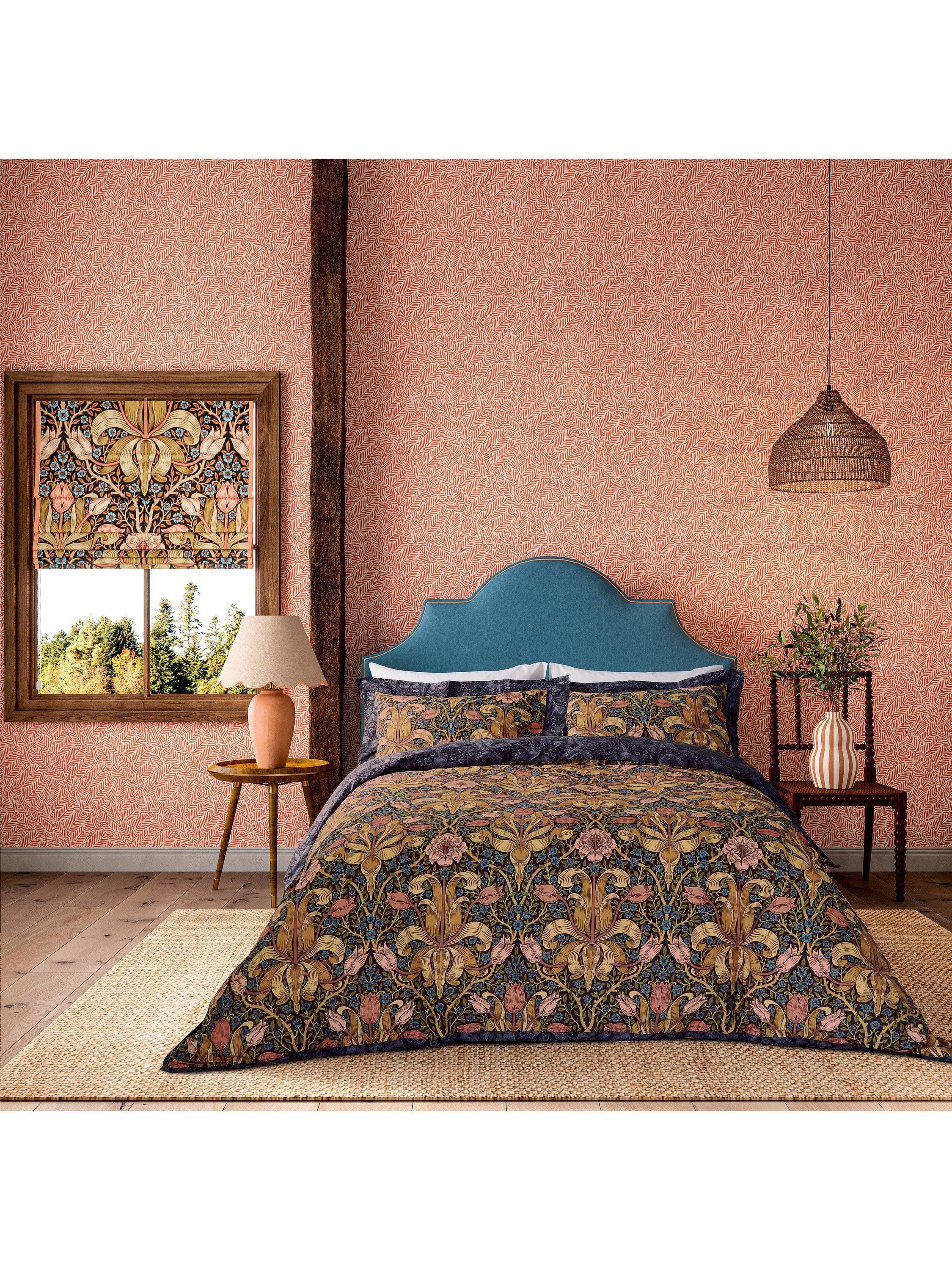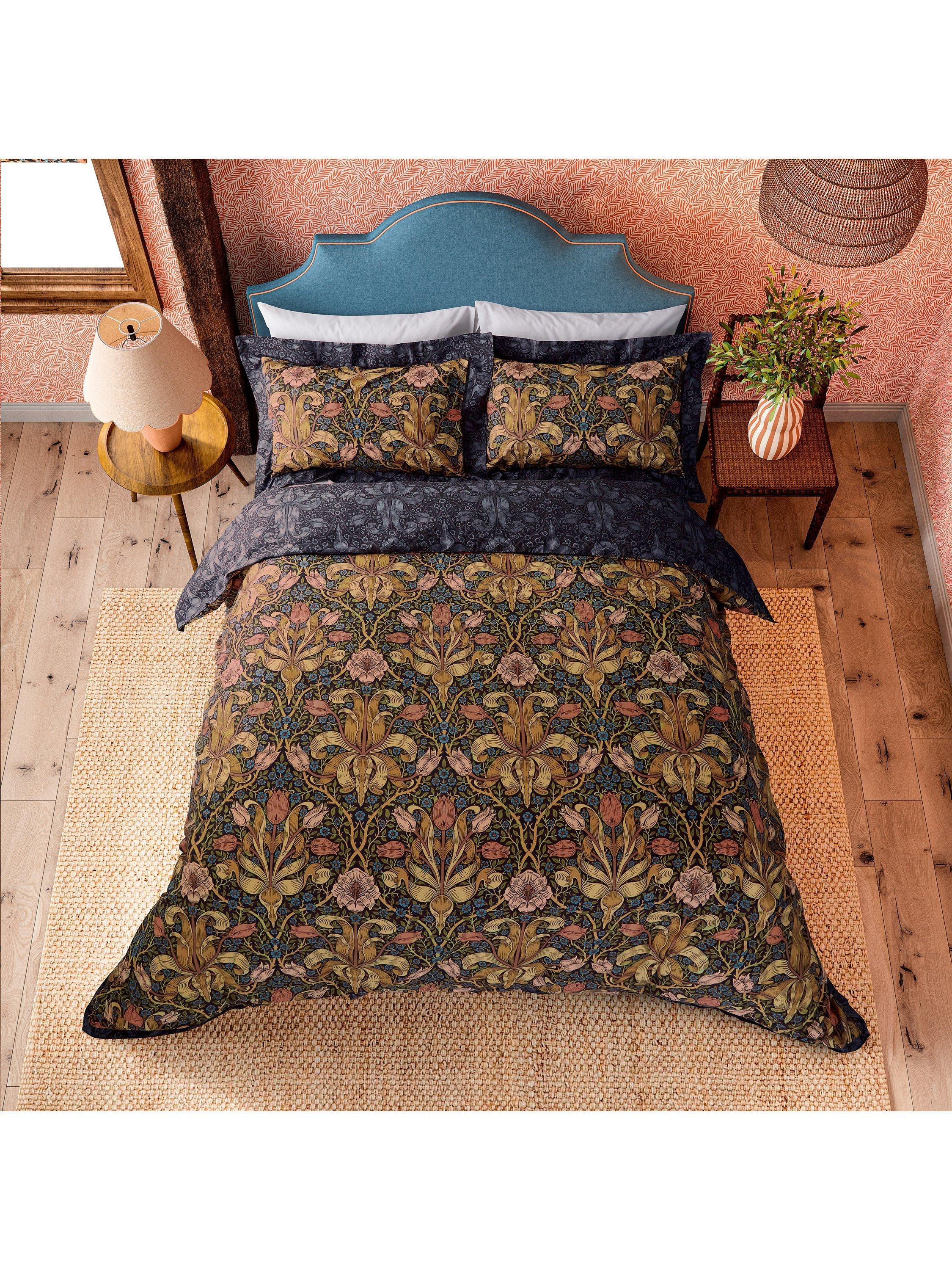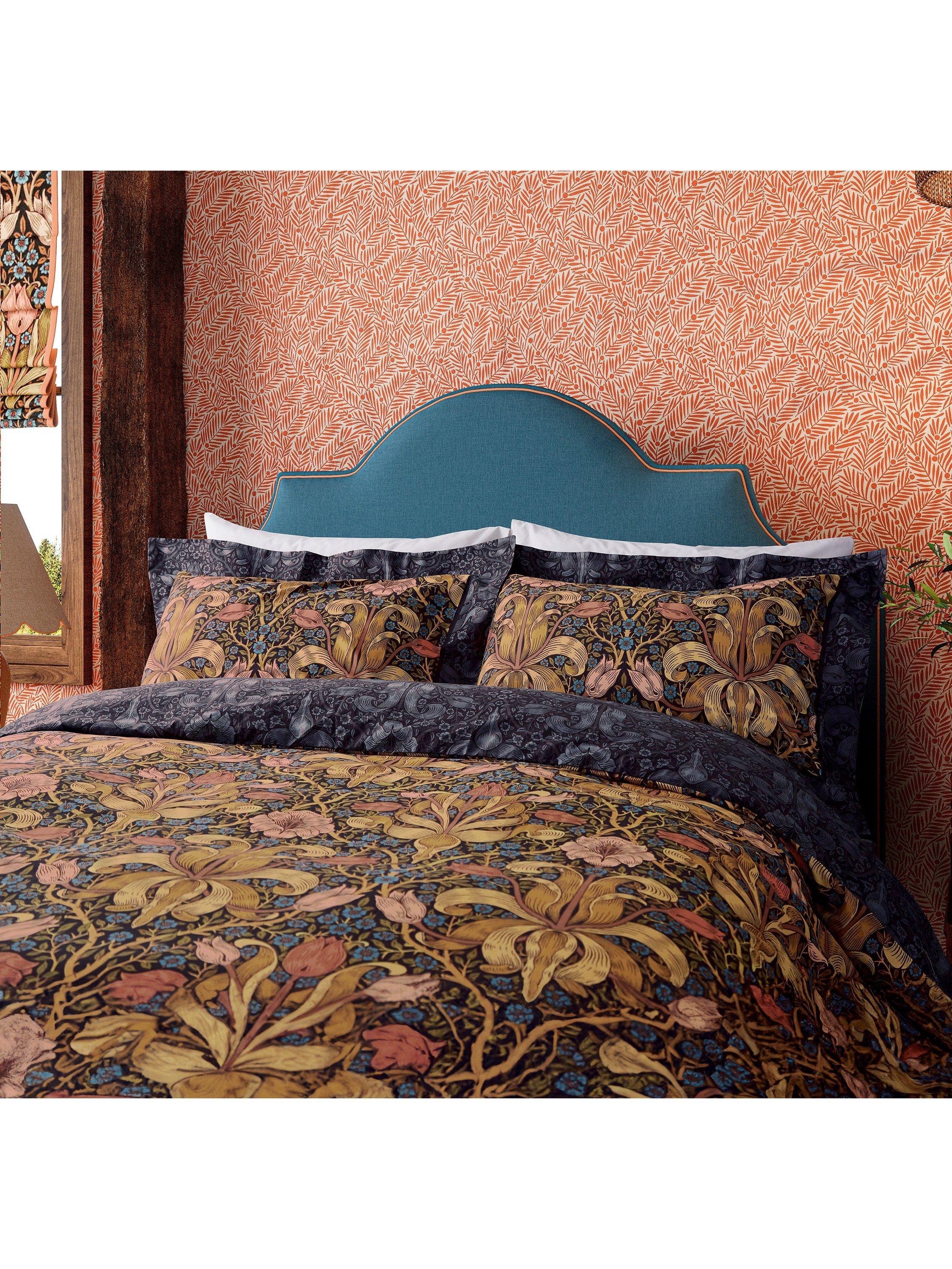 William Morris's last-ever pattern - made originally for wallpaper - is a mysterious brooding design from 1894. The beguiling tulip heads and unfurling foliage lend the impression the flowers could just lurch free from the covers. The pattern transfers beautifully into bedding with Spring Thickets midnight colouring counterpart on the reverse of the duvet, creating a day and night offset.