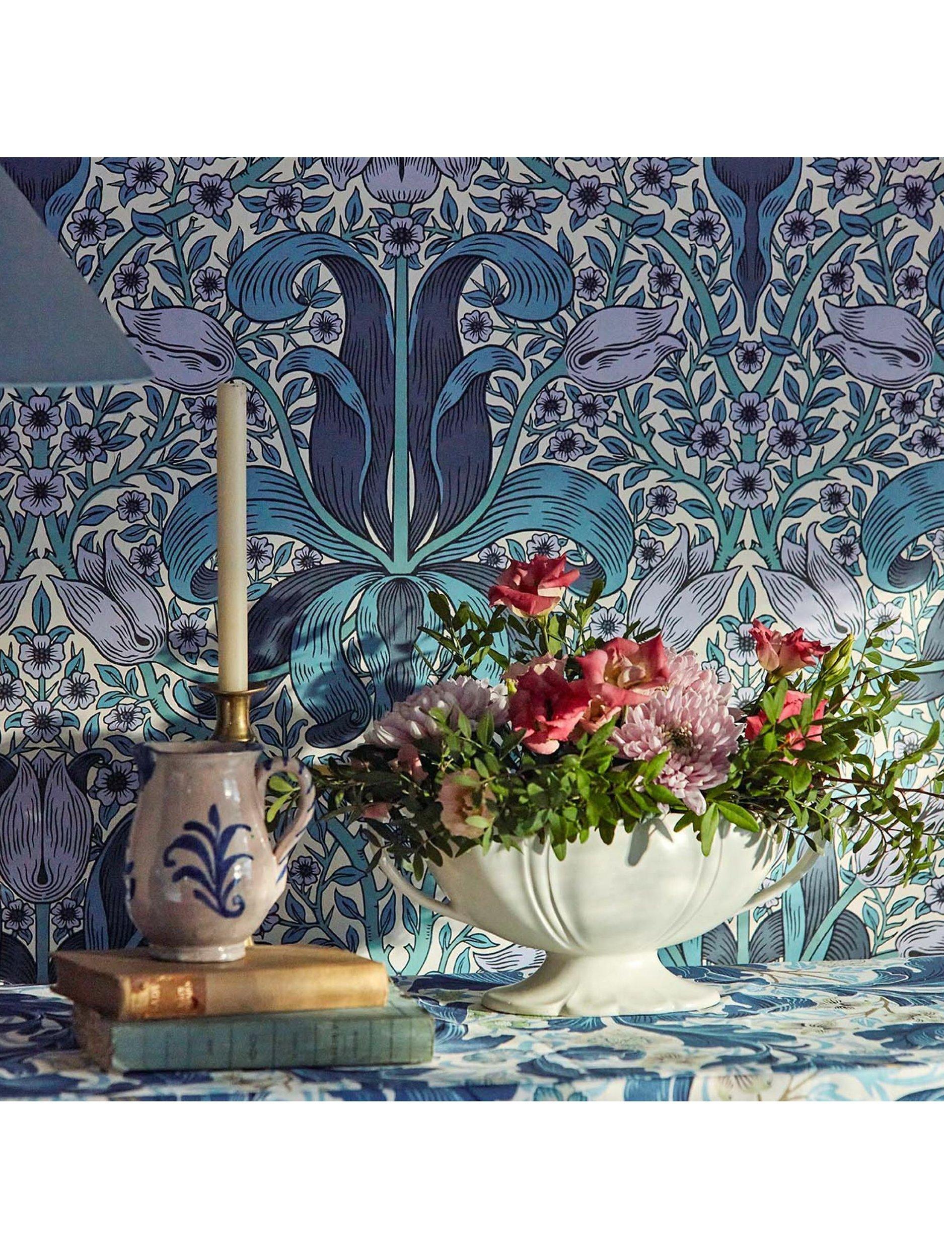 William Morris's last-ever pattern made for wallpaper is a mysterious, brooding design from 1894. Made in the UK, this wallpaper highlights the beguiling foliage folds and tulip heads, lending the impression the flowers might lurch free of the paper's surface.
