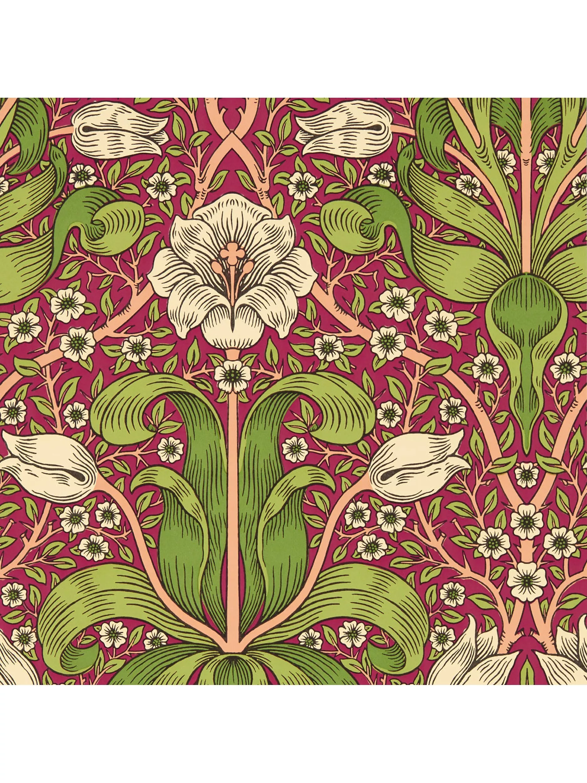 William Morris's last-ever pattern made for wallpaper is a mysterious, brooding design from 1894. Made in the UK, this wallpaper highlights the beguiling foliage folds and tulip heads, lending the impression the flowers might lurch free of the paper's surface.