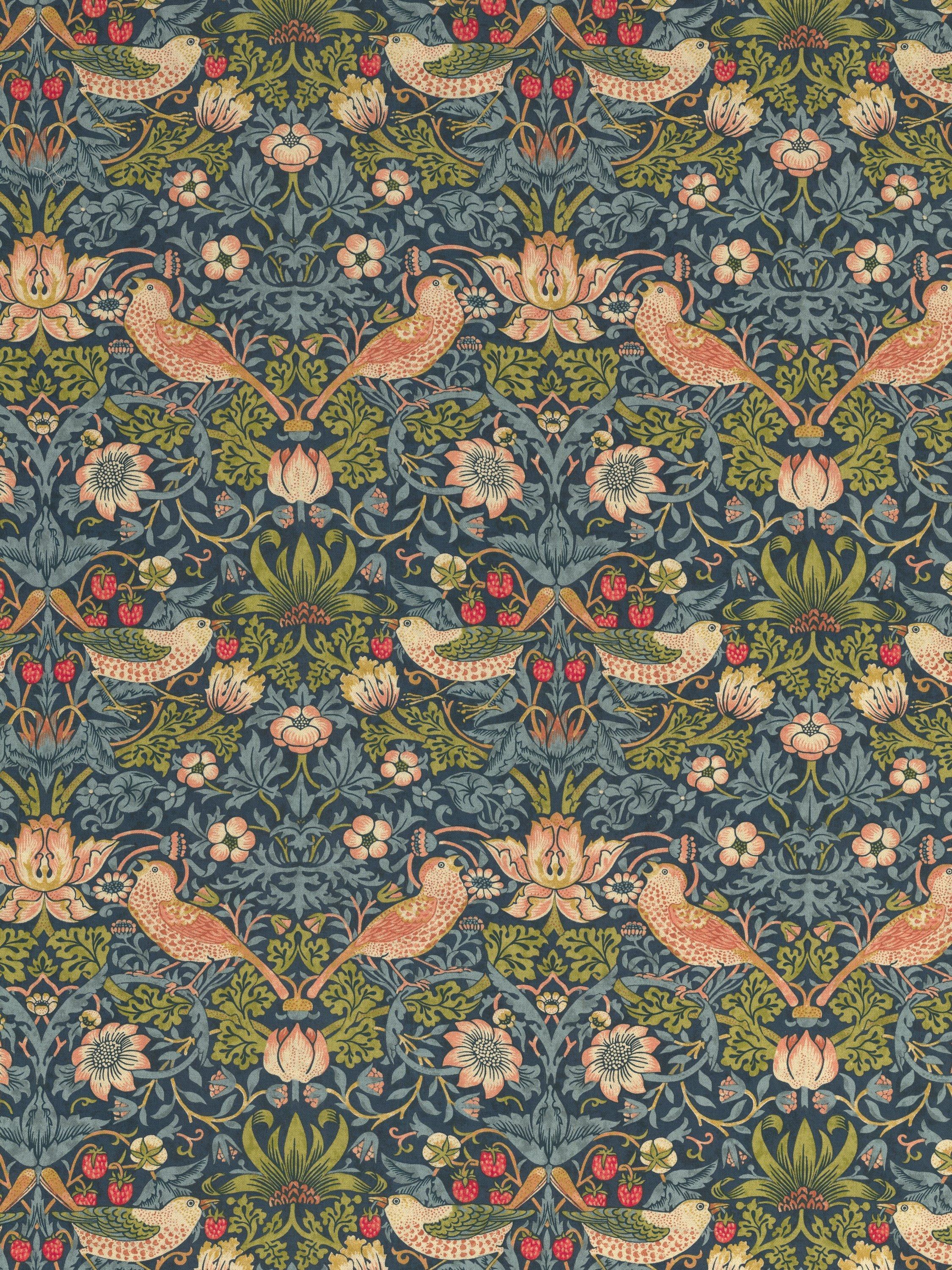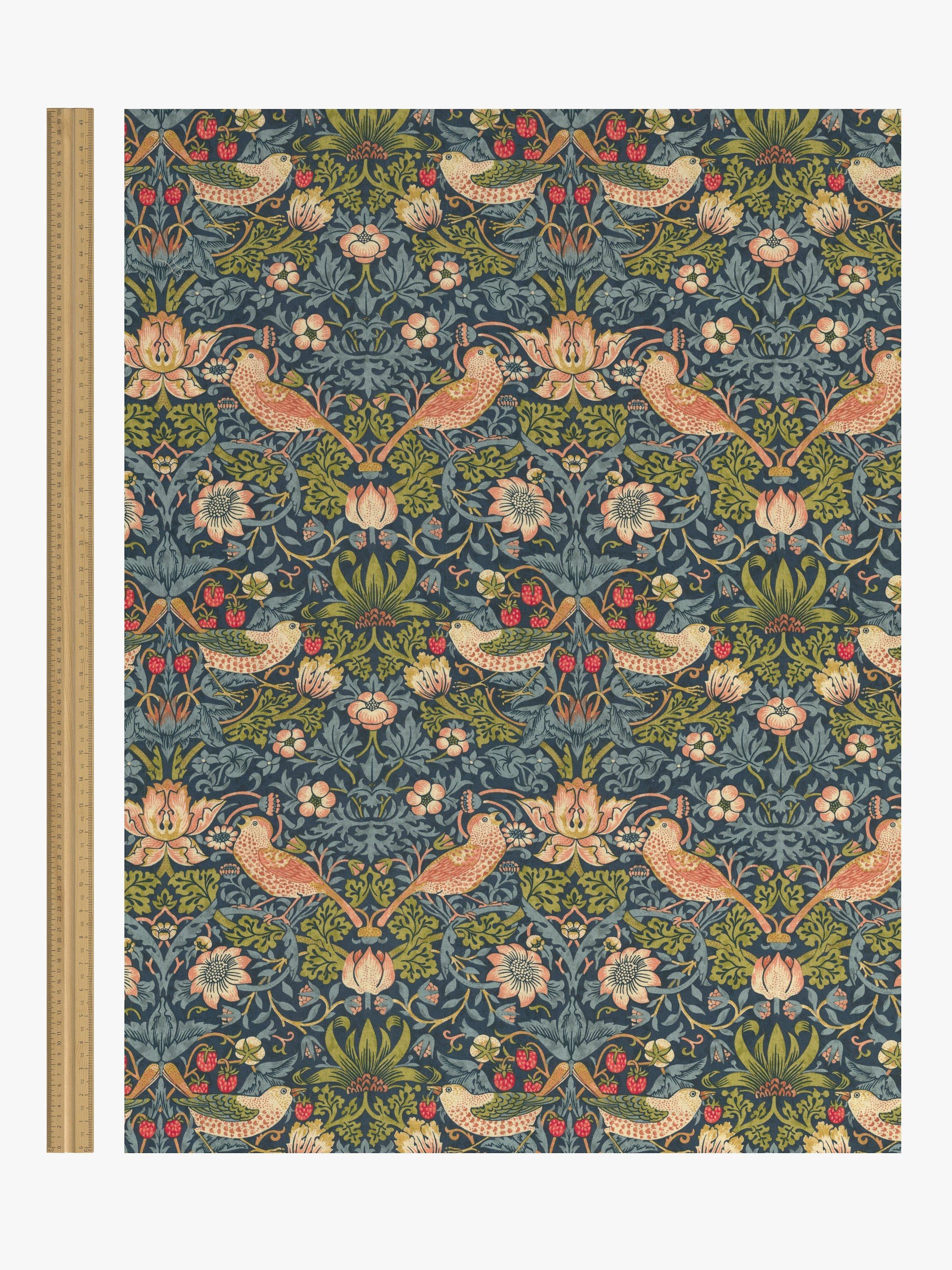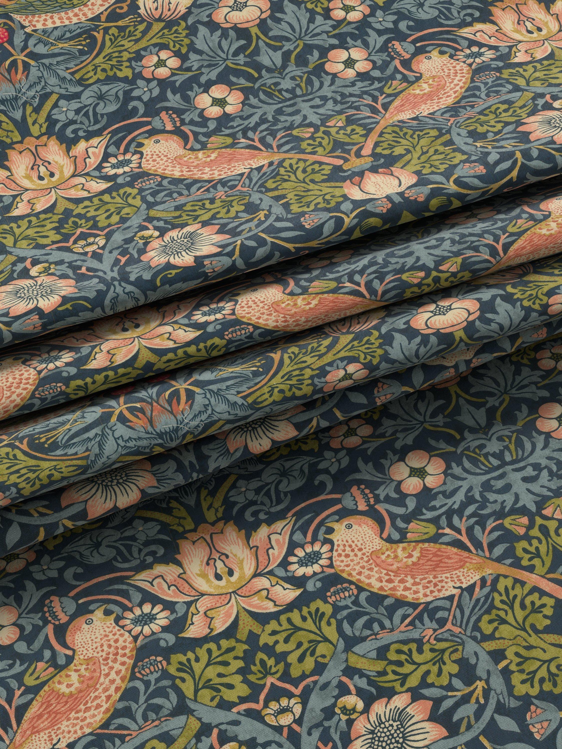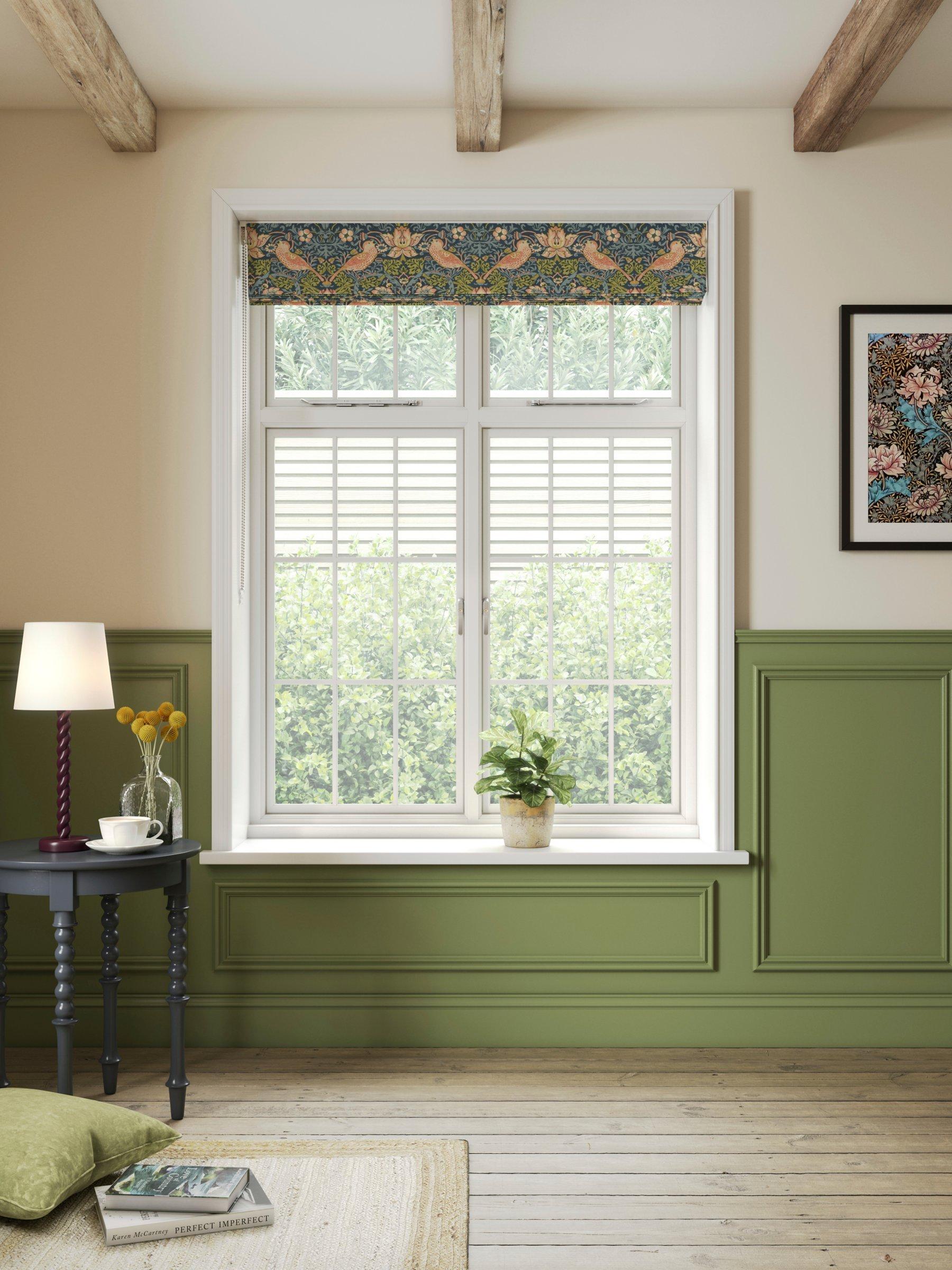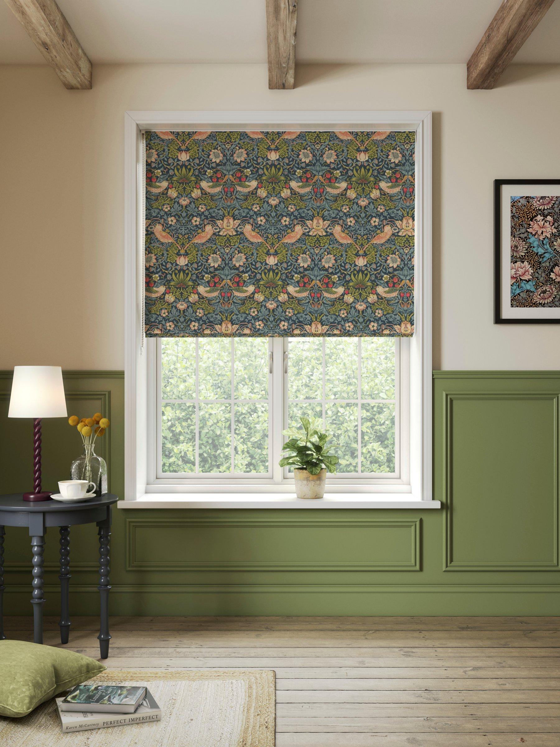 A printed cotton Roman blind featuring one of William Morris's most well known designs, Strawberry Thief.