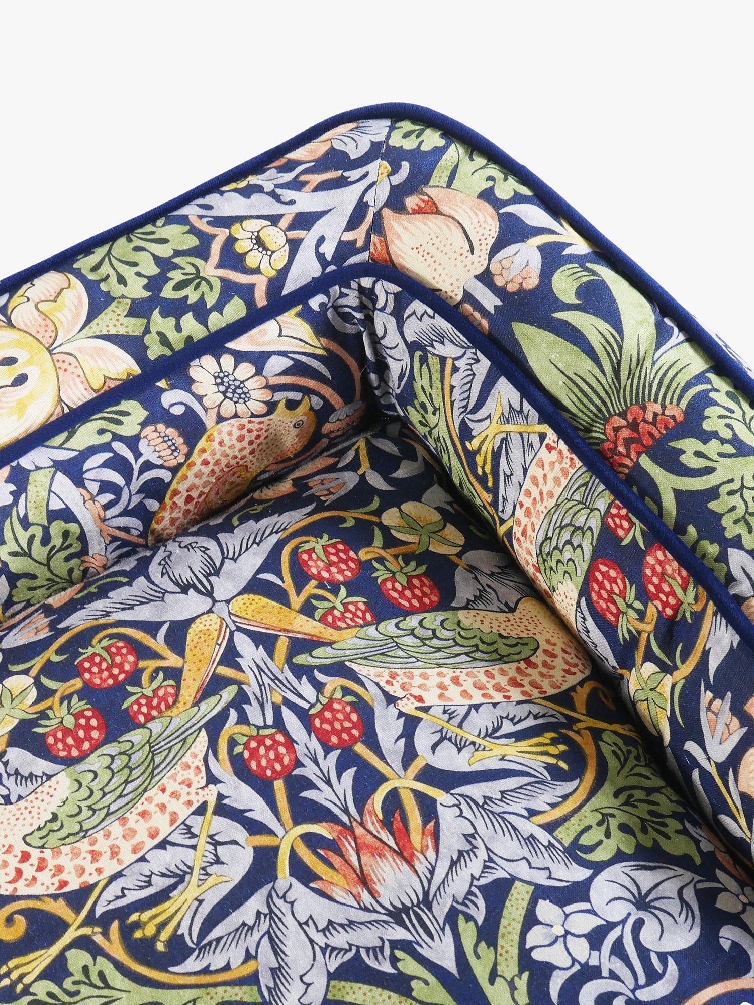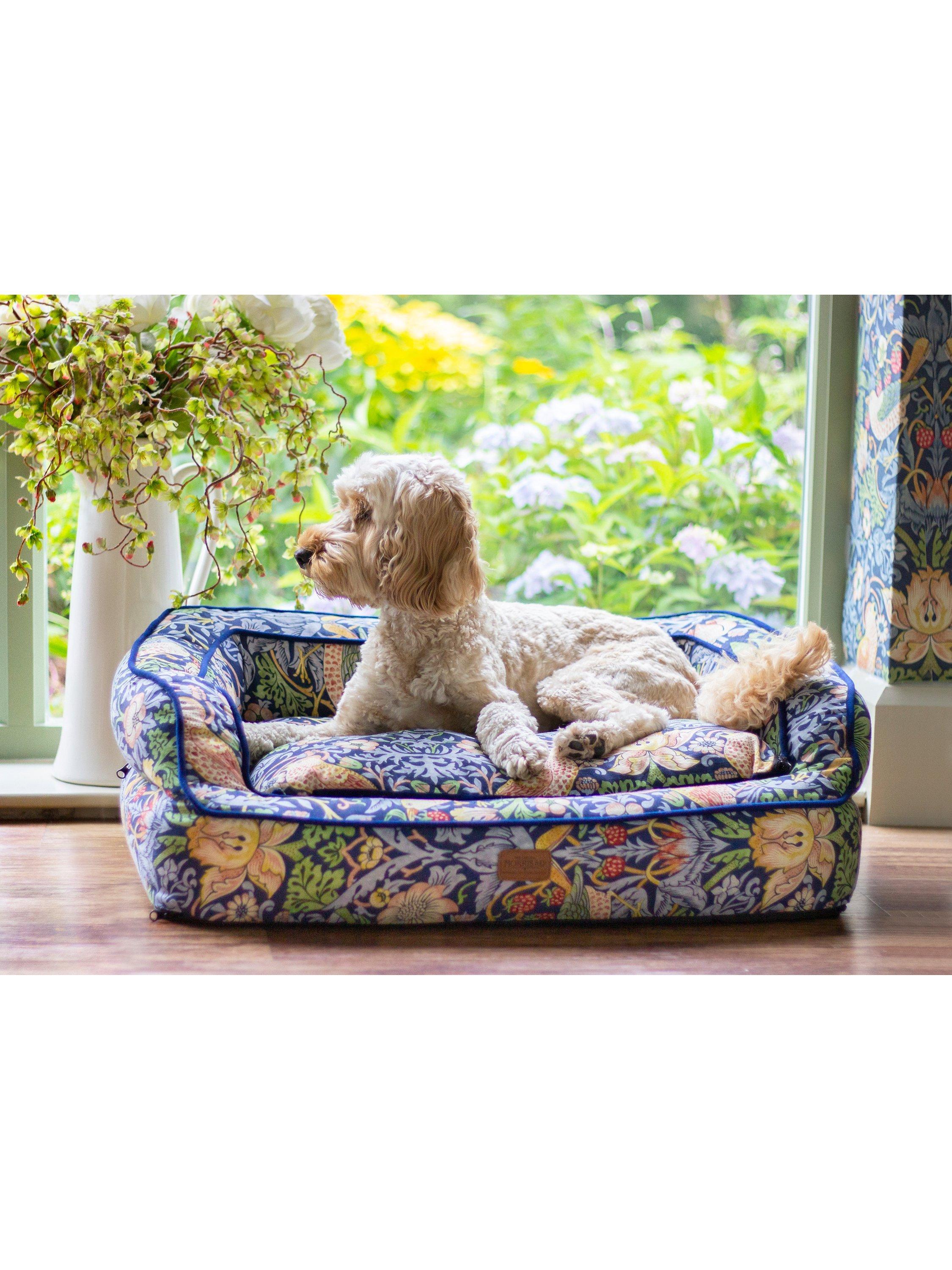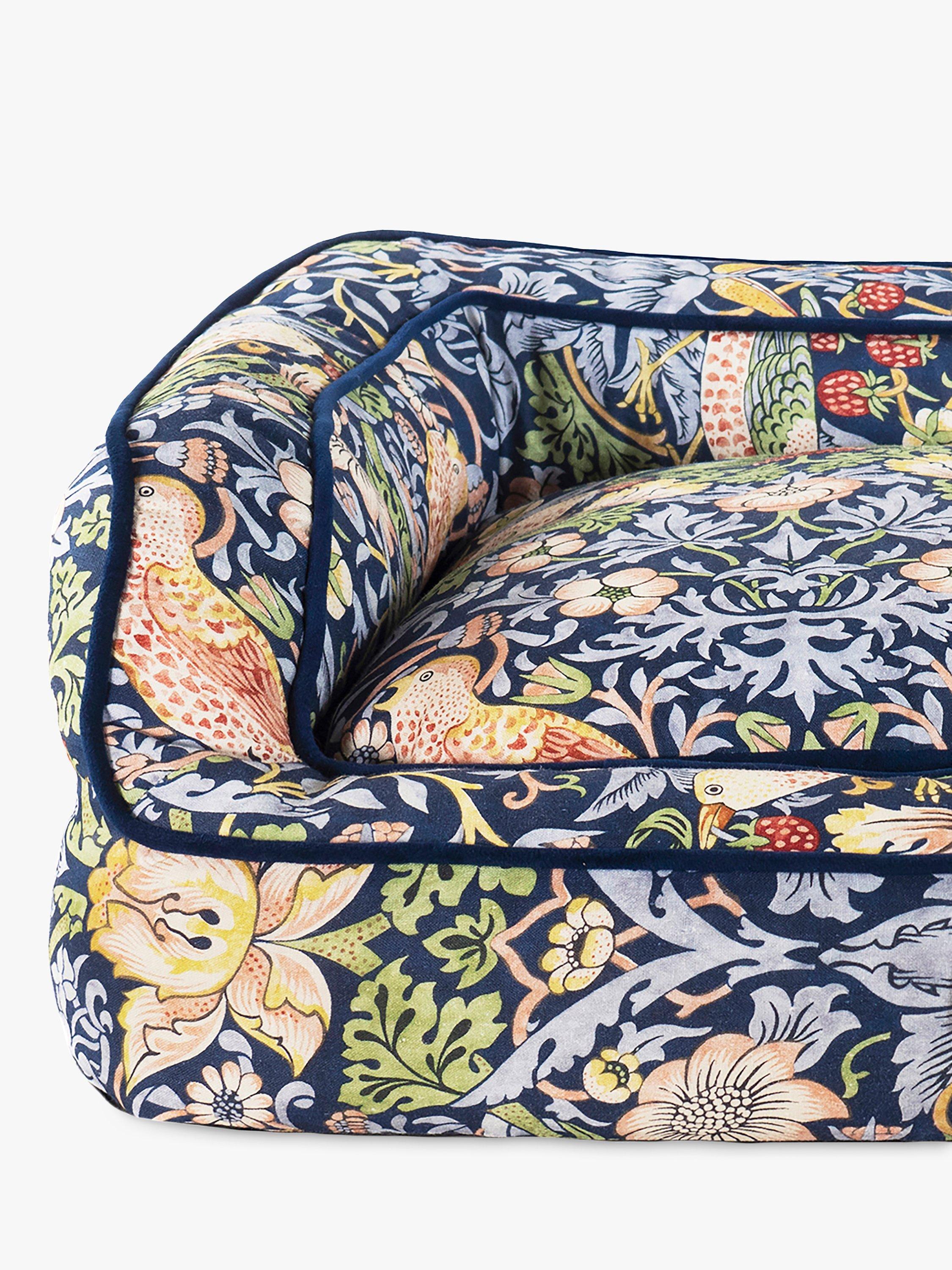 A cheeky bird pecks at delicious strawberries. The thrushes illustrated in William Morris’ Strawberry Thief have been stealing hearts, as well as strawberries, since 1883. As one of Morris’most recognisable prints, the Strawberry Thief captures the classic luxury of Morris’ style. Crafted from a hard-wearing yet super-soft cotton blend this bed provides pets with ultimate comfort. With supportive high sides and memory foam base, this orthopaedic bed is the epitome of luxury. Comprising of a reversible inner cushion with contrasting velvet reverse, a fully removable cover and anti-slip base.