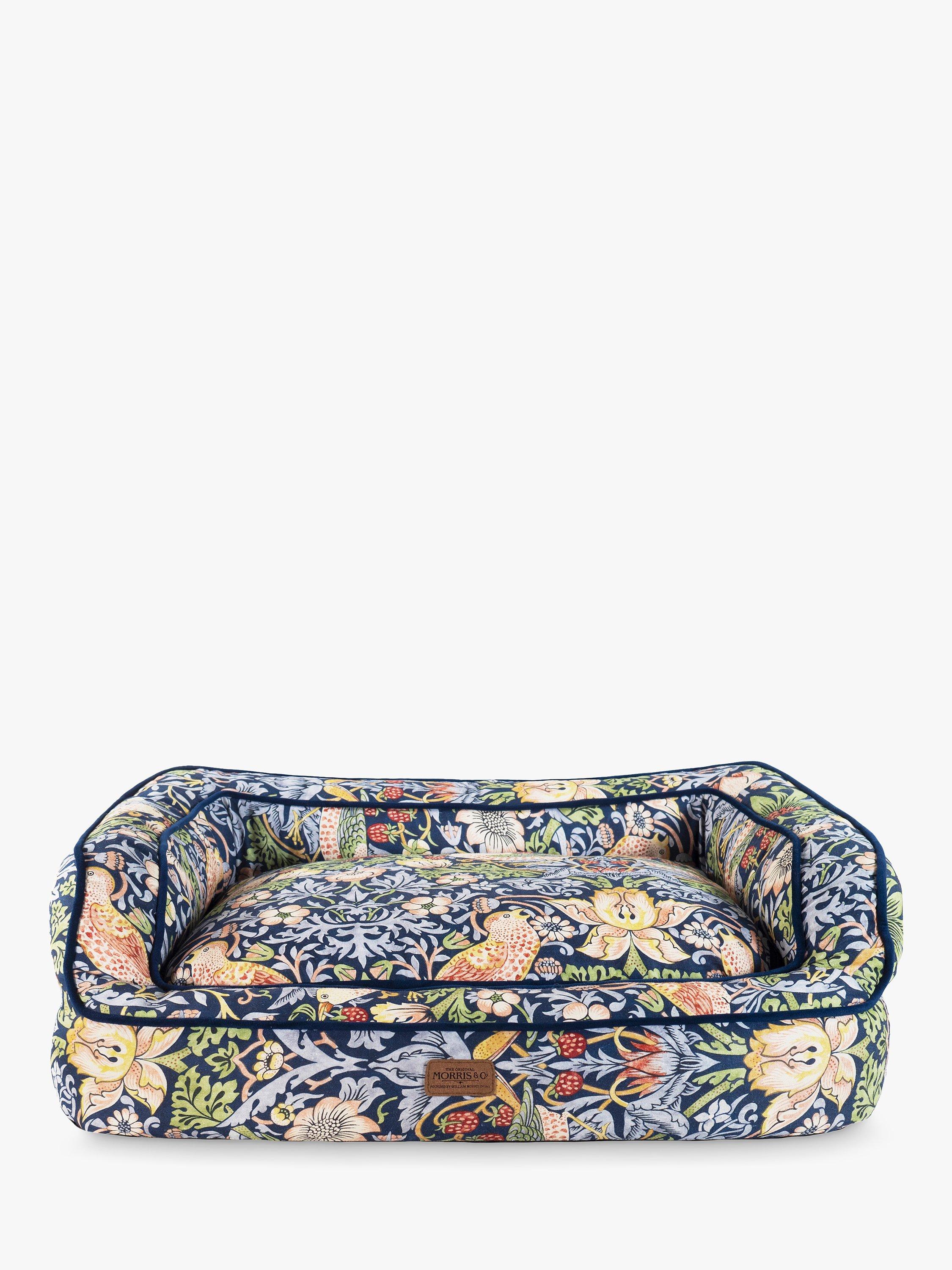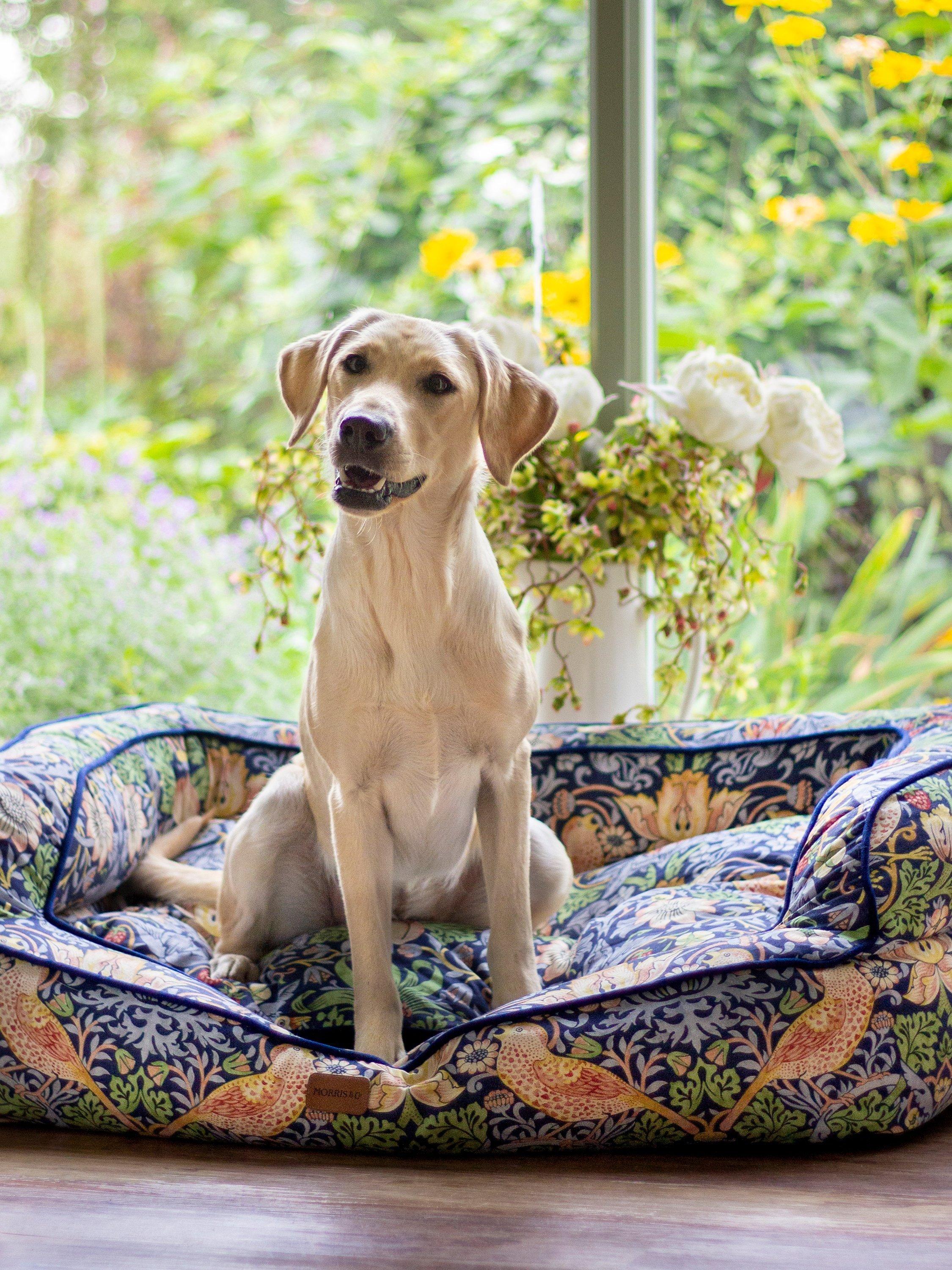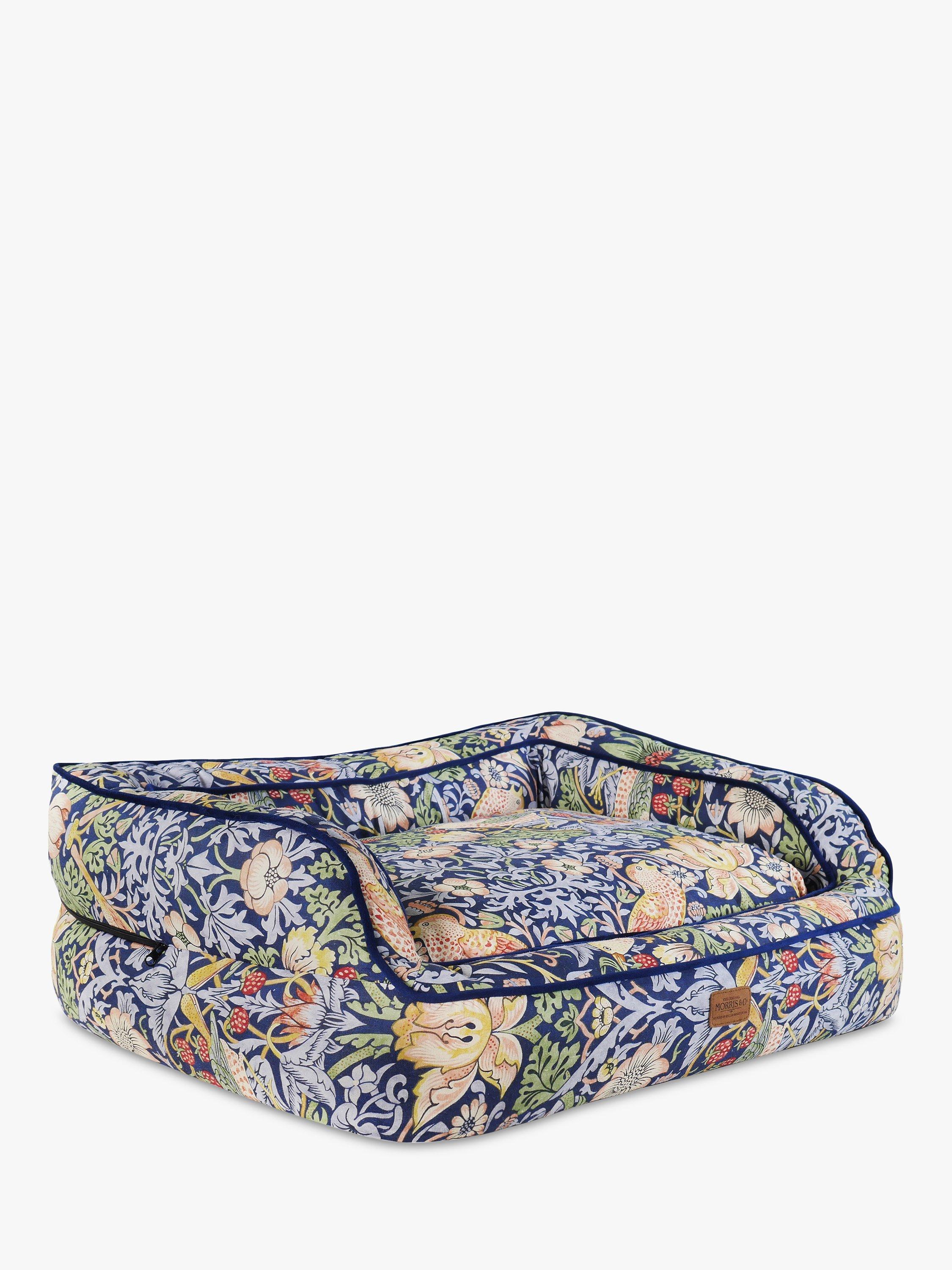 A cheeky bird pecks at delicious strawberries. The thrushes illustrated in William Morris’ Strawberry Thief have been stealing hearts, as well as strawberries, since 1883. As one of Morris’most recognisable prints, the Strawberry Thief captures the classic luxury of Morris’ style. Crafted from a hard-wearing yet super-soft cotton blend this bed provides pets with ultimate comfort. With supportive high sides and memory foam base, this orthopaedic bed is the epitome of luxury. Comprising of a reversible inner cushion with contrasting velvet reverse, a fully removable cover and anti-slip base.