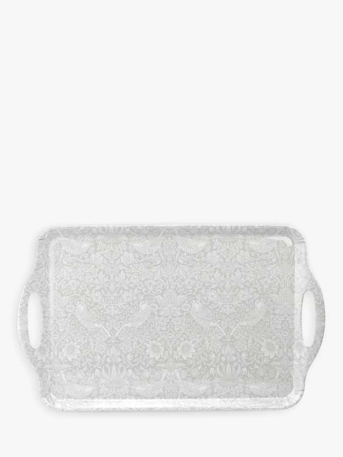 Made of lightweight melamine with large handles, this tray is inspired by a Morris & Co. heritage print, Strawberry Thief, from the archive of Arts and Crafts artist and designer William Morris.