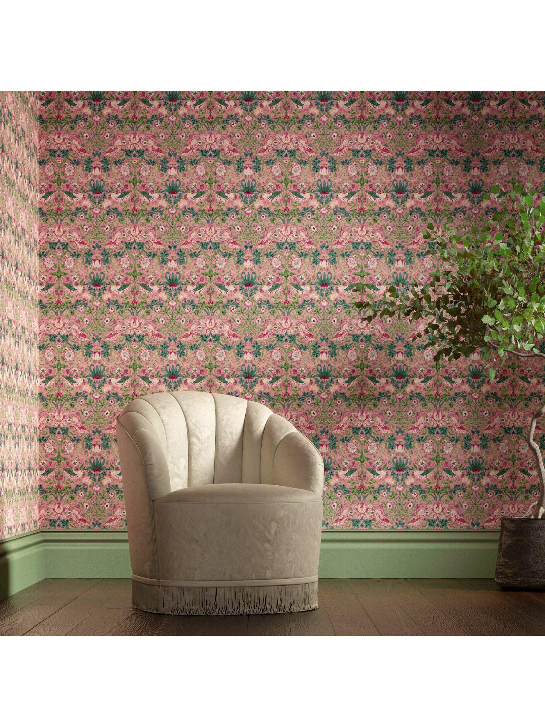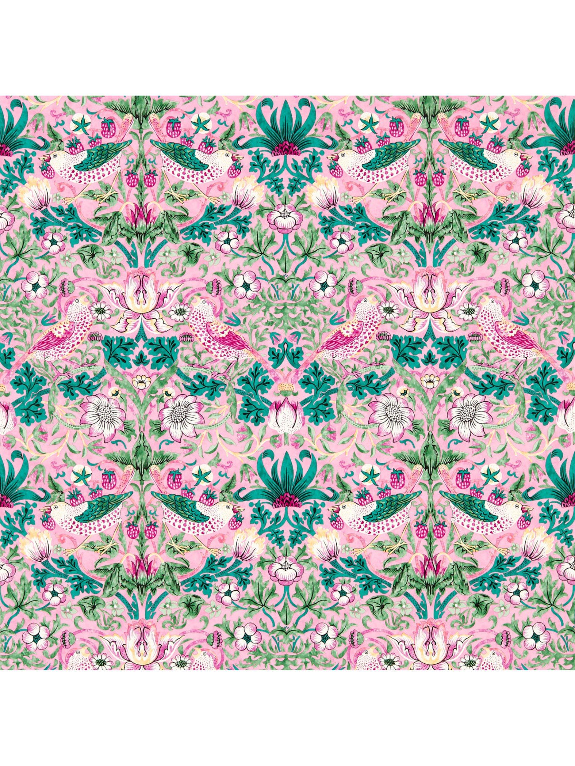 William Morris's 1883 classic pattern, Strawberry Thief, makes off with our hearts in this adventurous colourway. A striking Arts & Crafts pattern emerging riotously from a dark ground. There's always sweet pinks and teasing teals, on the other hand, to lend a lighter touch to interior spaces with this wallpaper, made in the UK.