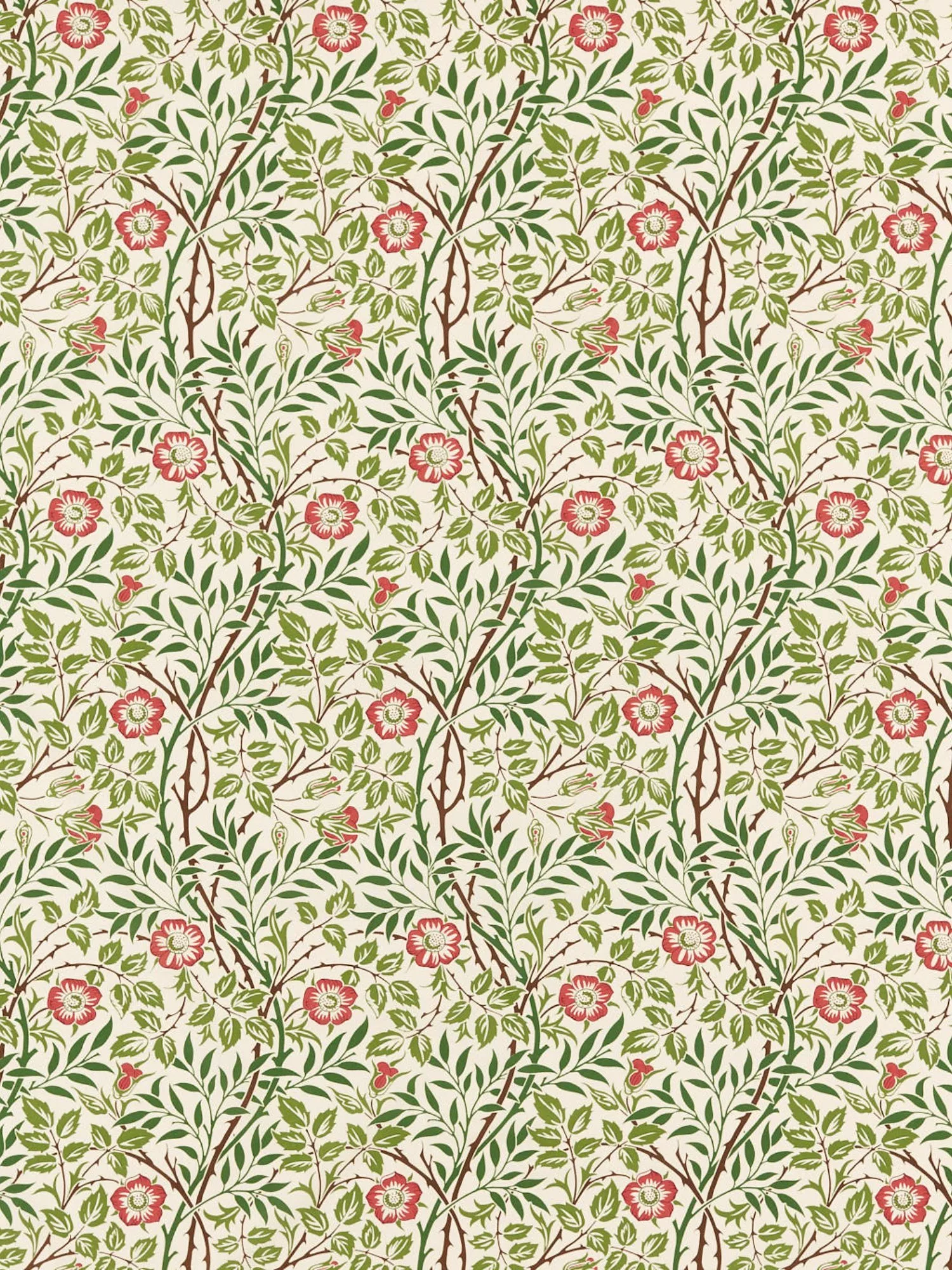 Always recognising that true beauty has its thorns, J.H. Dearle designed Sweet Briar in 1912. Depicting the small rose heads flowering pleasantly amongst the barbed stems, this is the tender yet honest view of nature that characterised the Morris & Co. output under Dearle and Morris.