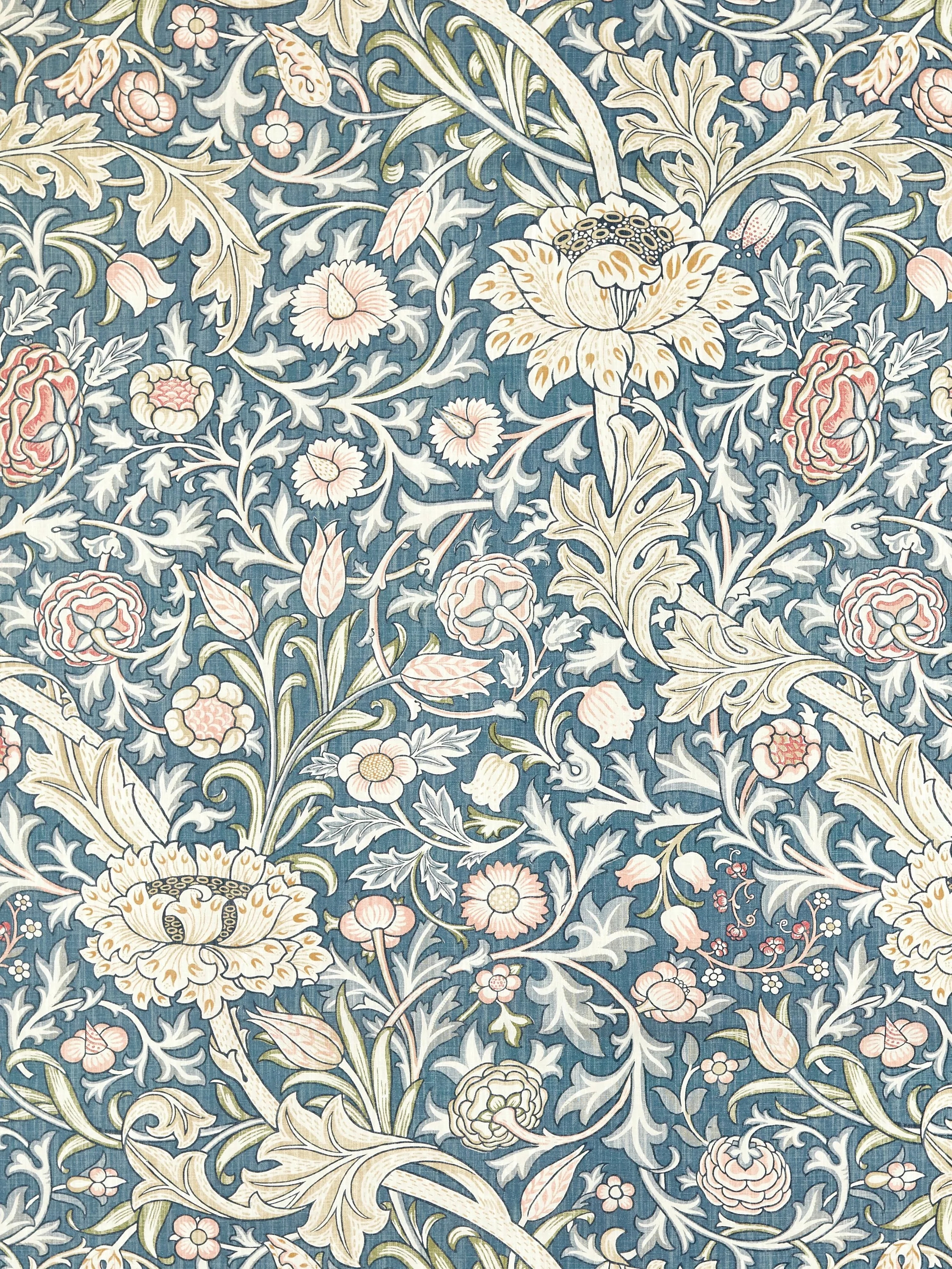 Trent, which began life in 1888 with the grand accolade of being Morris & Co.'s most expensive printed textile, is a rich, vibrant floral display. This luscious pattern features curving tulips and meandering acanthus leaves amongst other stalwarts of English gardens. Trent seamlessly imagines two of William Morris's guiding design principles; ensnare the eye with sprawling repeats and beguile with masterfully rendered motifs.