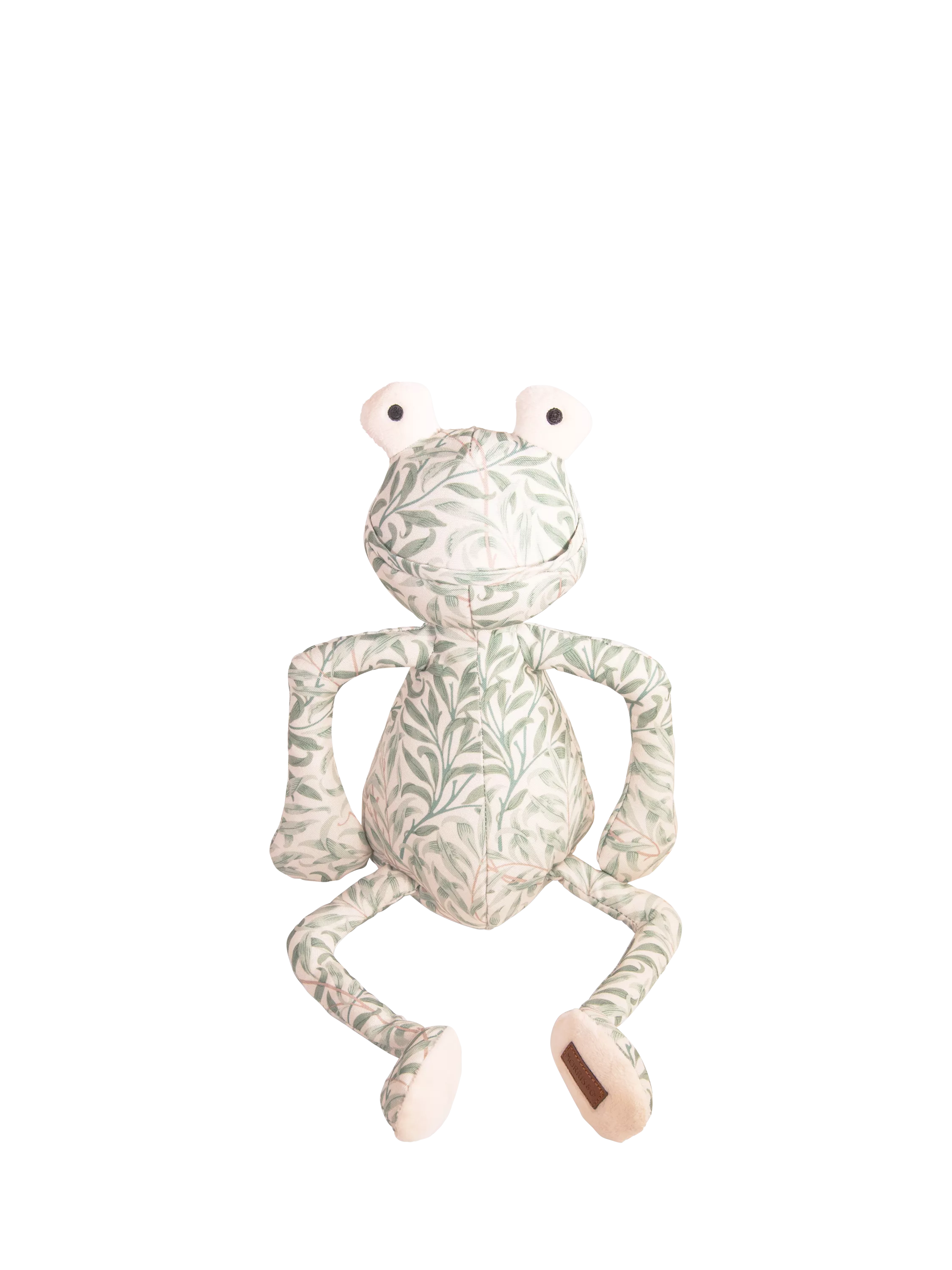 The Morris & Co. Willow Boughs Frog Dog Toy features durable printed canvas with a reinforced lining and extra seam binding for added durability. The elegant Willow Boughs print highlights timeless craftsmanship and unique details. Its long arms and legs make it easy for dogs to carry and perfect for play.